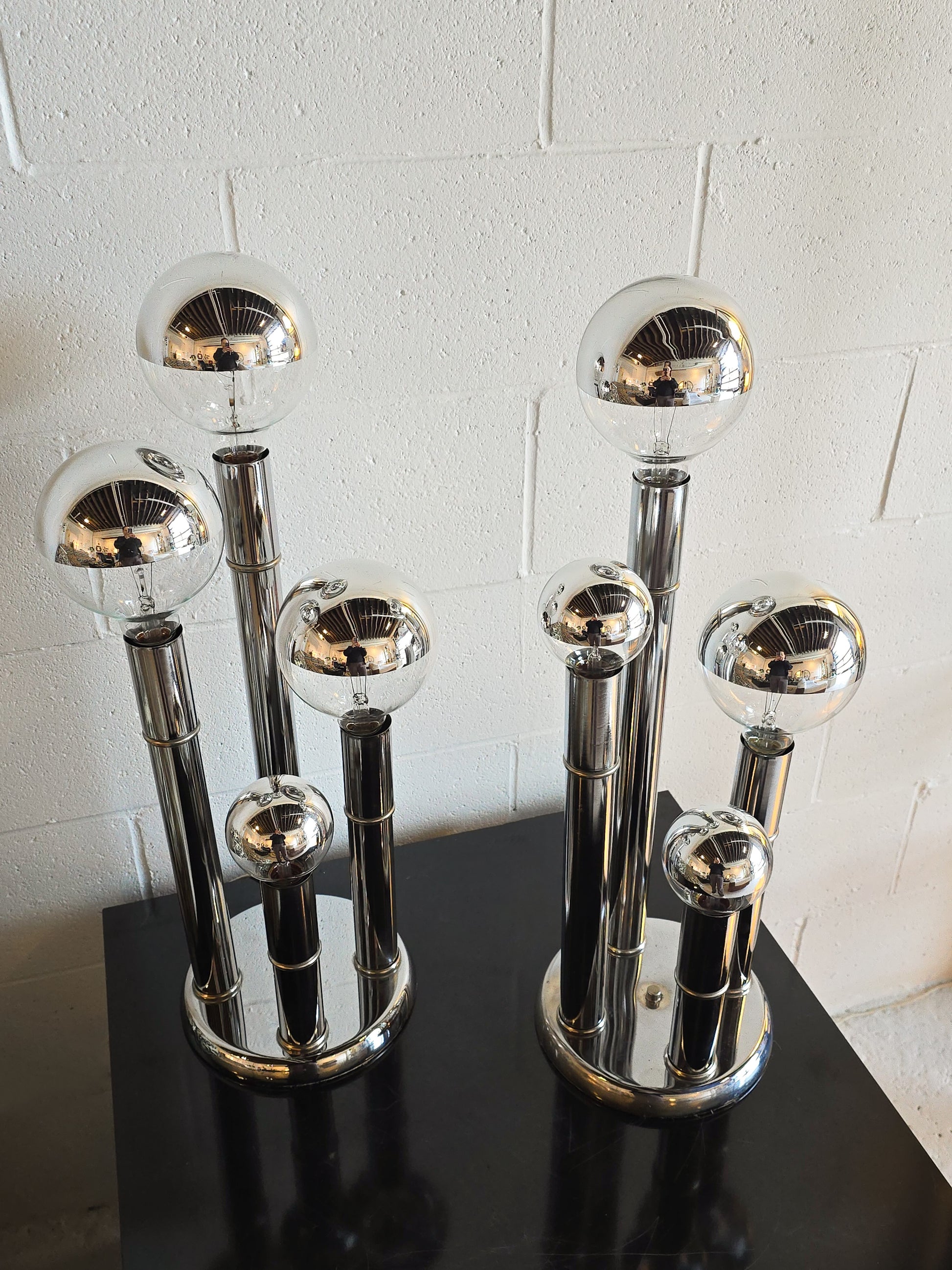 Stunning pair of 1970s four tier chrome featuring half mirrored bulbs ranging in size. In great vintage condition with some signs of wear, expected with age. One lamp has two smaller bulbs, which can be changed.