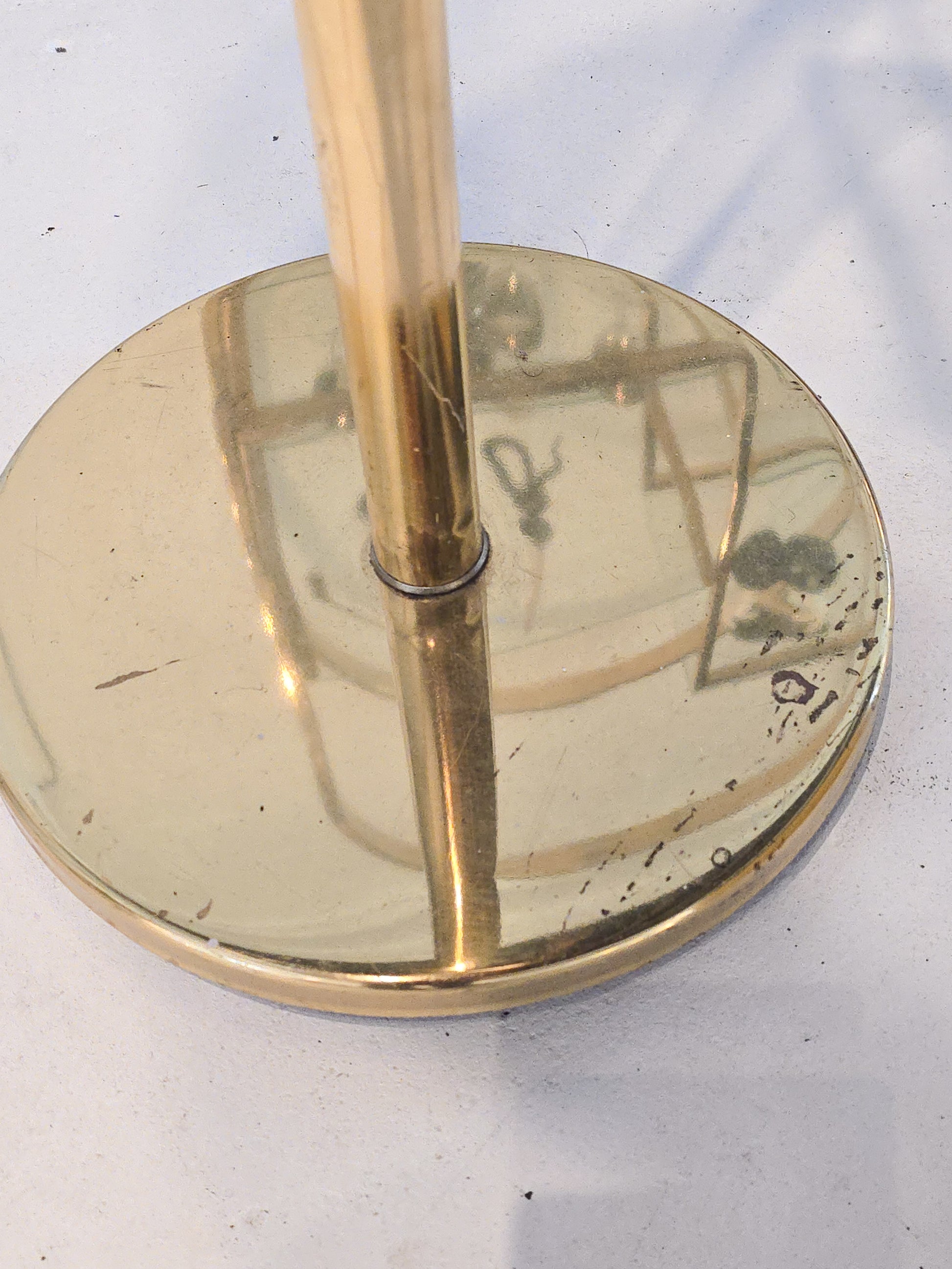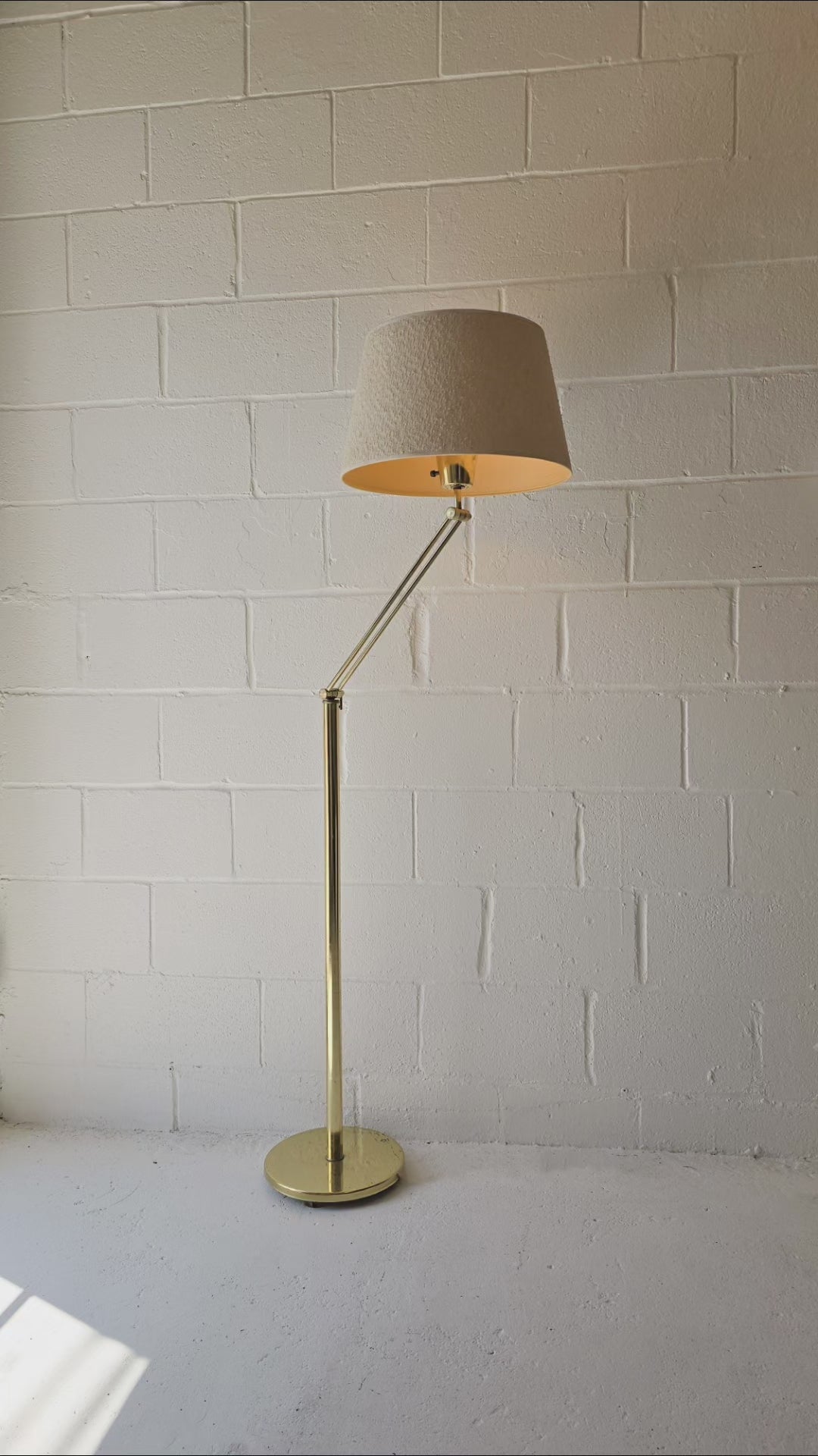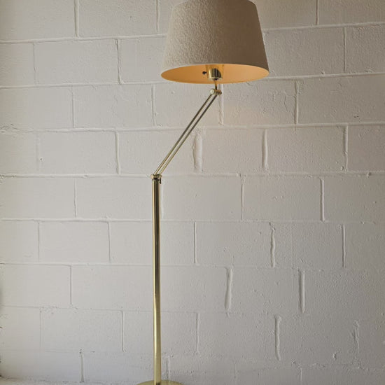 Adjustable brass floor lamp with an beige fabric shade. This lovely floor lamp is adjustable in two points and can be adjusted to the desired position. Its the perfect adjustable lamp that can be used for multiple purposes. In overall good vintage condition, wear on brass particularly on the base of the lamp.