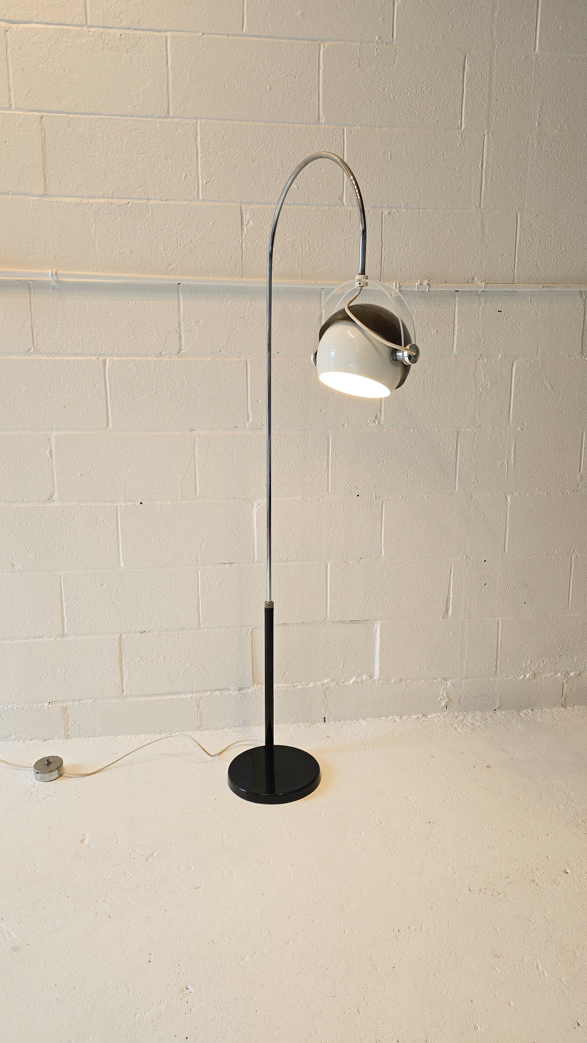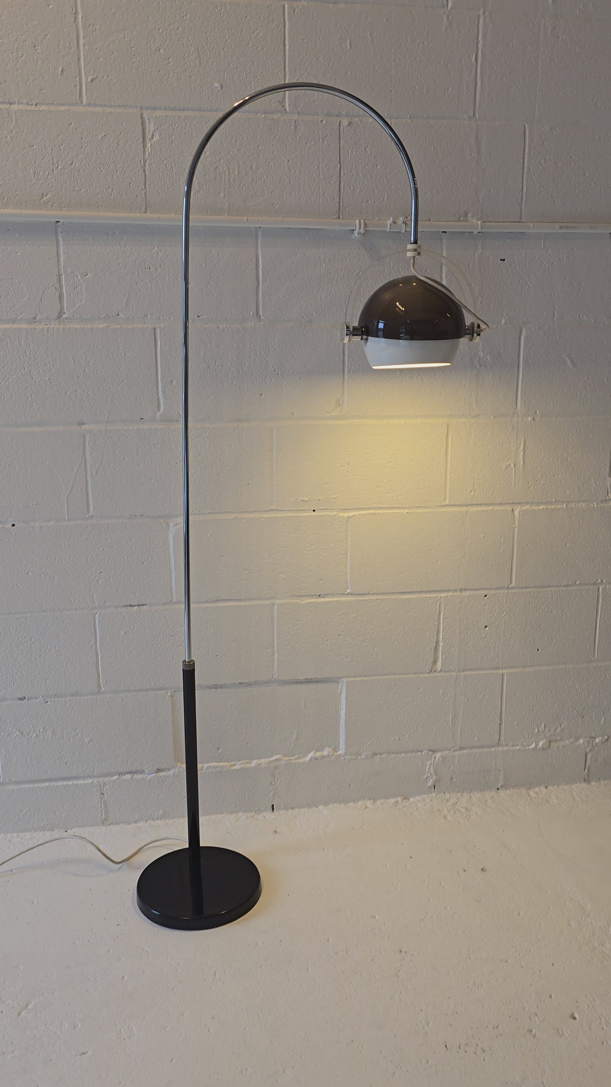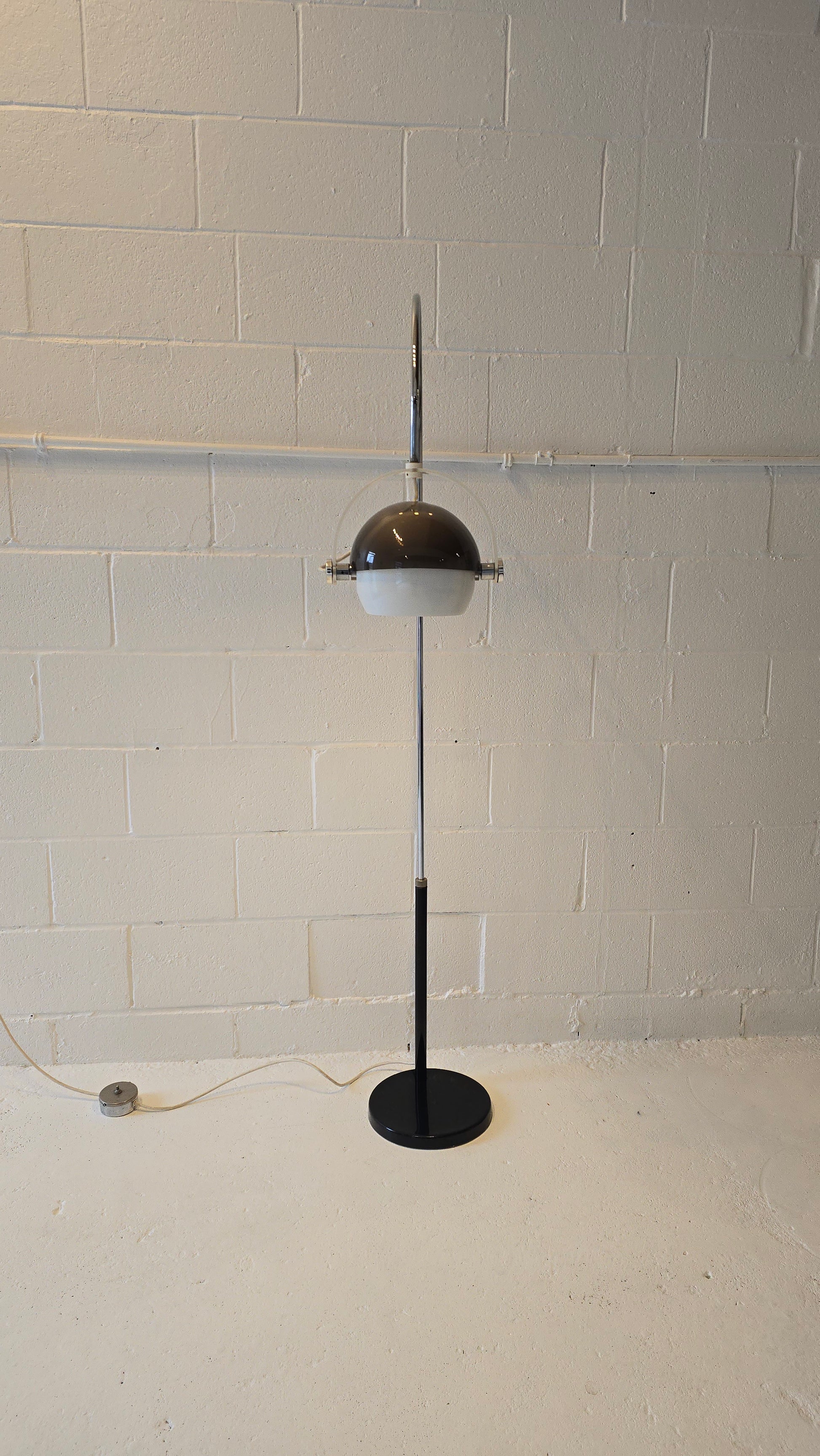 Stunning arch floor lamp featuring a lacquered black base, chrome arch and a mixture of metal, acrylic and lucite shade. The shade is adjustable and can be moved into desired position. The chrome arch can be moved and adjusted. The height can be slightly adjusted.