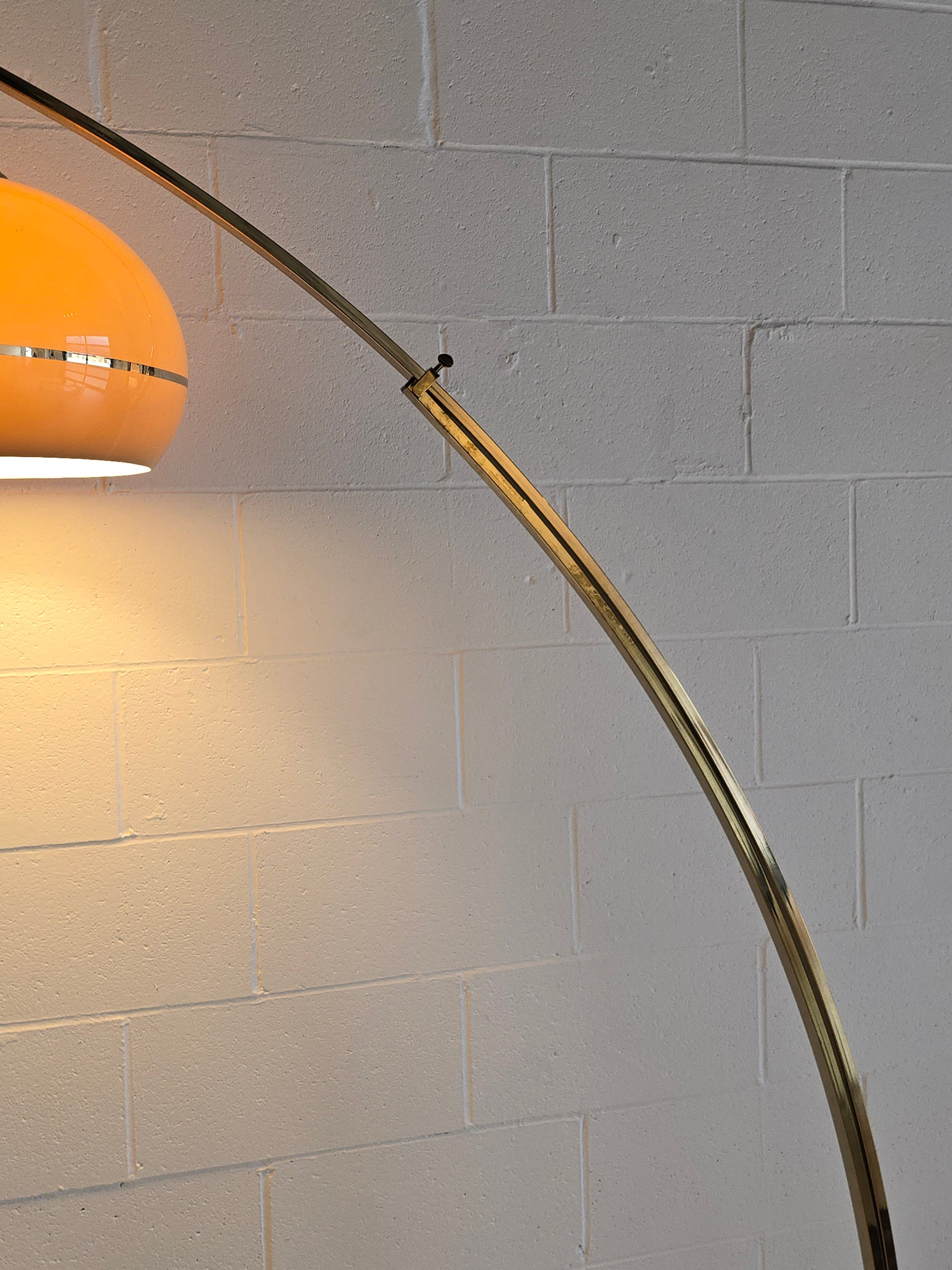 Stunning Brass adjustable arc floor lamp with an acrylic shade. It was made in Canada in the 1970s. The arc is adjustable, which makes it the perfect lamp for both small and large spaces. In great vintage condition with some minor signs of wear which is expected with age.