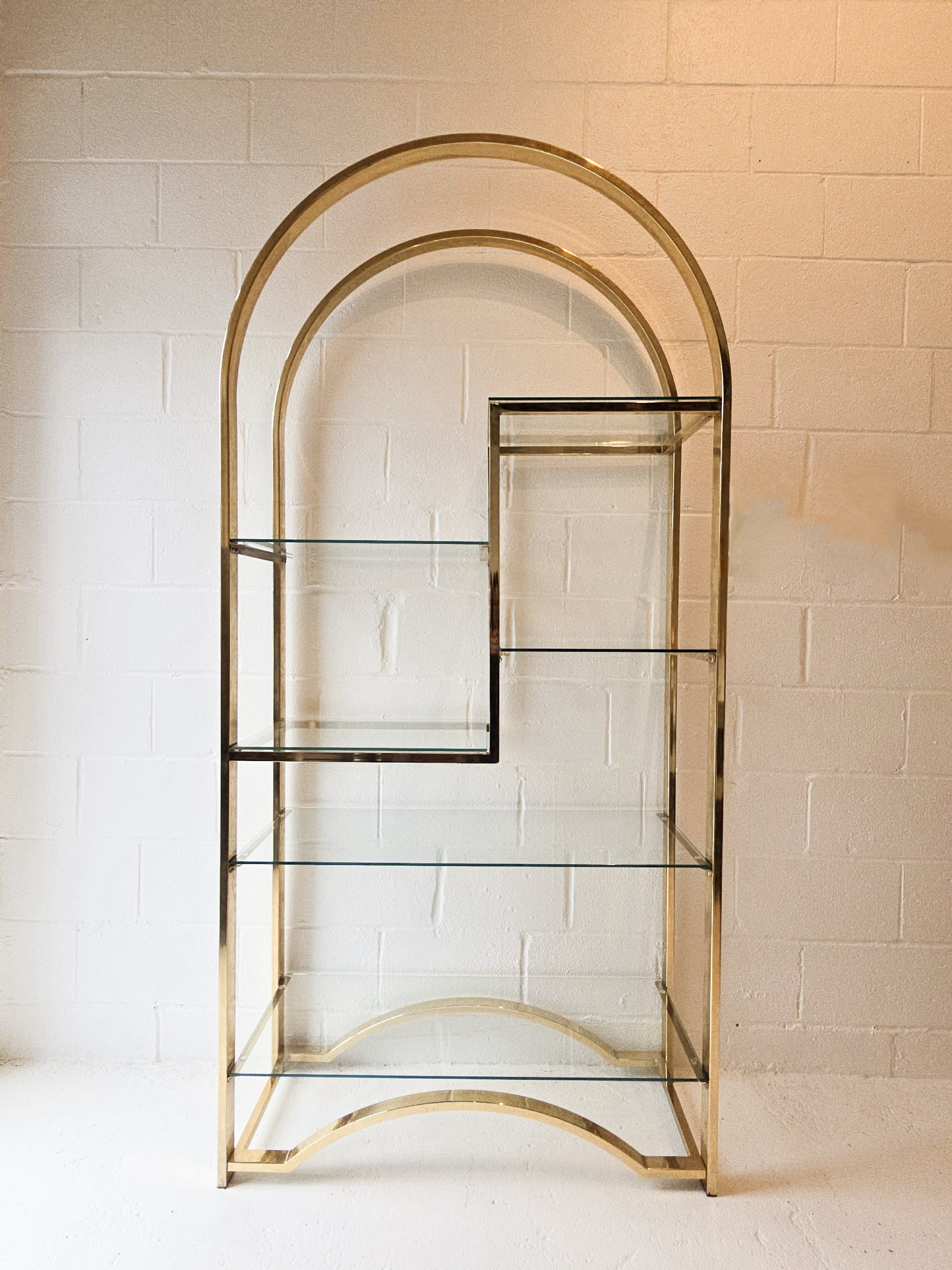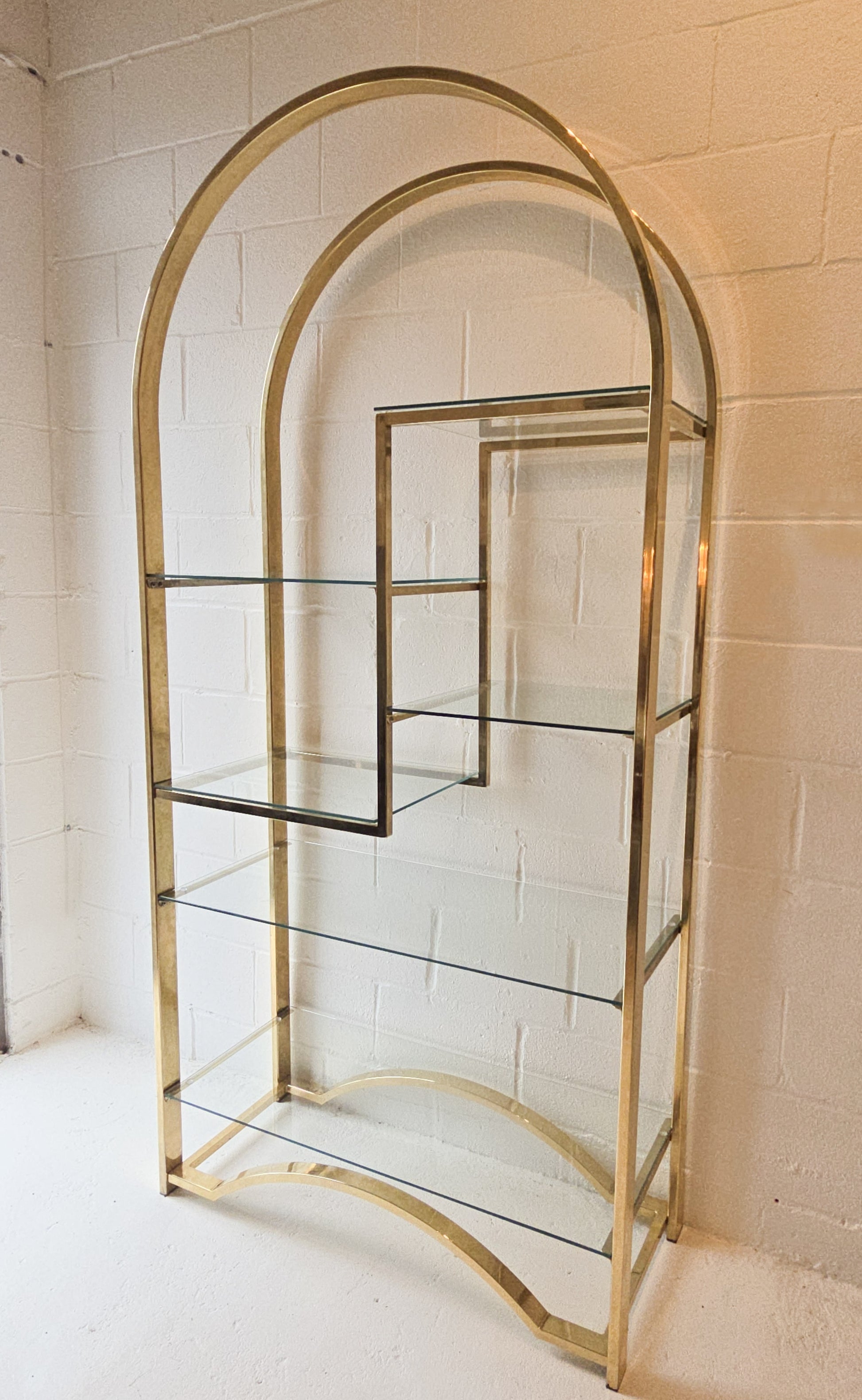 Stunning Vintage Arch Brass and Glass Etagere. It features six shelves in varying sizes, making it perfect for displaying decorative pieces, glassware, books, and more. In great vintage condition, some signs of wear as expected with age.