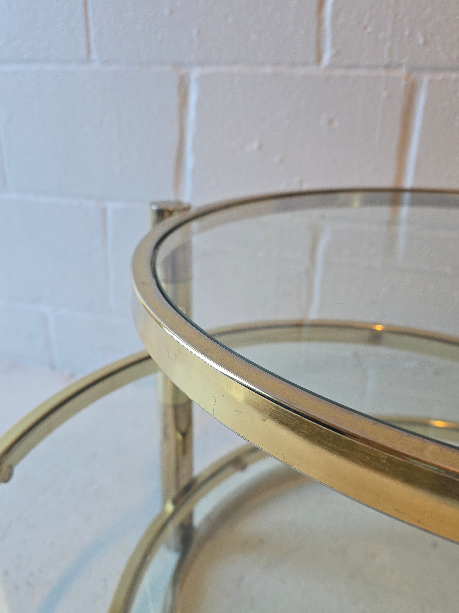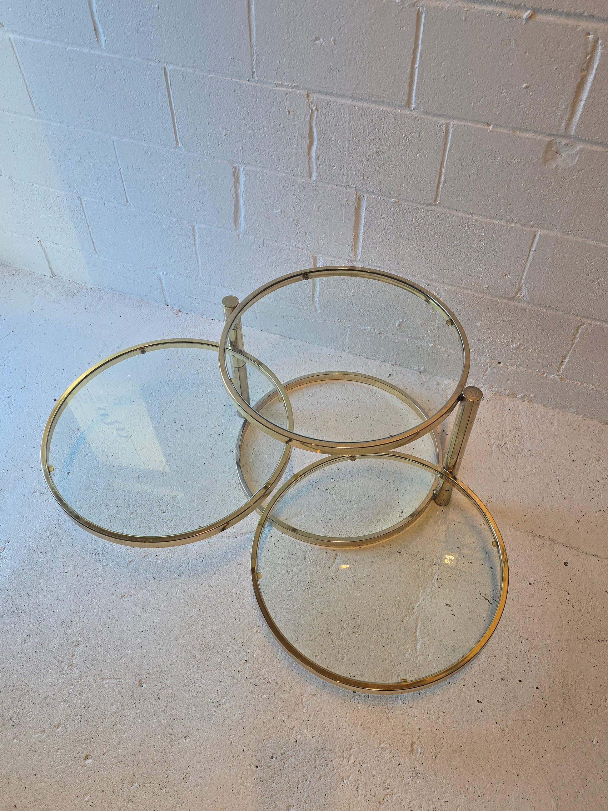 Gorgeous brass & glass swivel coffee table. The middle two shelves swivel in and out, perfect for small spaces! It’s in overall good vintage condition with some wear on brass and glass.