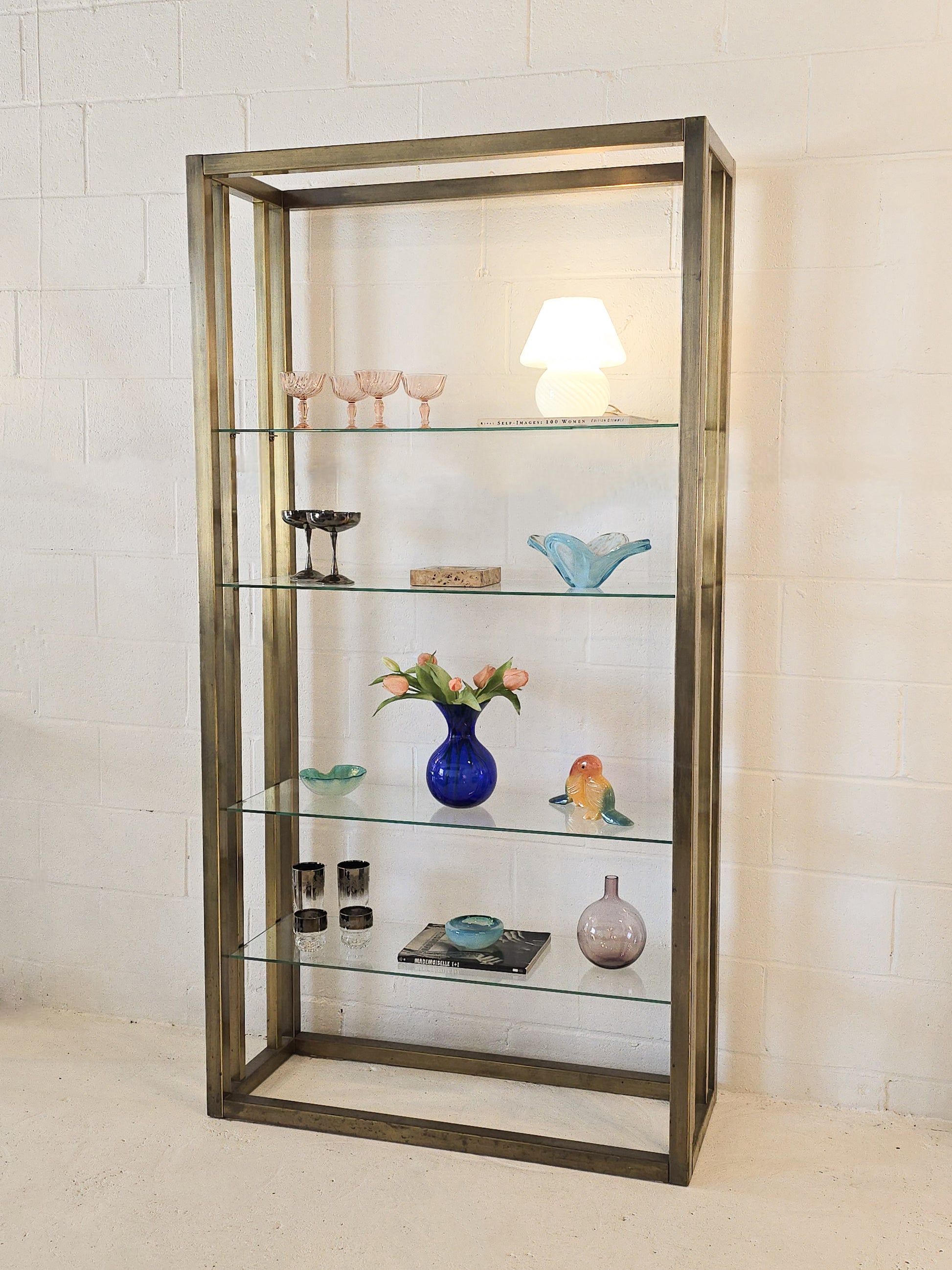 Brushed brass and glass etagere. This beauty features five floating glass shelves with varying spacing in between. In great vintage condition, the brushed brass has some signs of wear. The glass shelves are newly custom cut. Its a heavy piece and structurally sturdy.