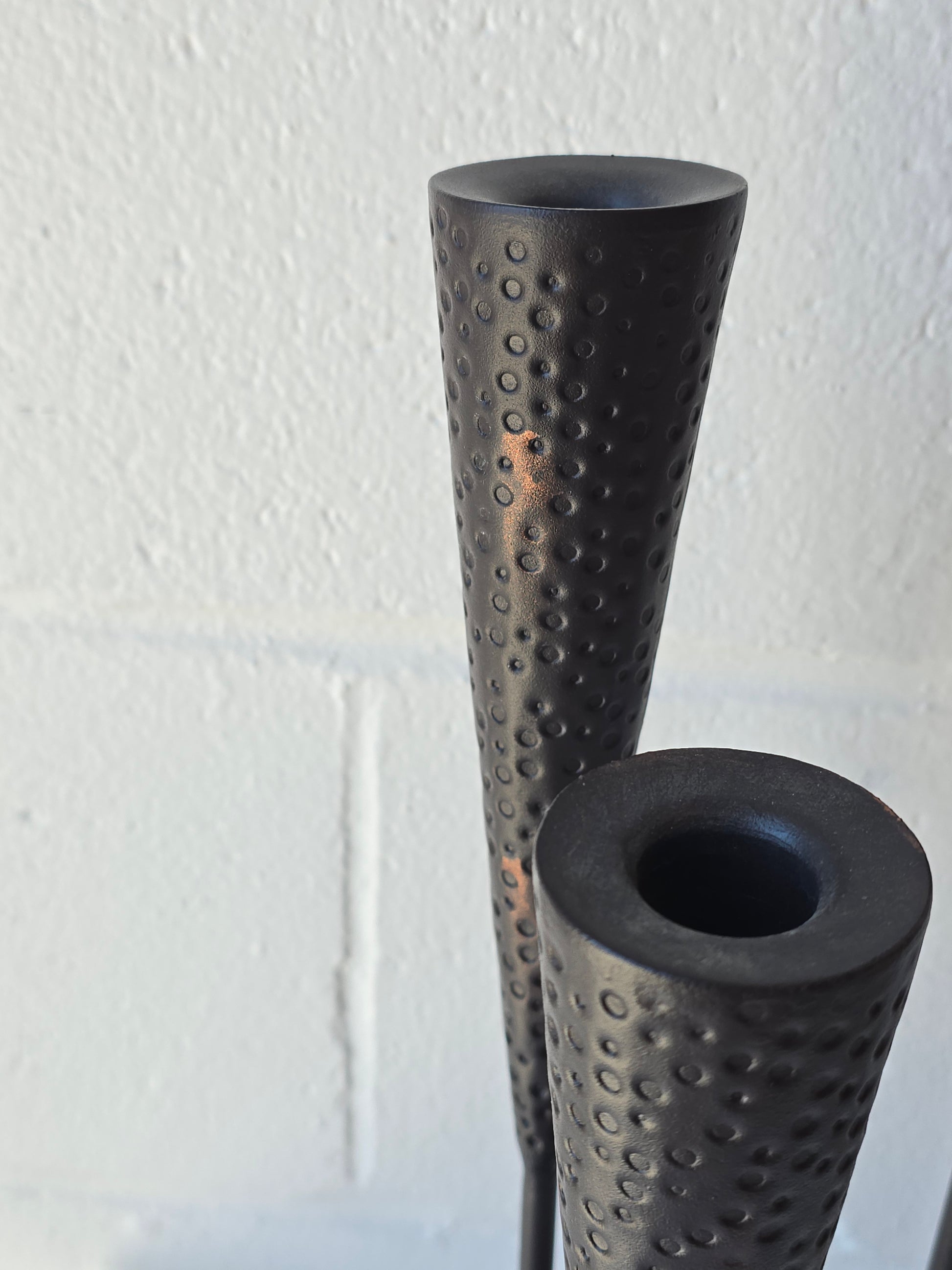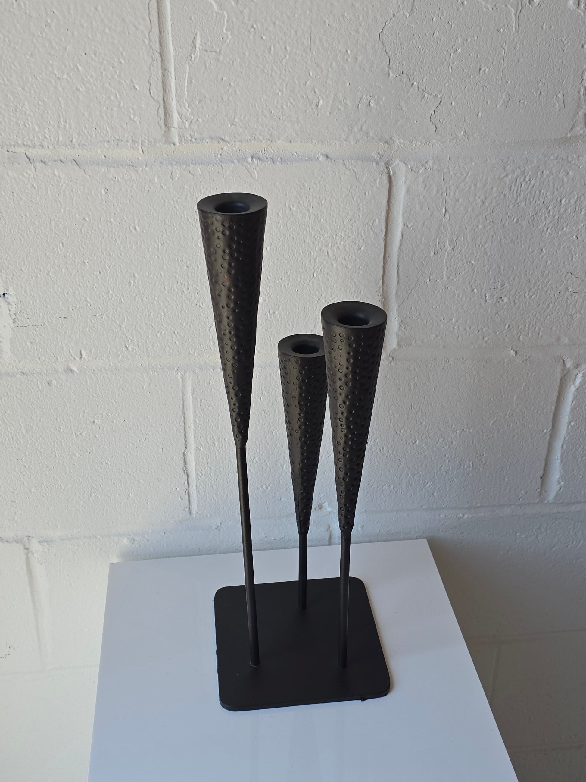 Large iron candelabra featuring three rods that are connected to the square base. The three rods each feature a conical semi closed top to place candles in. The conical top has a hammered texture. Its a unique and striking design that would be a perfect candle holder or as can used as is for decor. Its finished in a dark brown. In overall good condition with some signs of wear such as colour fading/wear.