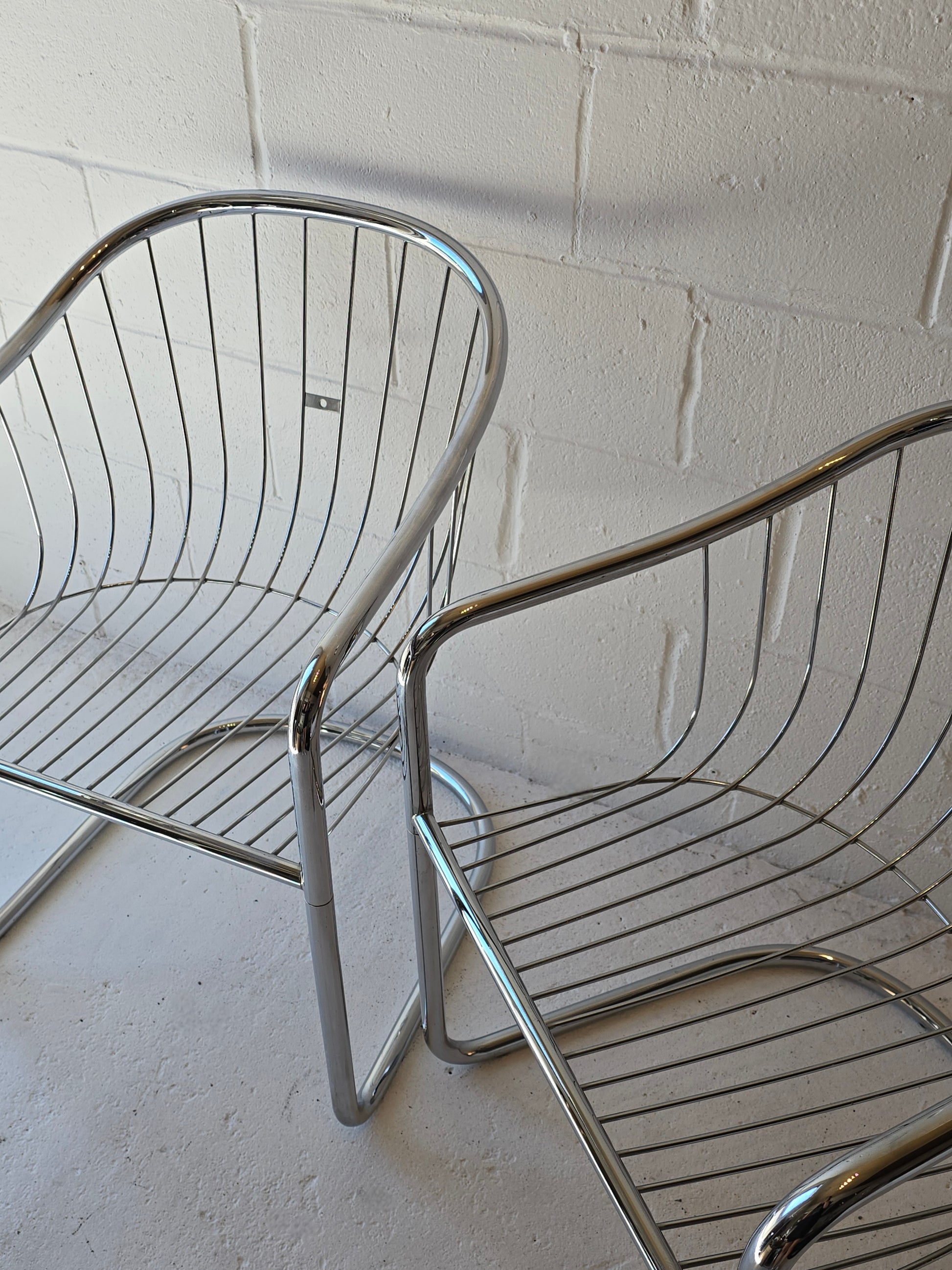 Cantilevered chrome chairs by Gastone Rinaldi. These chrome chairs can be used as dining, accent, or lounge chairs. They feature a wire chrome seating, tubular frame and armrests. They came with original upholstery which have a lot of wear and some tear therefore they are being sold without the cushions. We have opted to not have the cushions premade to give buyer freedom to choose whether they want reupholstery and to choose their own fabric colour. Please note the cushions in the photo is presented as an example (it has wear and tear). They are priced WITHOUT the cushions, reupholstery will be an EXTRA cost, not included in the price. Sold as a pair. We are open to selling individually if multiple people are interested.