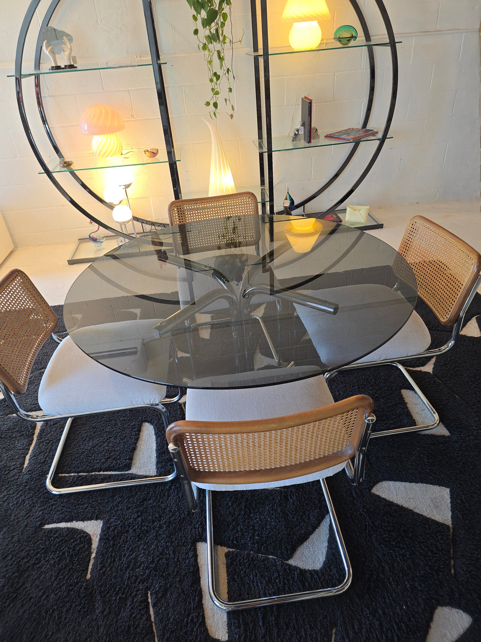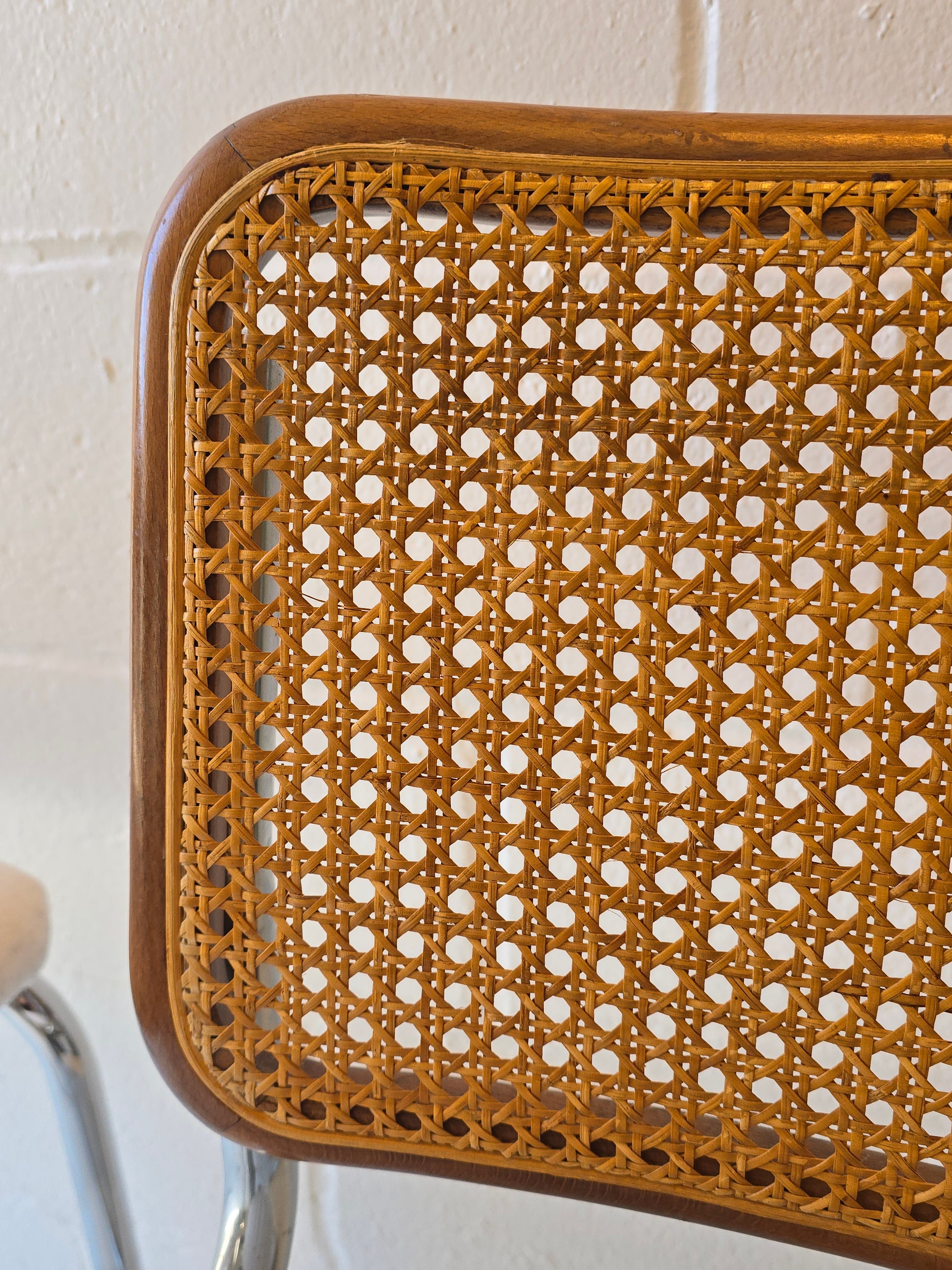 A wonderful set of four Cesca chairs, made in Italy. The backrest is handwoven caning and the seats feature fresh and new reupholstery. This set is very well made, the wood is dense, the caning is handwoven, the chrome is carefully crafted which is evident from the placement of screws, (no bending of steel where the screws are placed), the weaving has the age appropriate amber colour. However, the end caps are not seamlessly welded into the frame which is what leads us to the conclusion that these are very very well made reproductions of the Cesca chairs. Therefore priced as such. Sold as a pair or set of four.