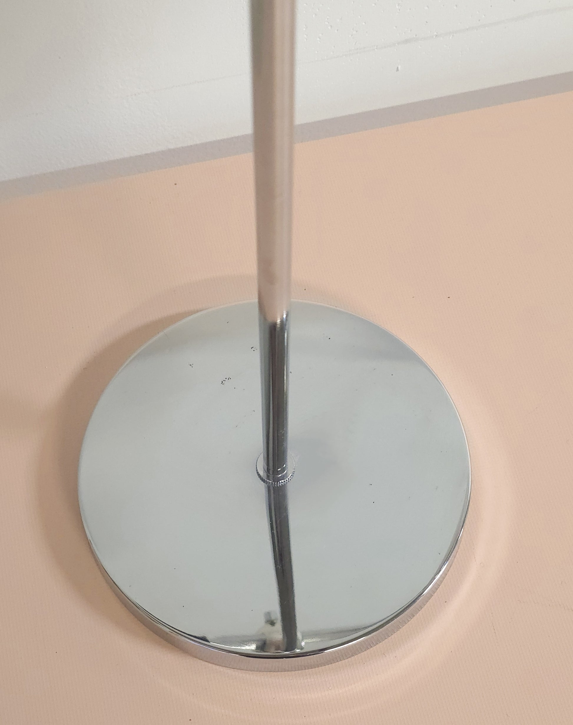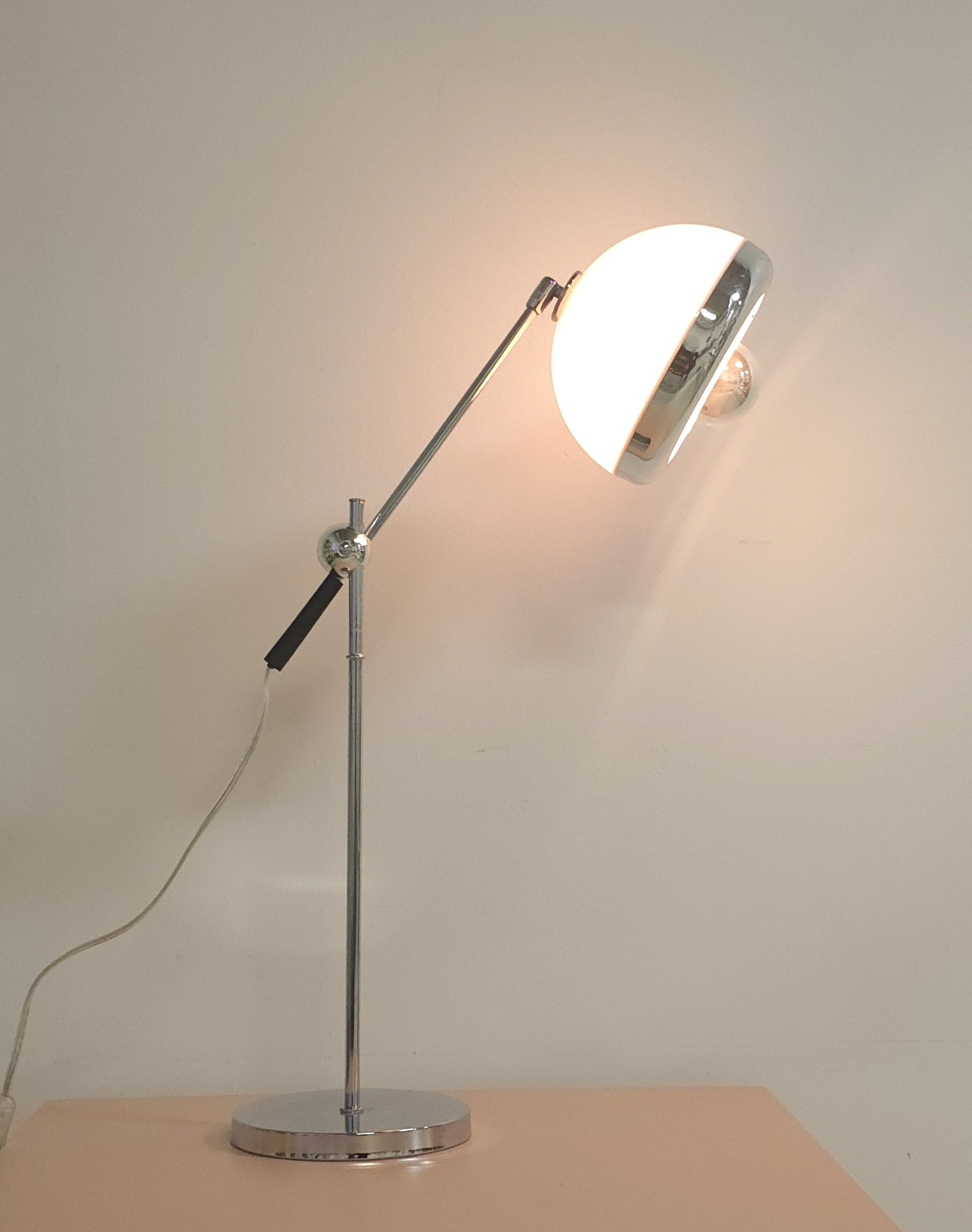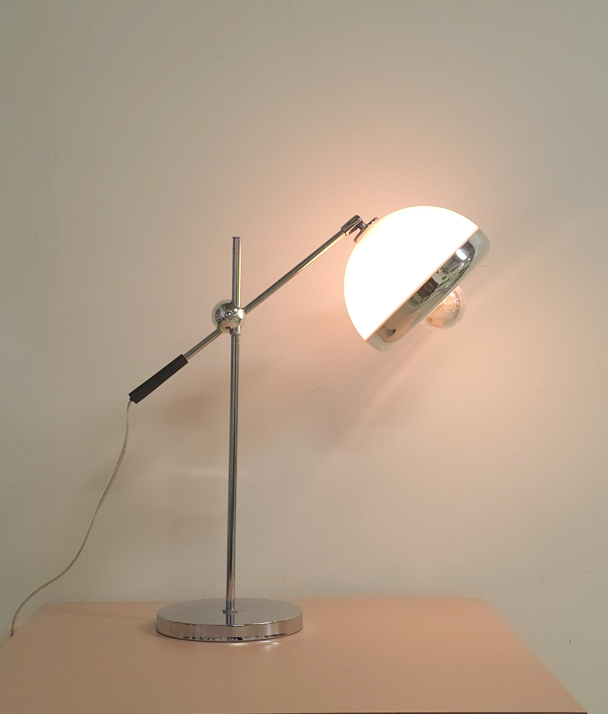 Lovely adjustable chrome table lamp. This lamp is perfect as a table and desk lamp as it's adjustable to the desired height and width. The body is chrome, while the shade is acrylic/plastic finished in white with a chrome/silver edges. In great condition with some minor signs of wear.