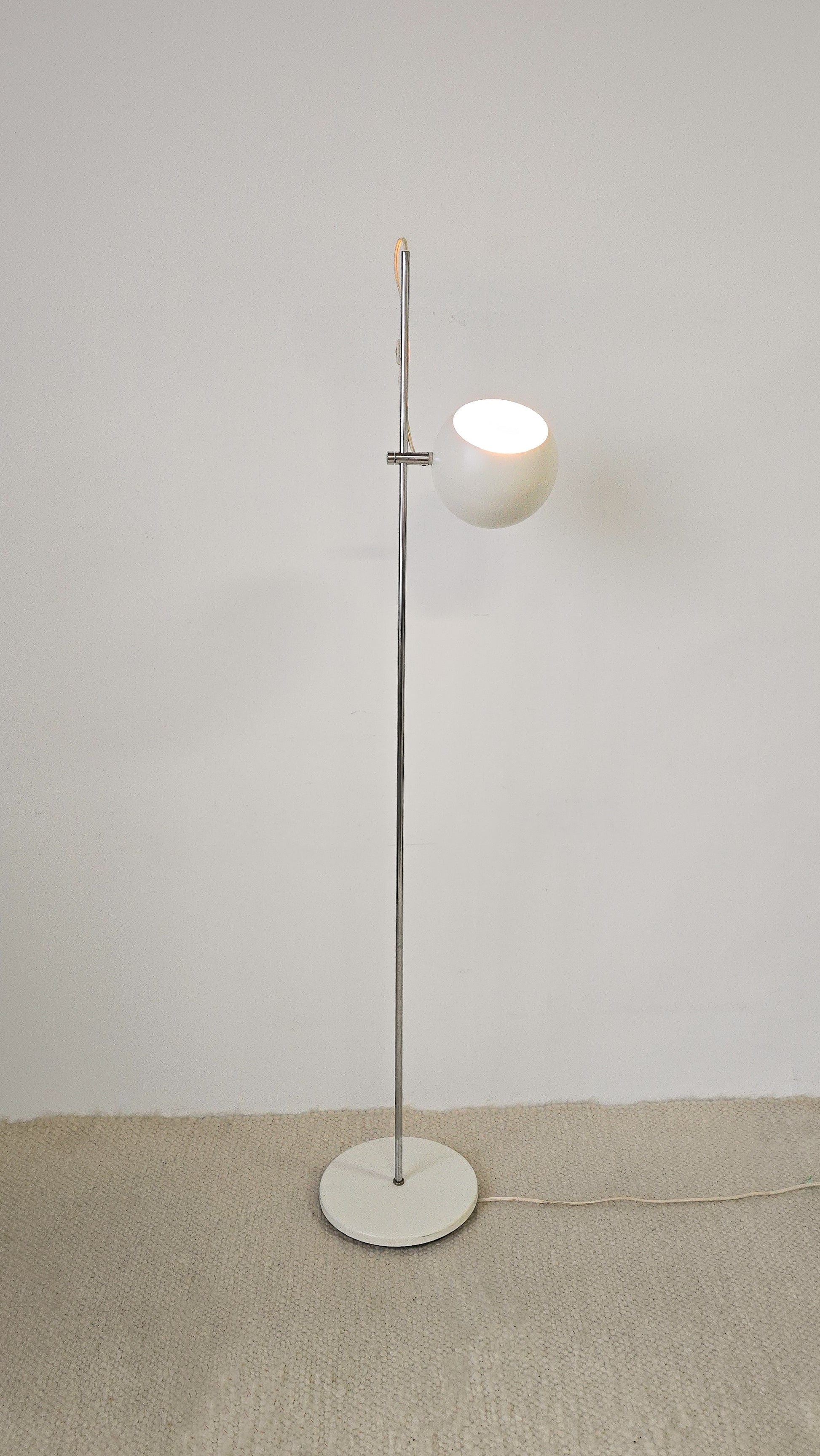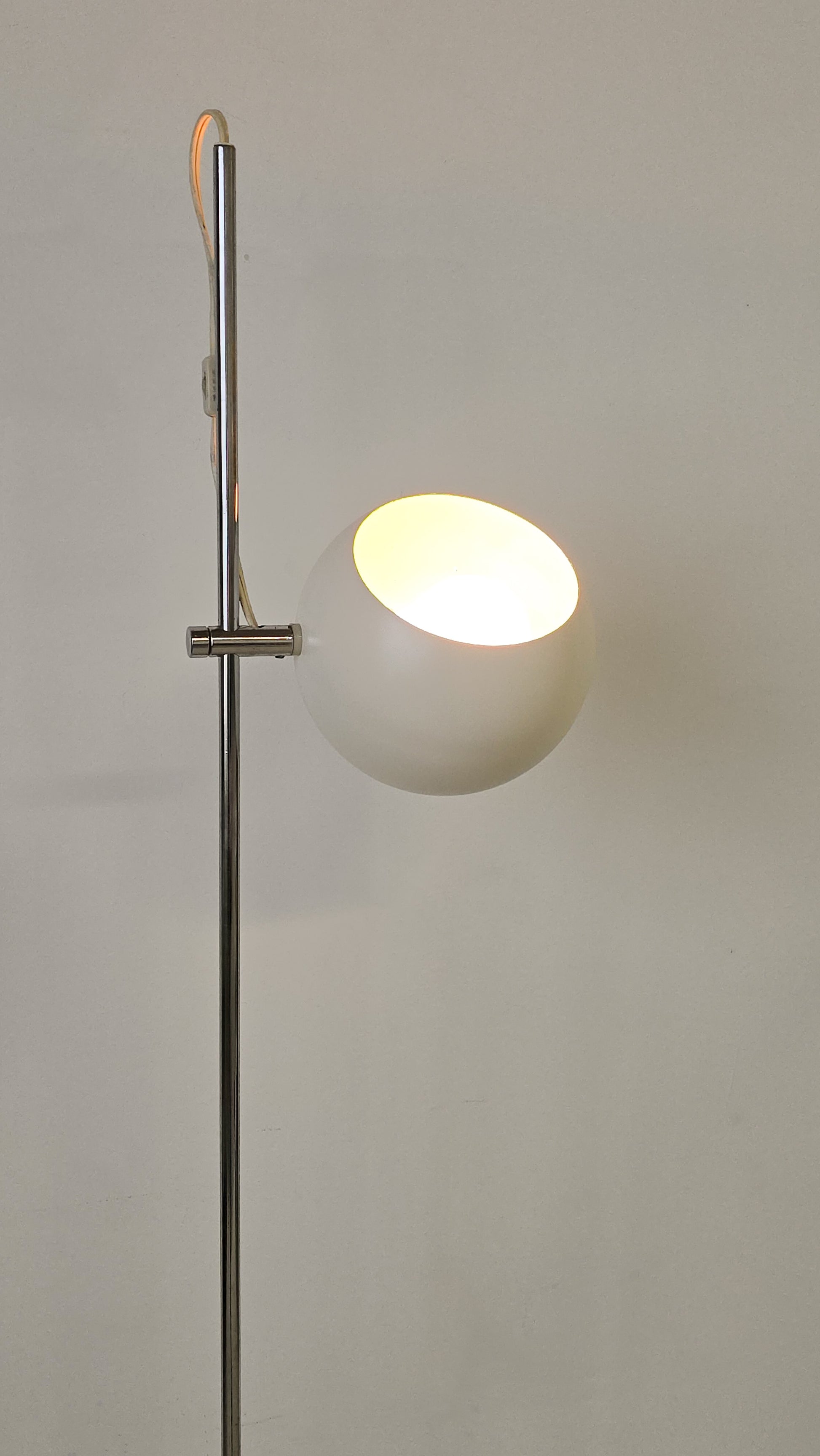 Chrome floor lamp finished in a satin white shade and base. The shade can be adjusted to the desired height. In overall great cindition, some minor signs of wear.