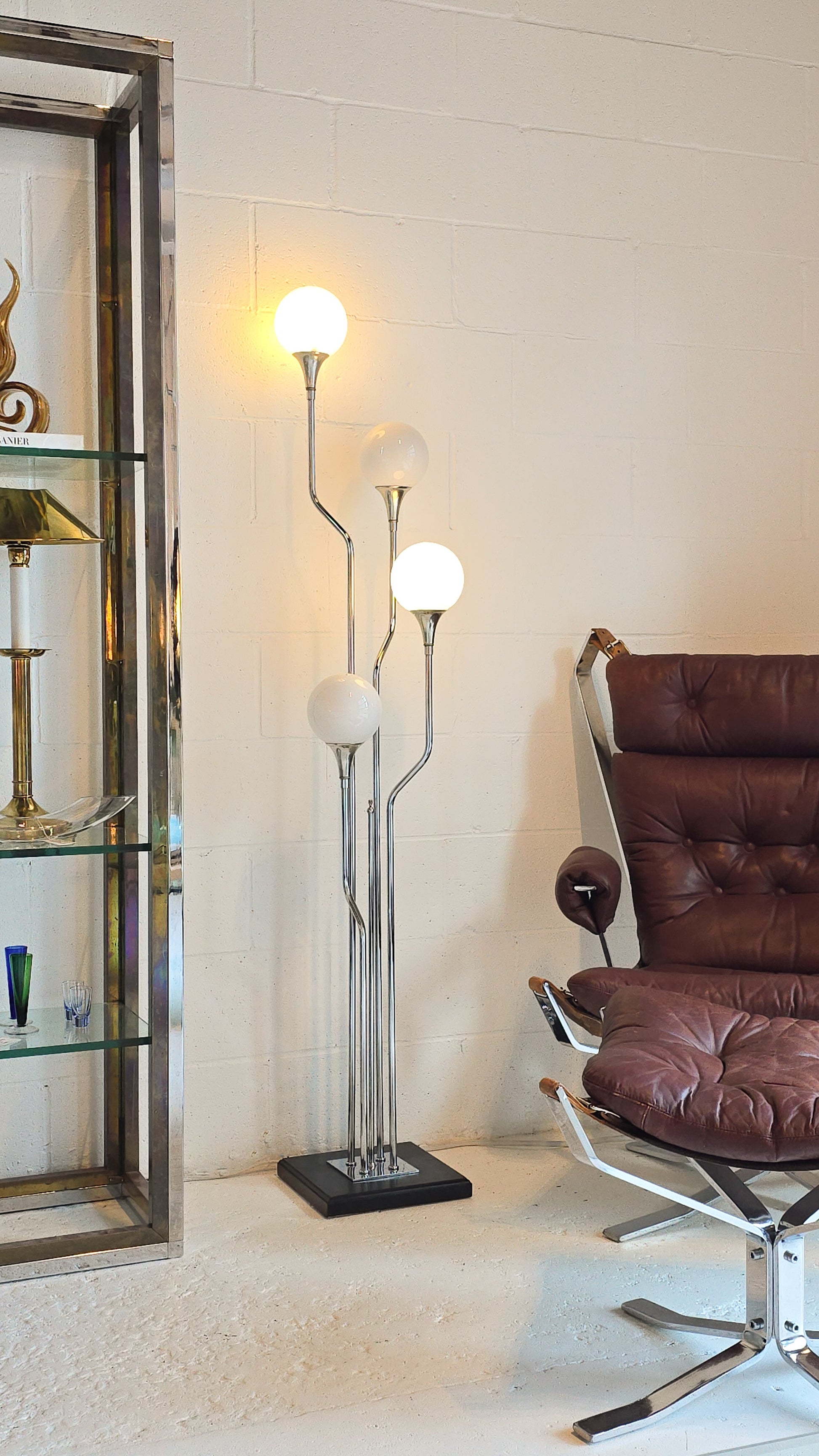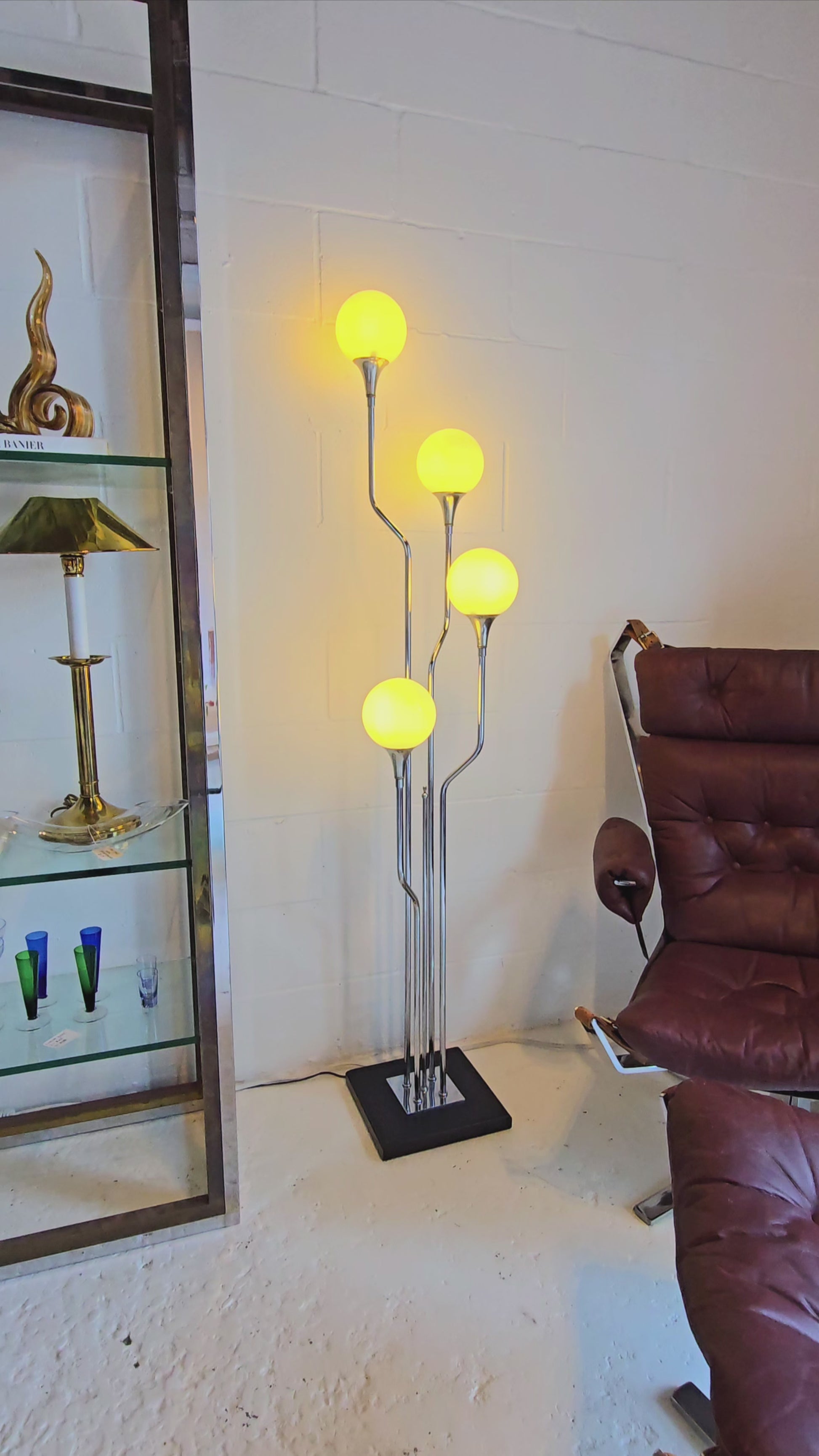 Stunning four tier chrome and glass globe floor lamp in the manner of Reggiani. This floor lamp features four tiers with milk glass globes, chrome body, and a wooden base. It has three light switch. It's in excellent condition.
