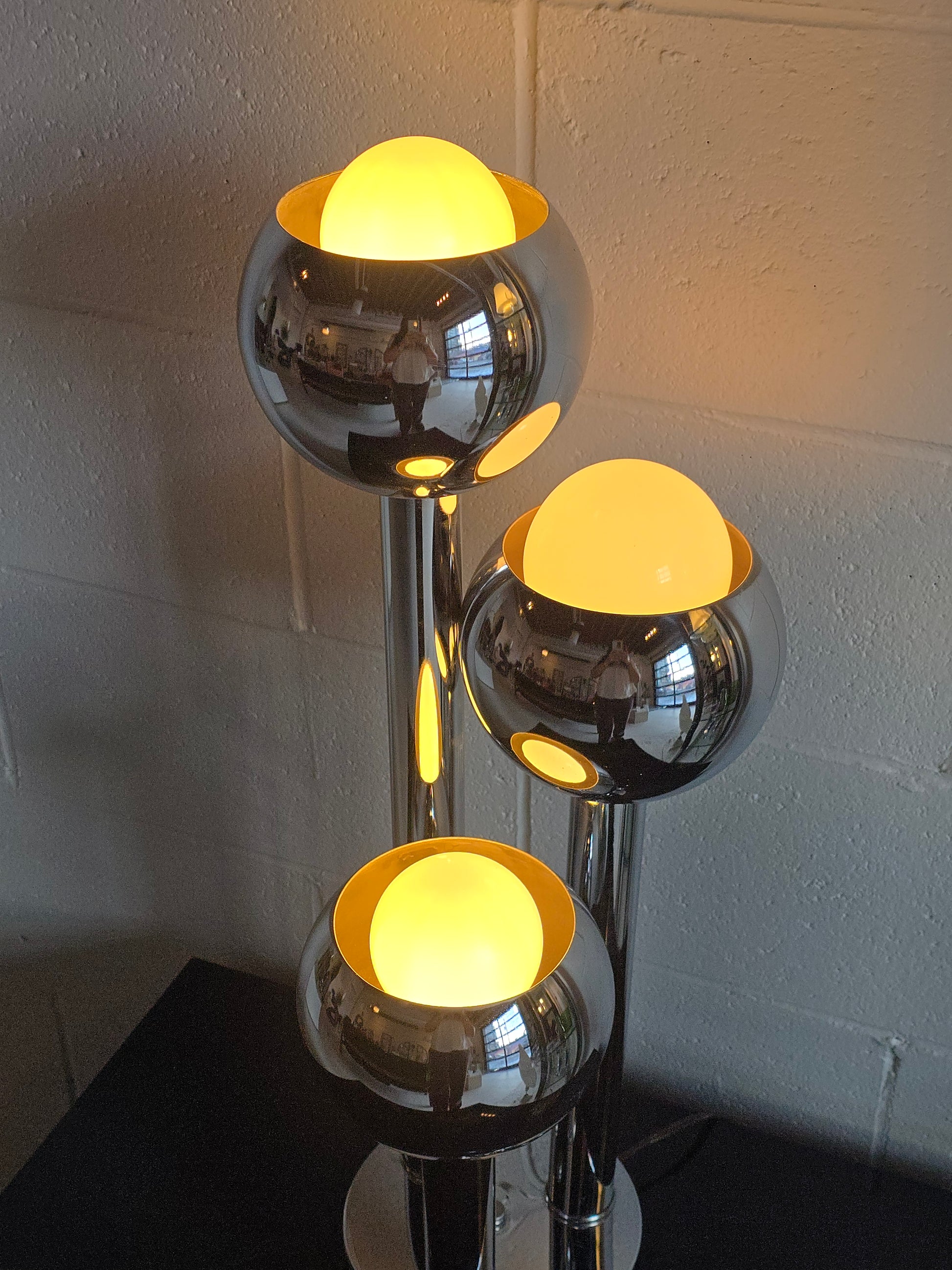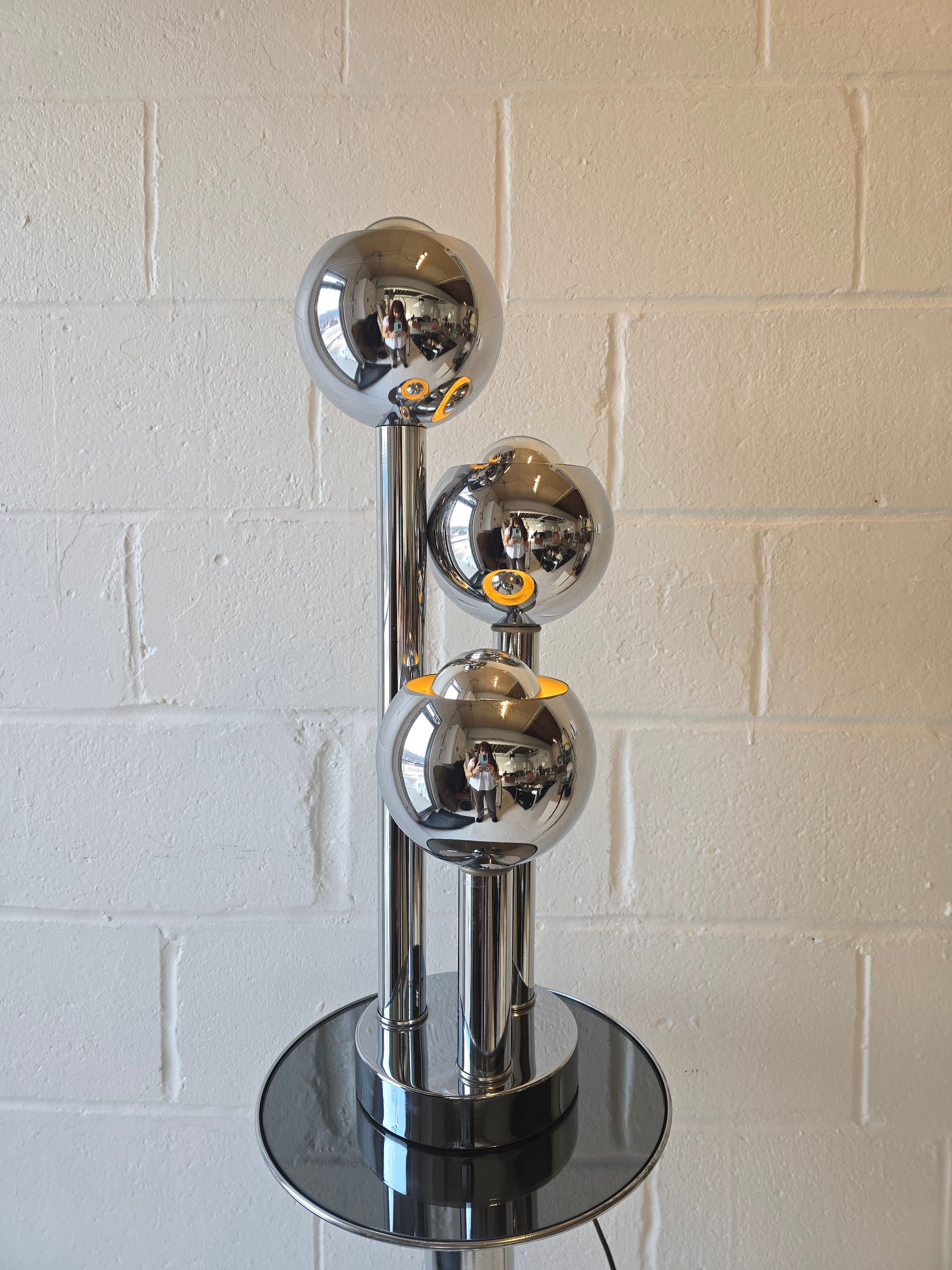 Space age style chrome table lamp with three globes. It was made in the 1970s. It features three tiers in varying heights. It’s a perfect lighting addition to any style of home. In good vintage condition with some signs of wear on the chrome. Can be styled with a chrome pedestal to make it a taller, floor lamp. Chrome pedestal also available for purchase. Bulbs are not included. (Can be included, please inquire)