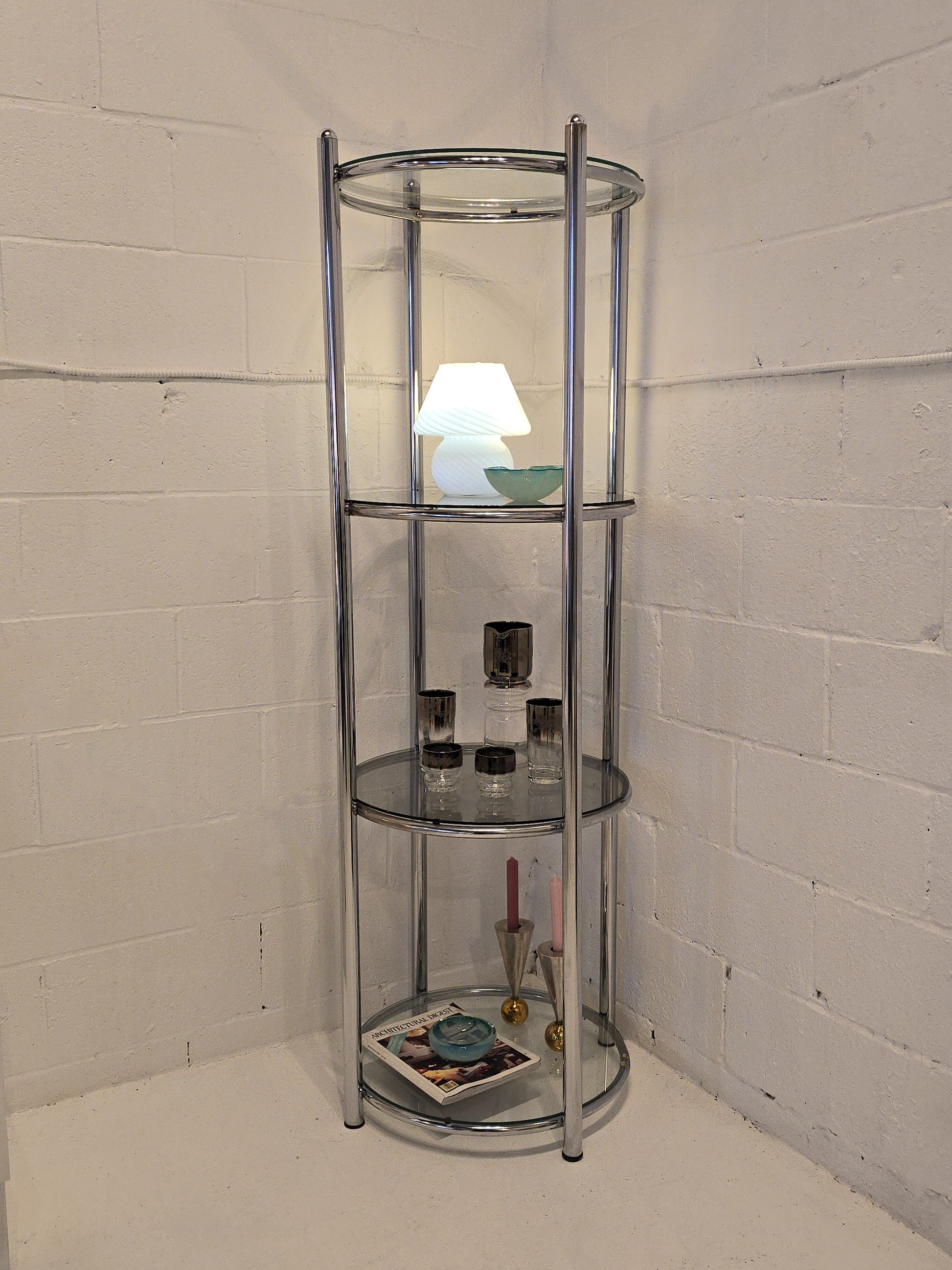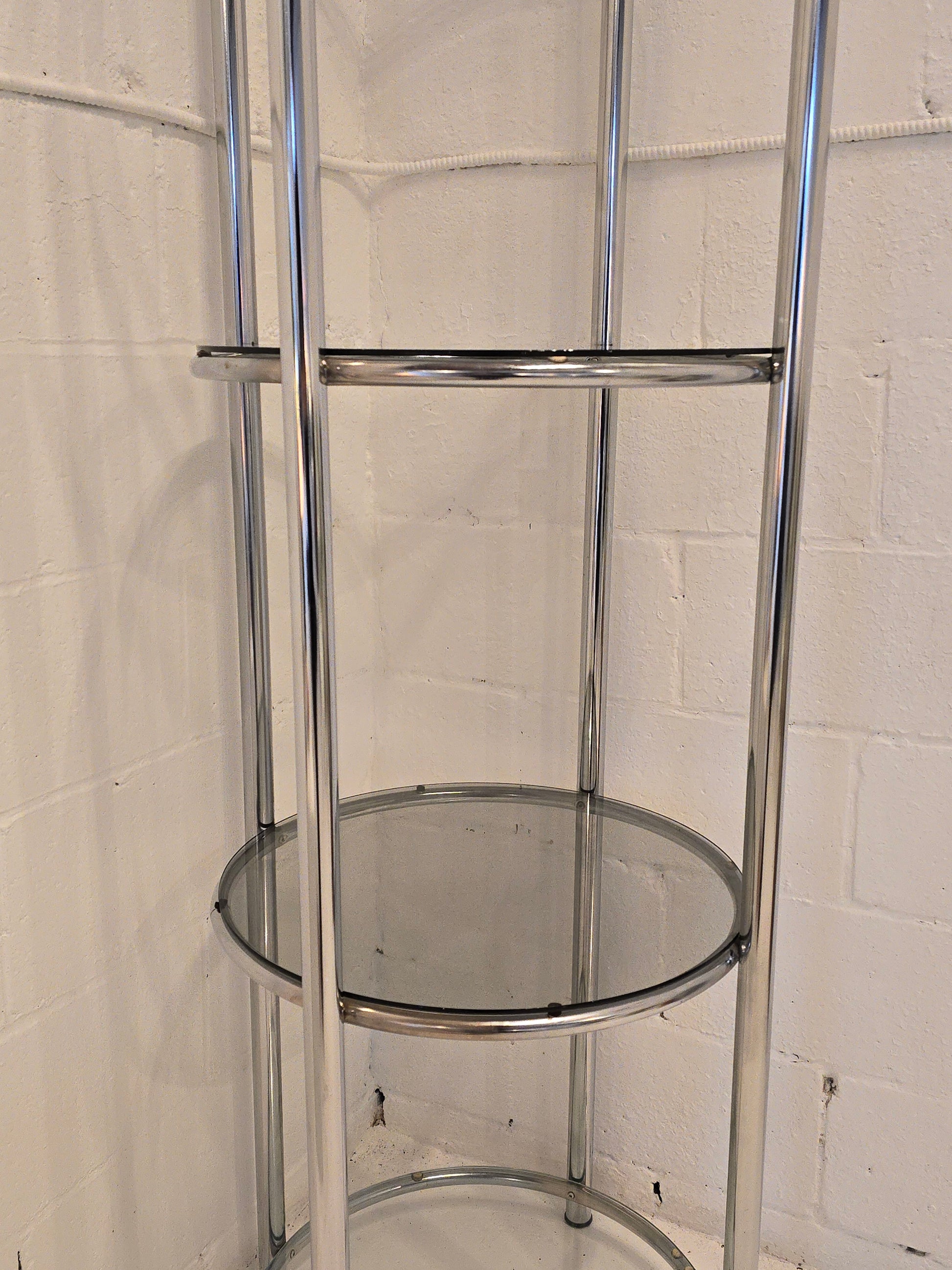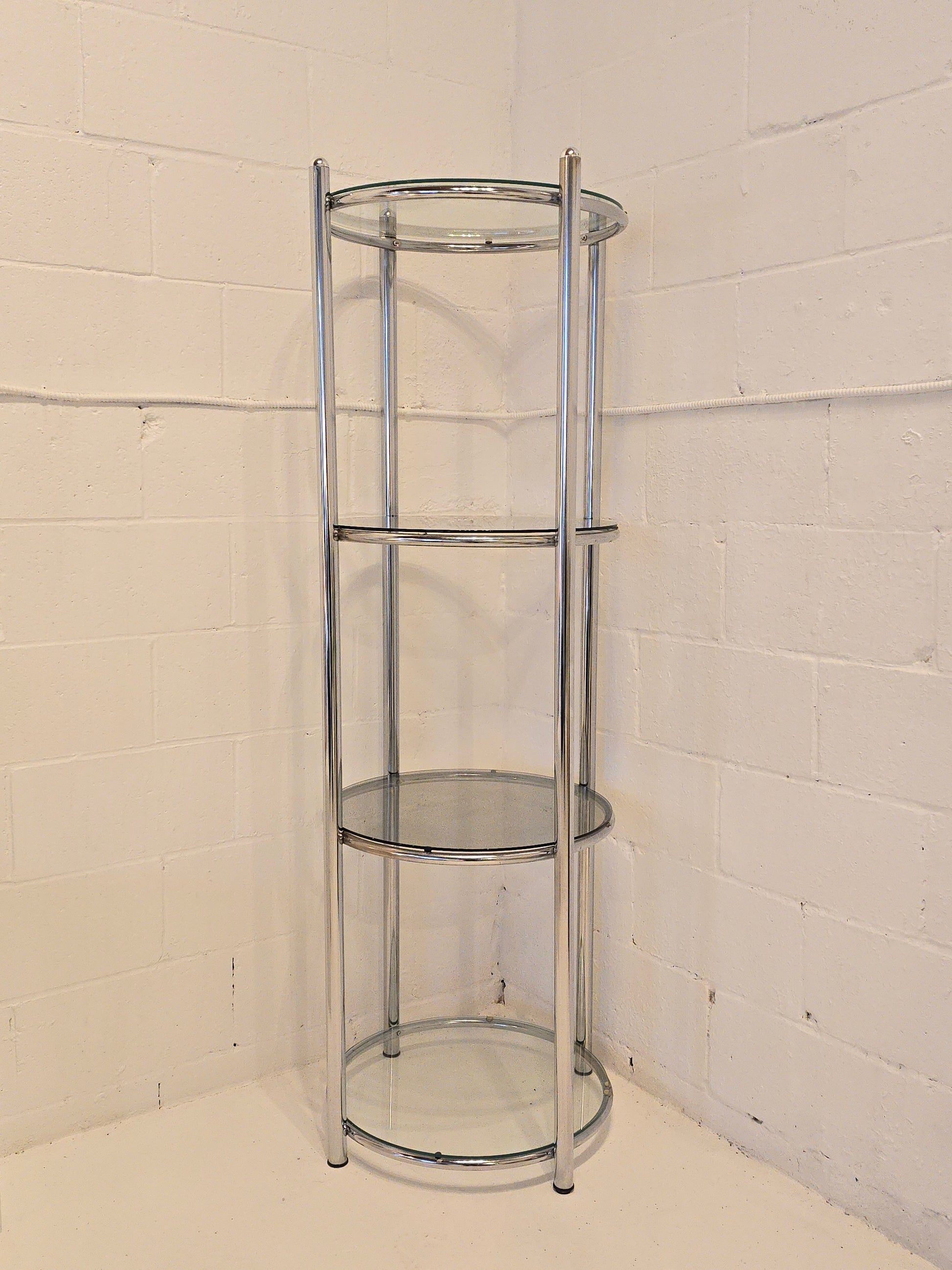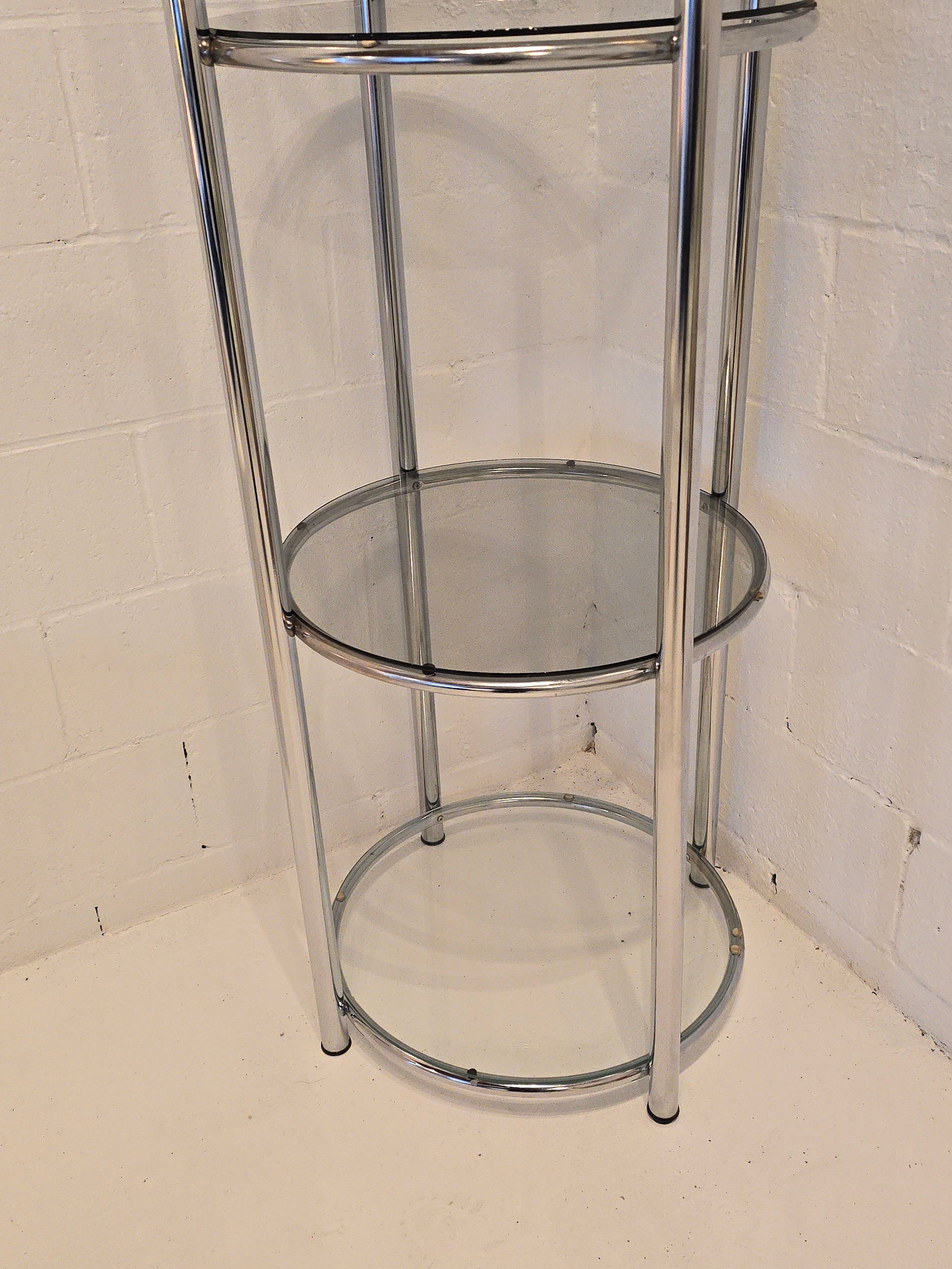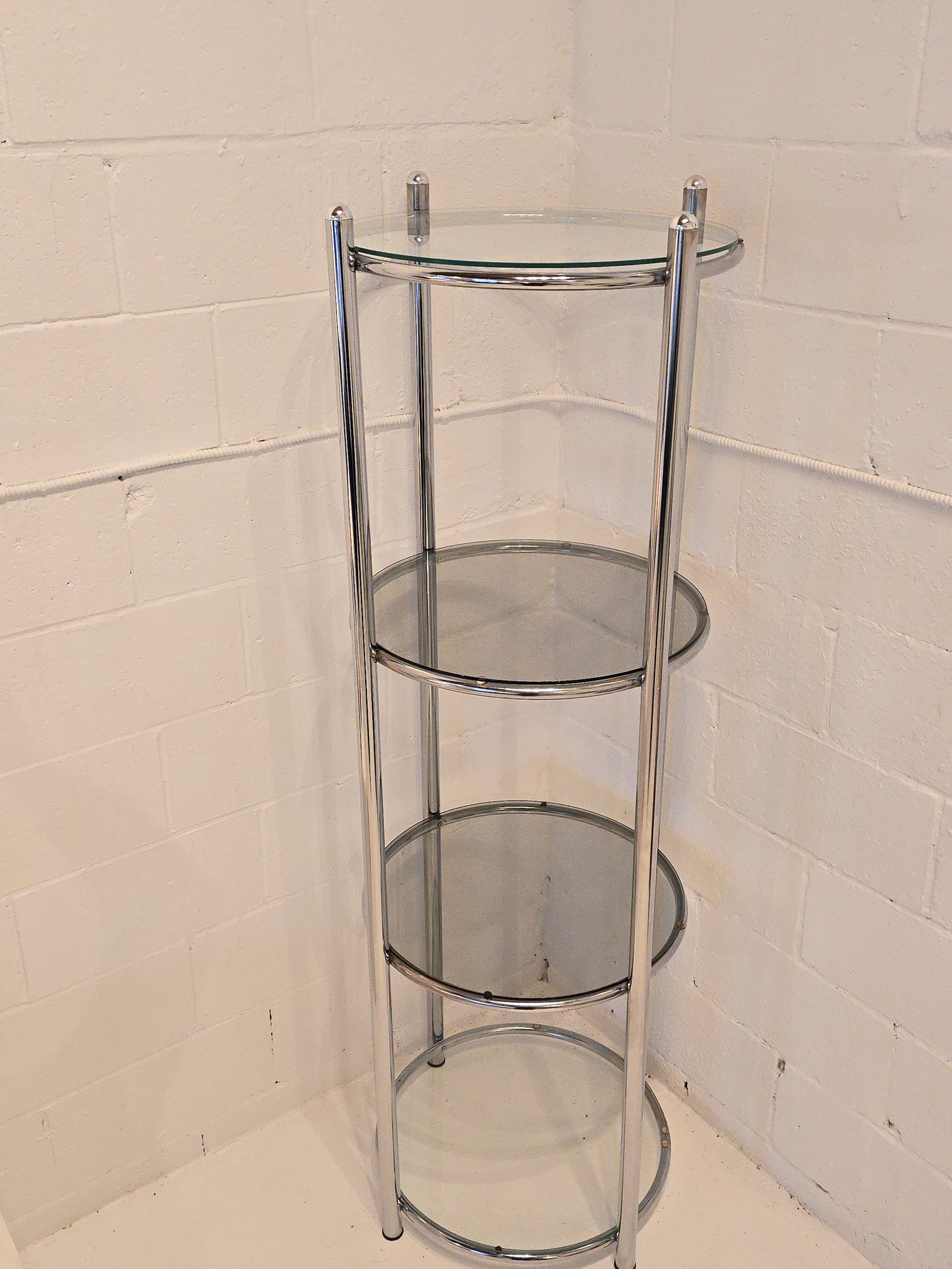 Circular Chrome and glass etagere with four shelves featuring clear and tinted glass. The perfect shelf for small spaces and corners. The chrome body is tubular and holds two tinted glass and two clear glass shelves. In overall good vintage condition, with some signs of wear.