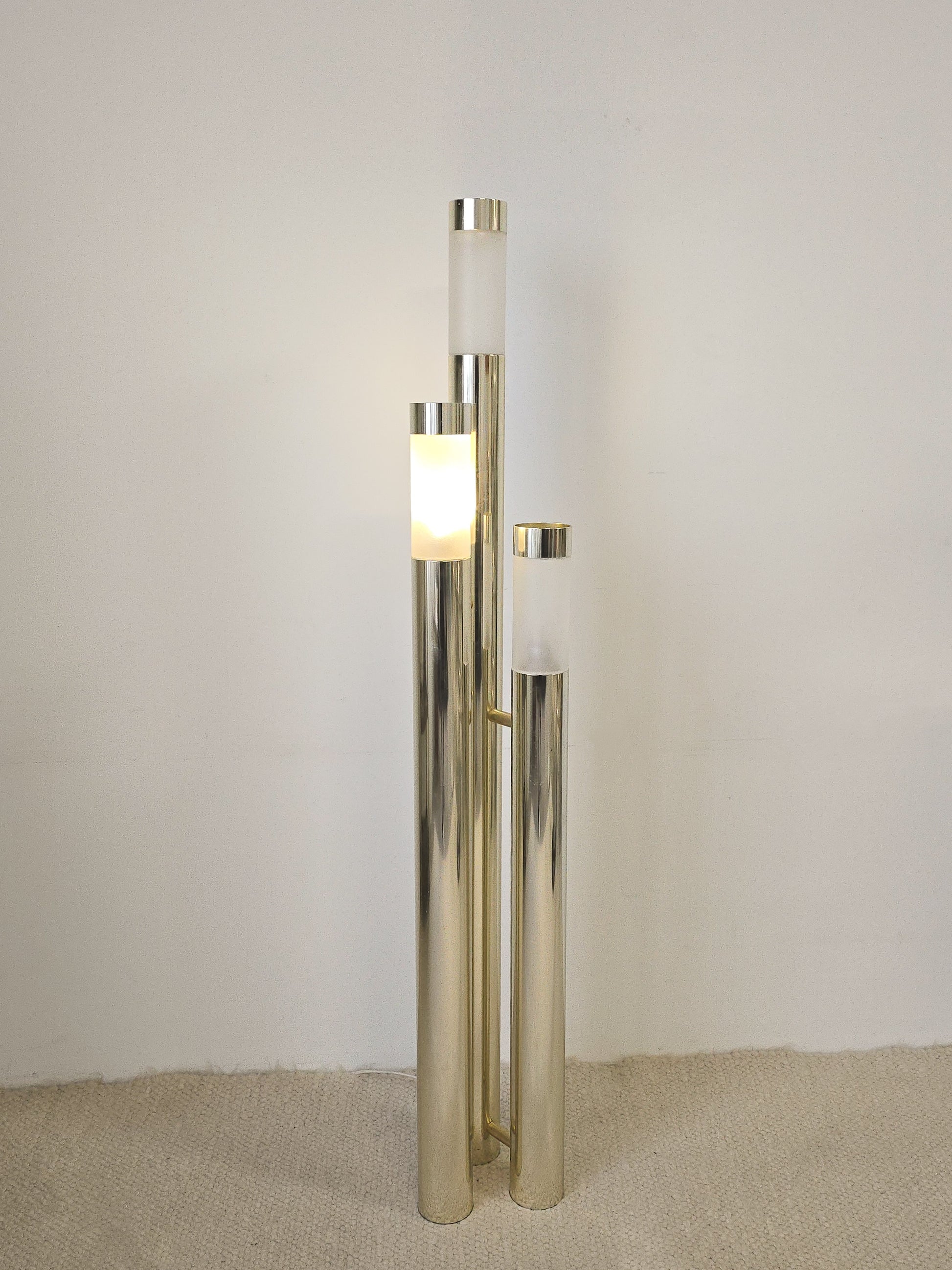 1970s. Ilt's made in gold/brass colored aluminum with frosted plastic/acrylic shades. It features a three light switch. Inoverall great vintage condition with some light wear such as flaw on the frosted acrylic/plastic shade,