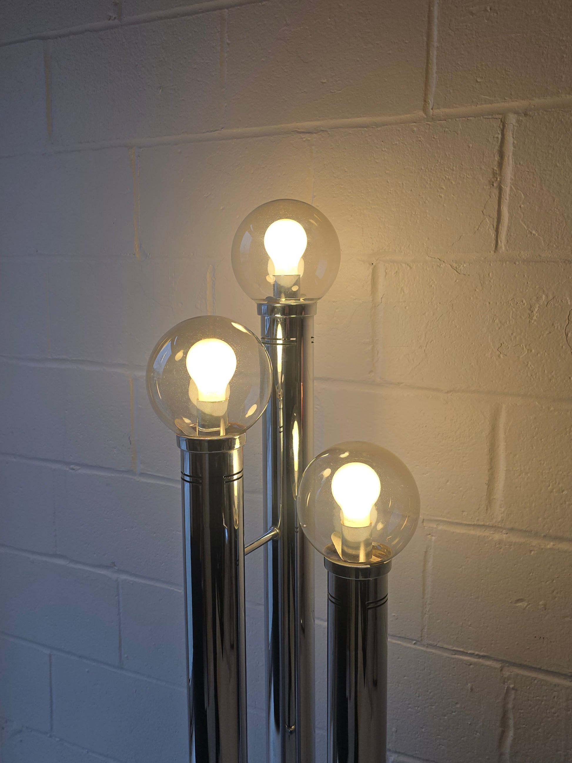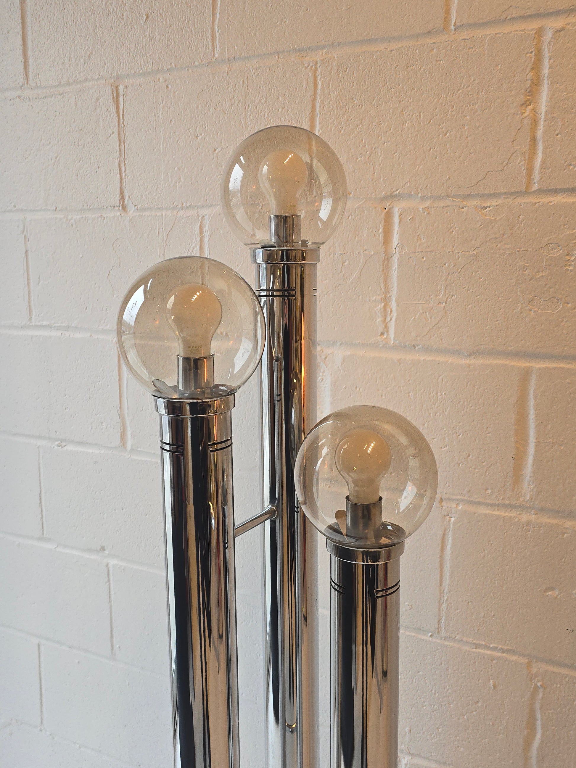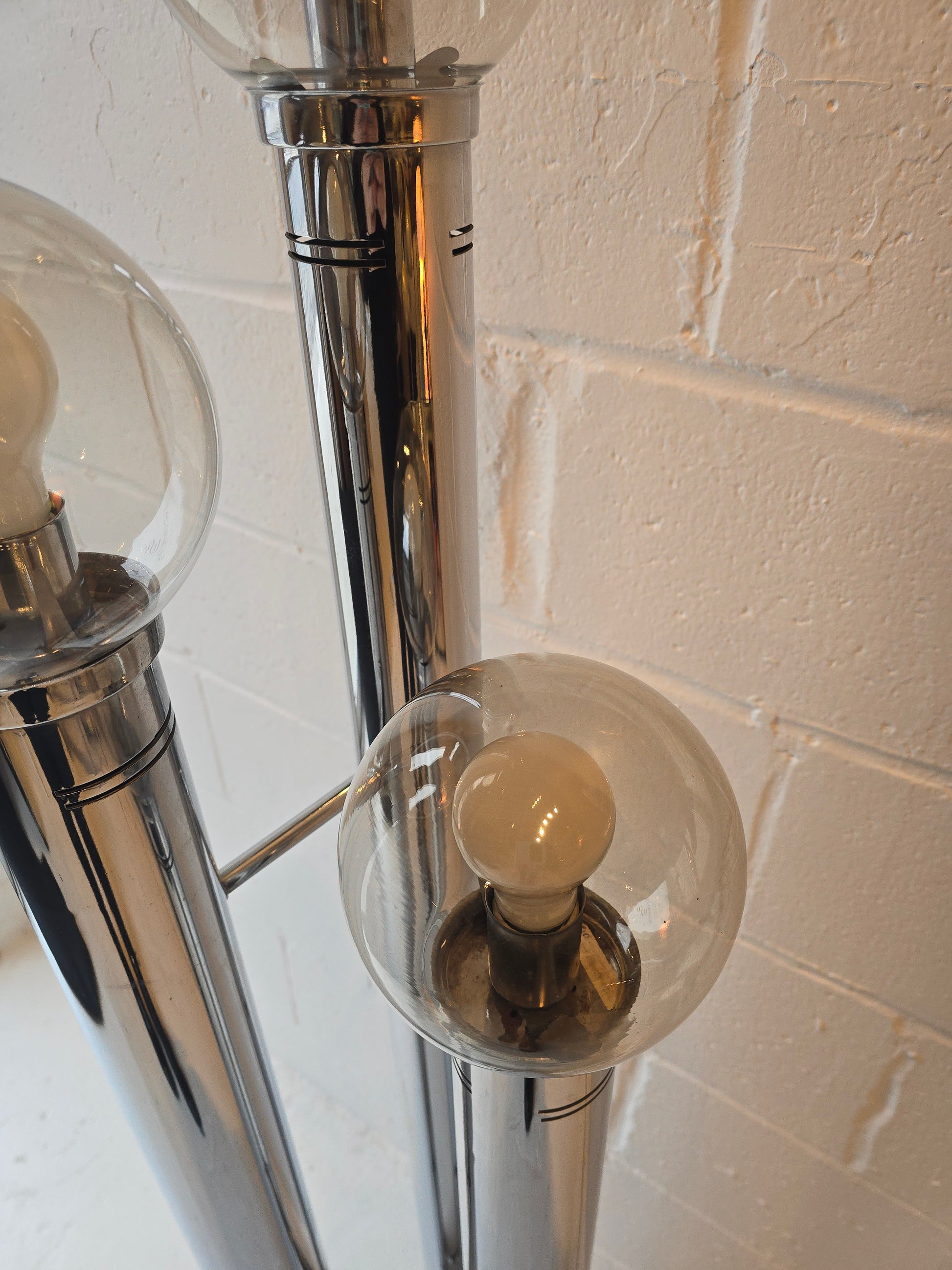 Stunning three tier glass globe and chrome floor lamp. This lovely lamp has three cylindrical tiers in varying heights that are connected at the chrome base featuring tinted transparent qlass alobes. In excellent condition. some minor wear and some tarnish on inside of lid (where globes sit)