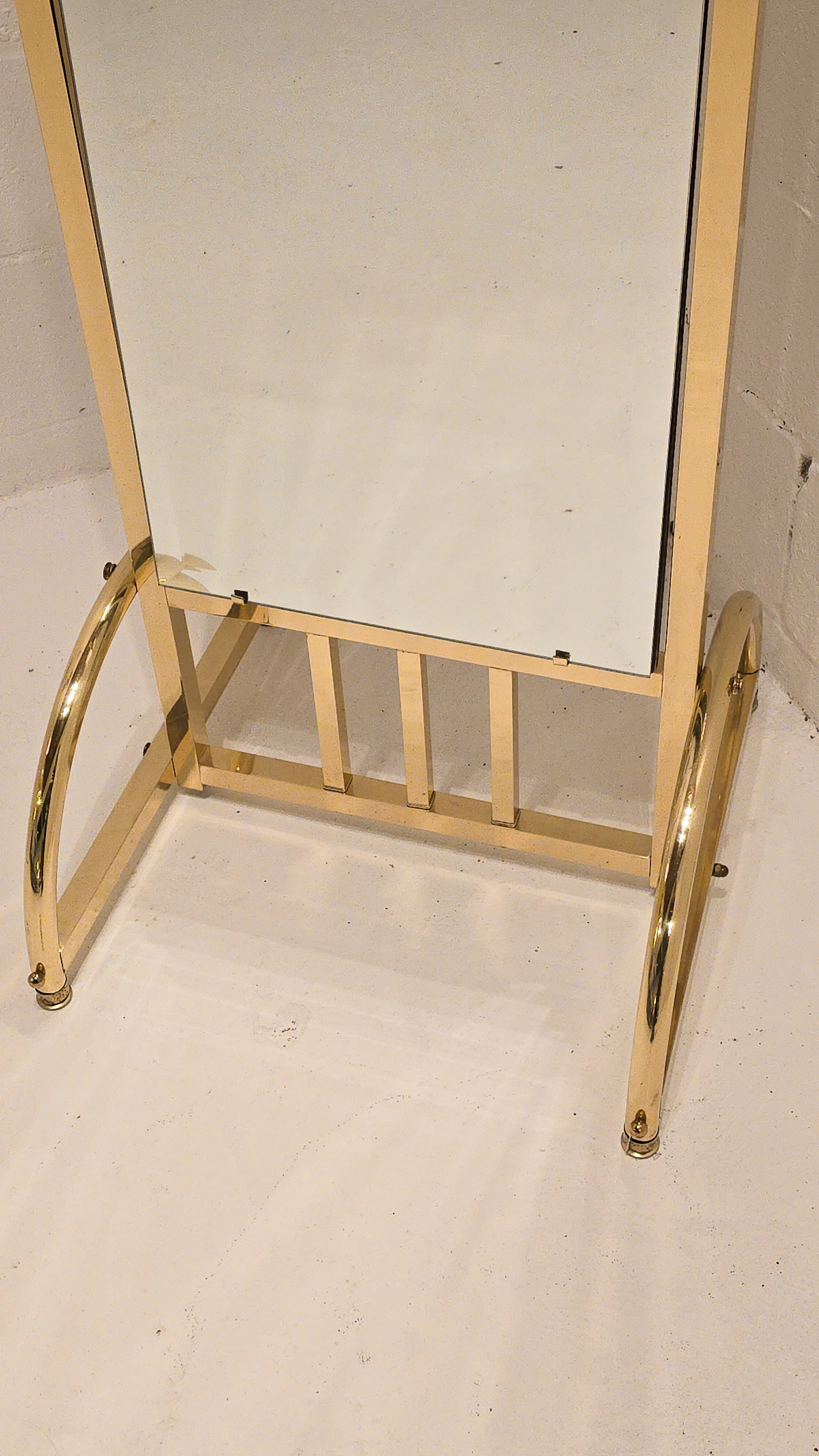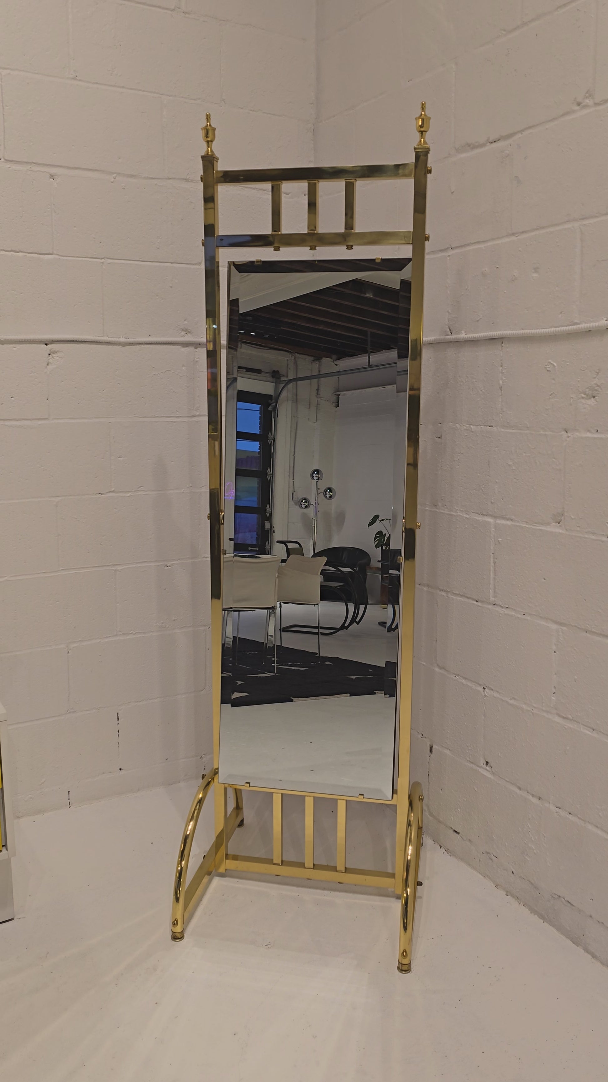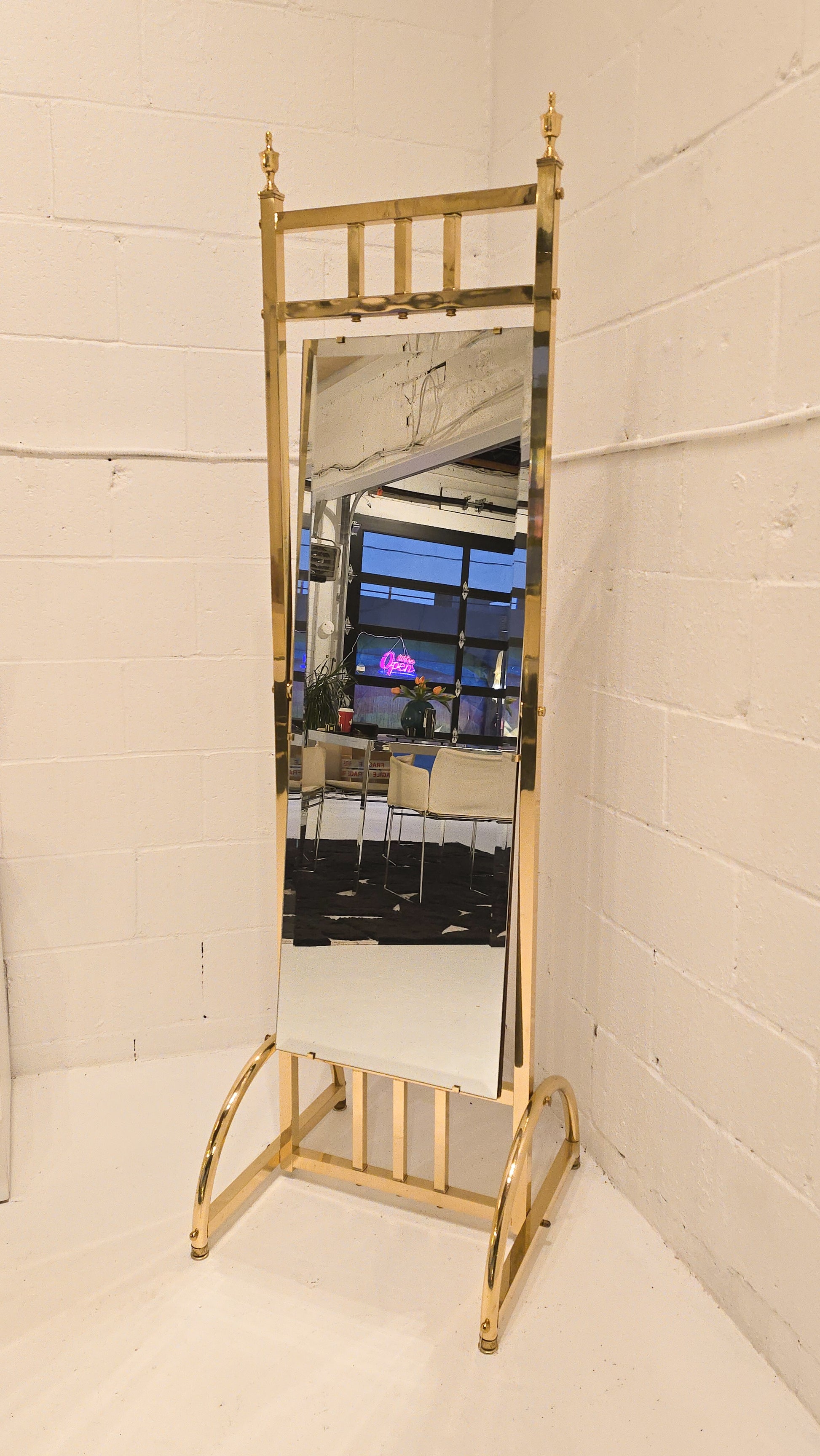 Gorgeous Hollywood regency style brass standing mirror. This mirror has a brass body with a beveled mirror that is held with a wooden backing. There are beautiful detailing throughout such as the crowns on the top corners. The mirror tilts which can be adjusted to desired position. This glamorous mirror can be used functionally and as a statement piece. It would make a beautiful addition to various styles of interior. The decorative knobs at the top edges can be removed/unscrewed if preferred. In great condition, minor signs of wear on brass.