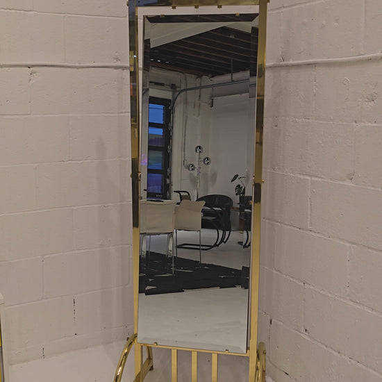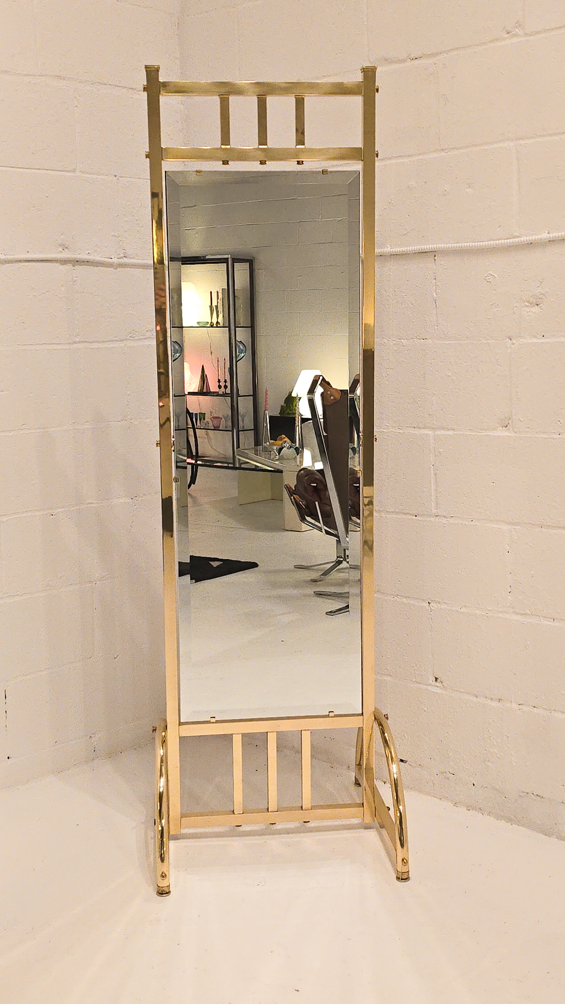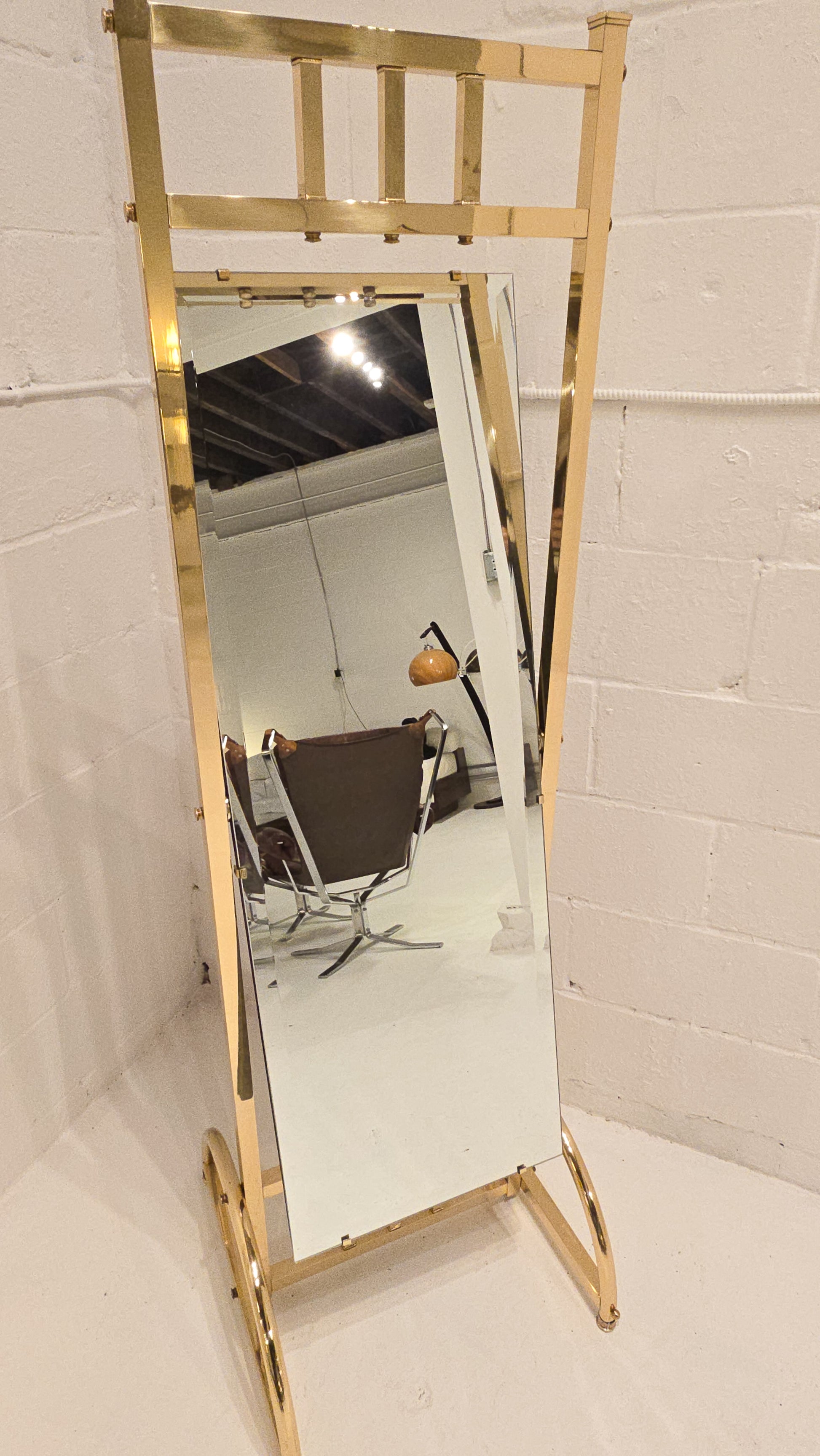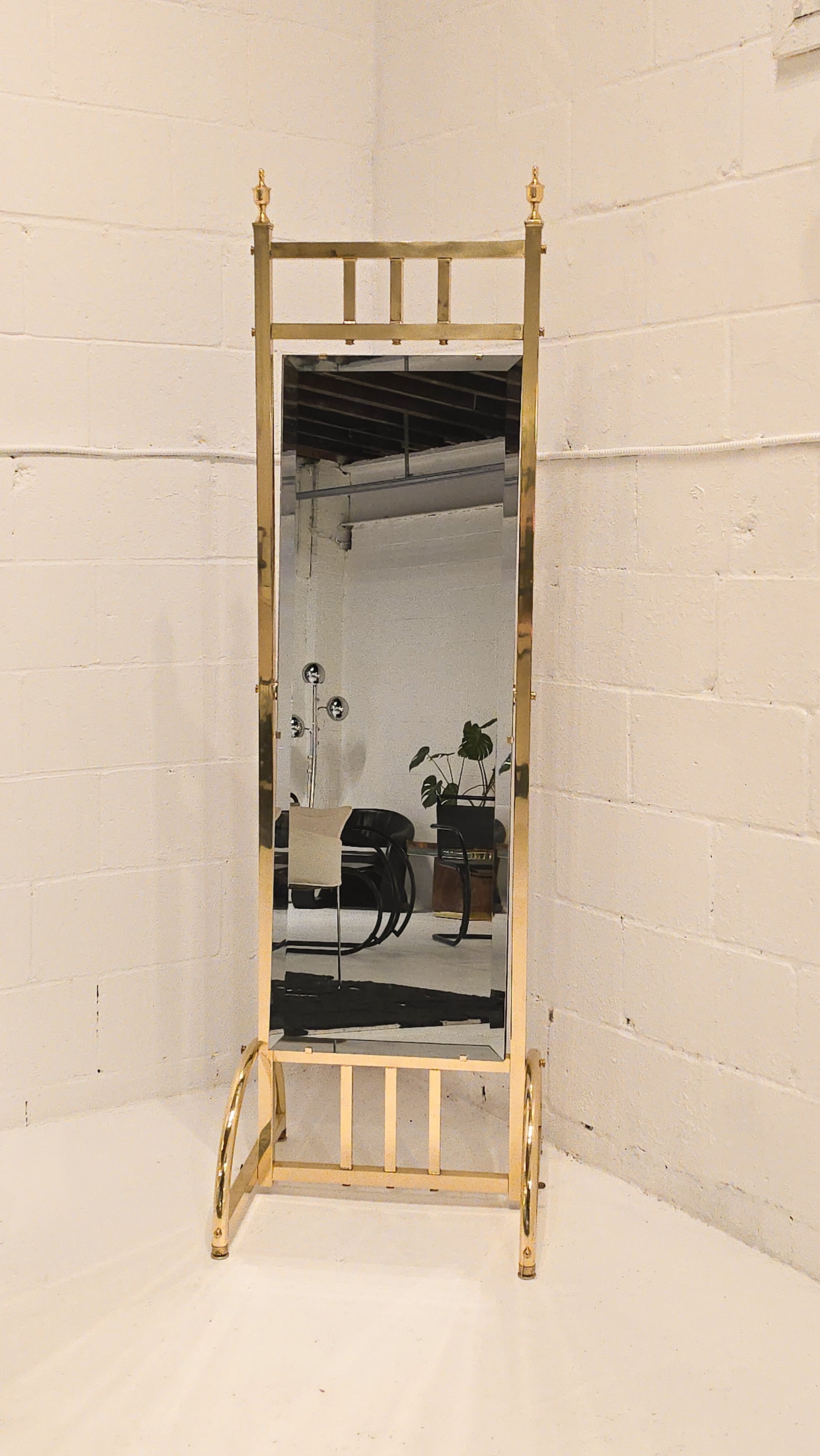 Gorgeous Hollywood regency style brass standing mirror. This mirror has a brass body with a beveled mirror that is held with a wooden backing. There are beautiful detailing throughout such as the crowns on the top corners. The mirror tilts which can be adjusted to desired position. This glamorous mirror can be used functionally and as a statement piece. It would make a beautiful addition to various styles of interior. The decorative knobs at the top edges can be removed/unscrewed if preferred. In great condition, minor signs of wear on brass.