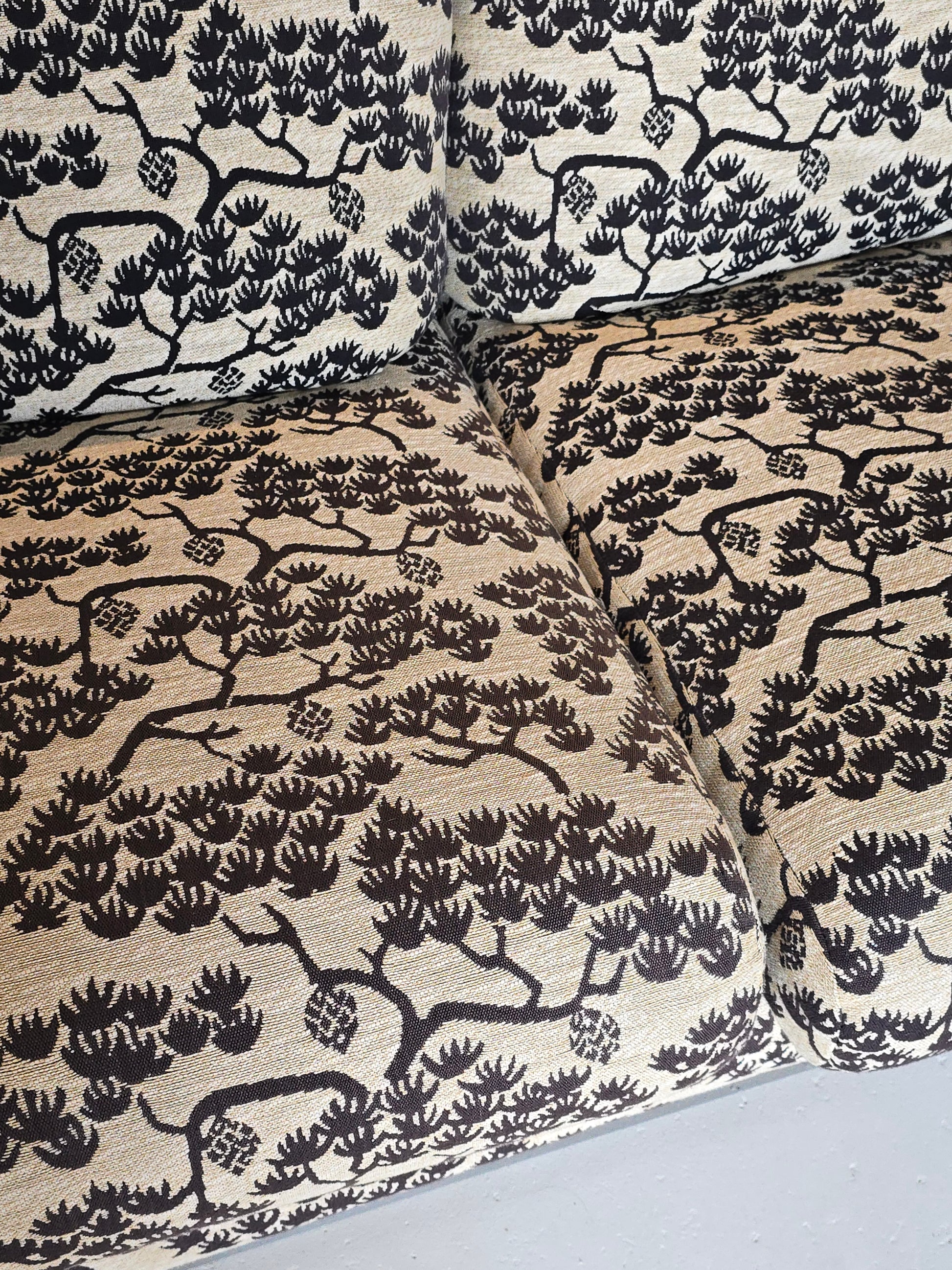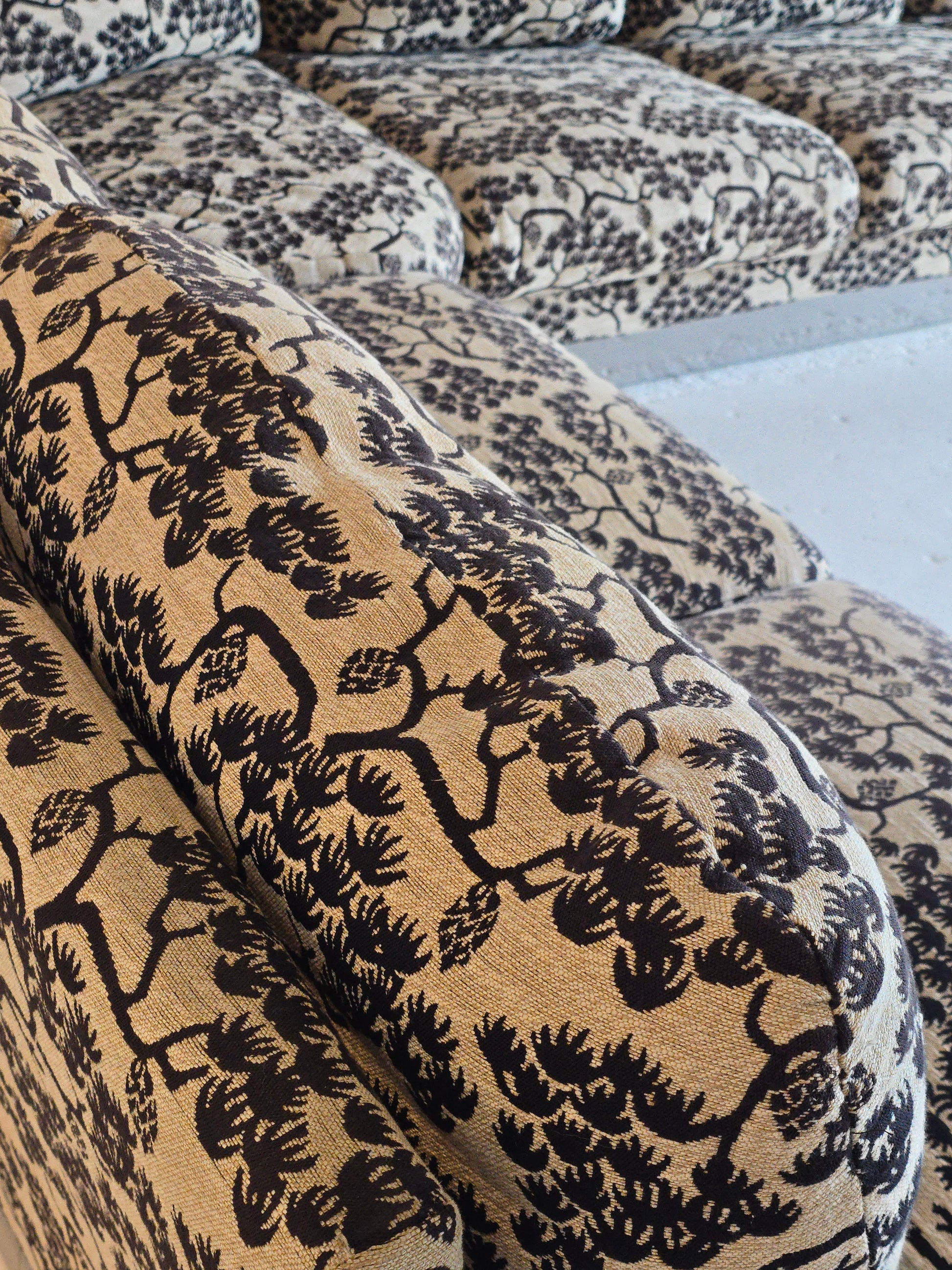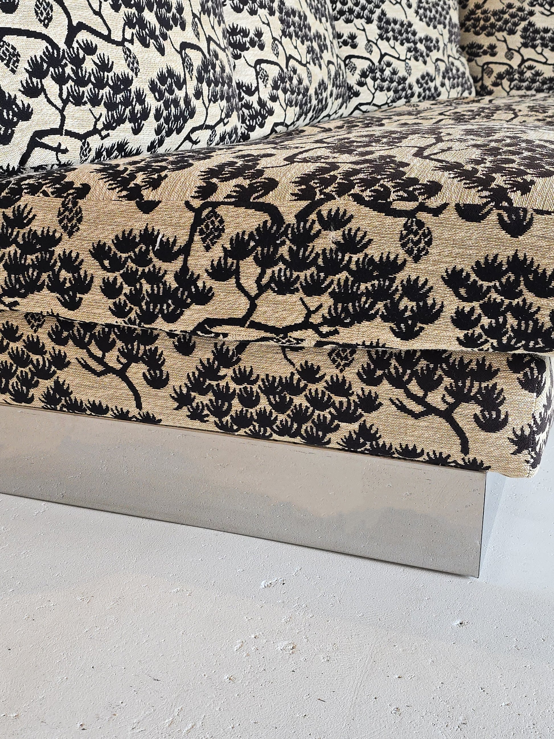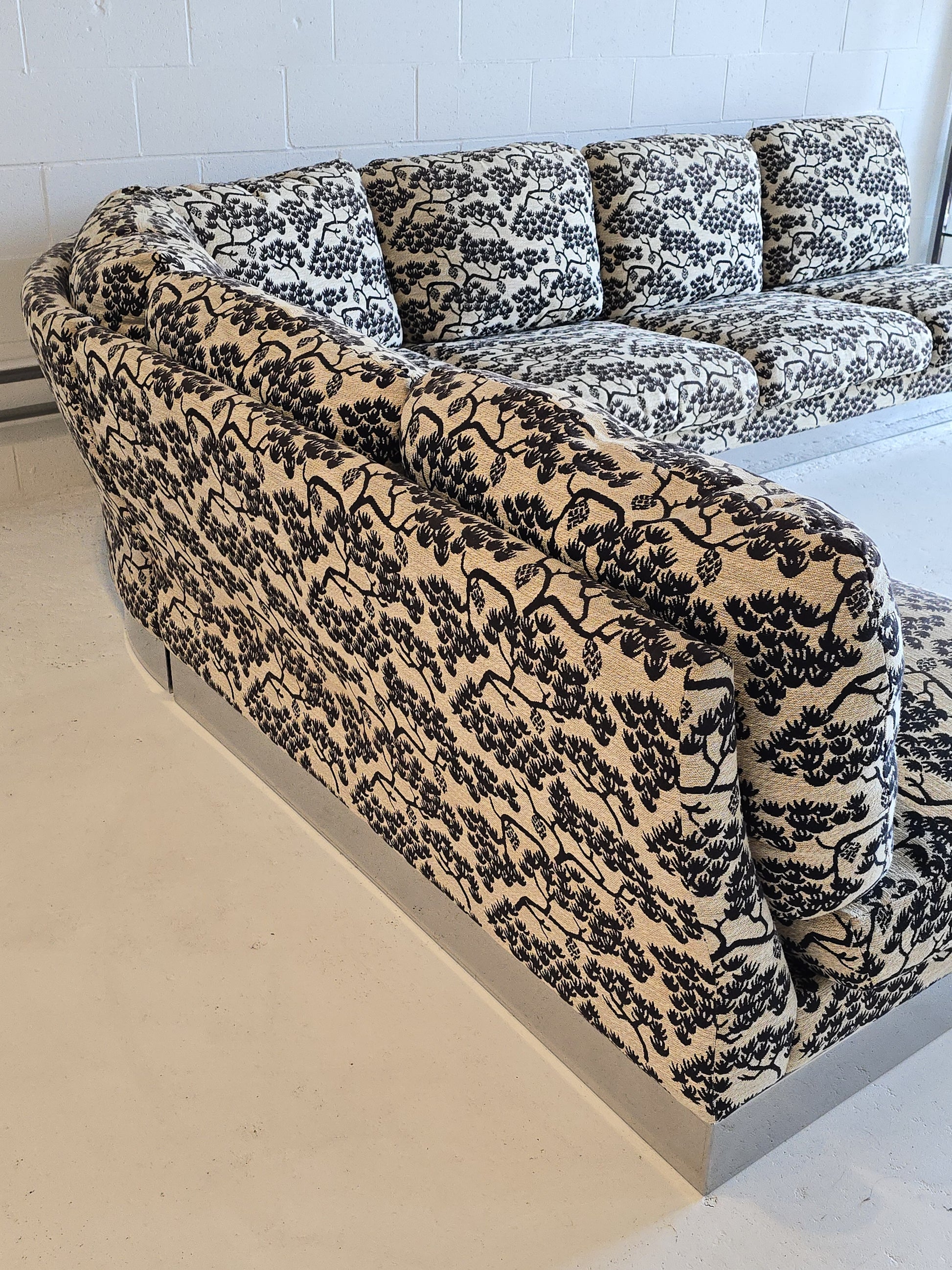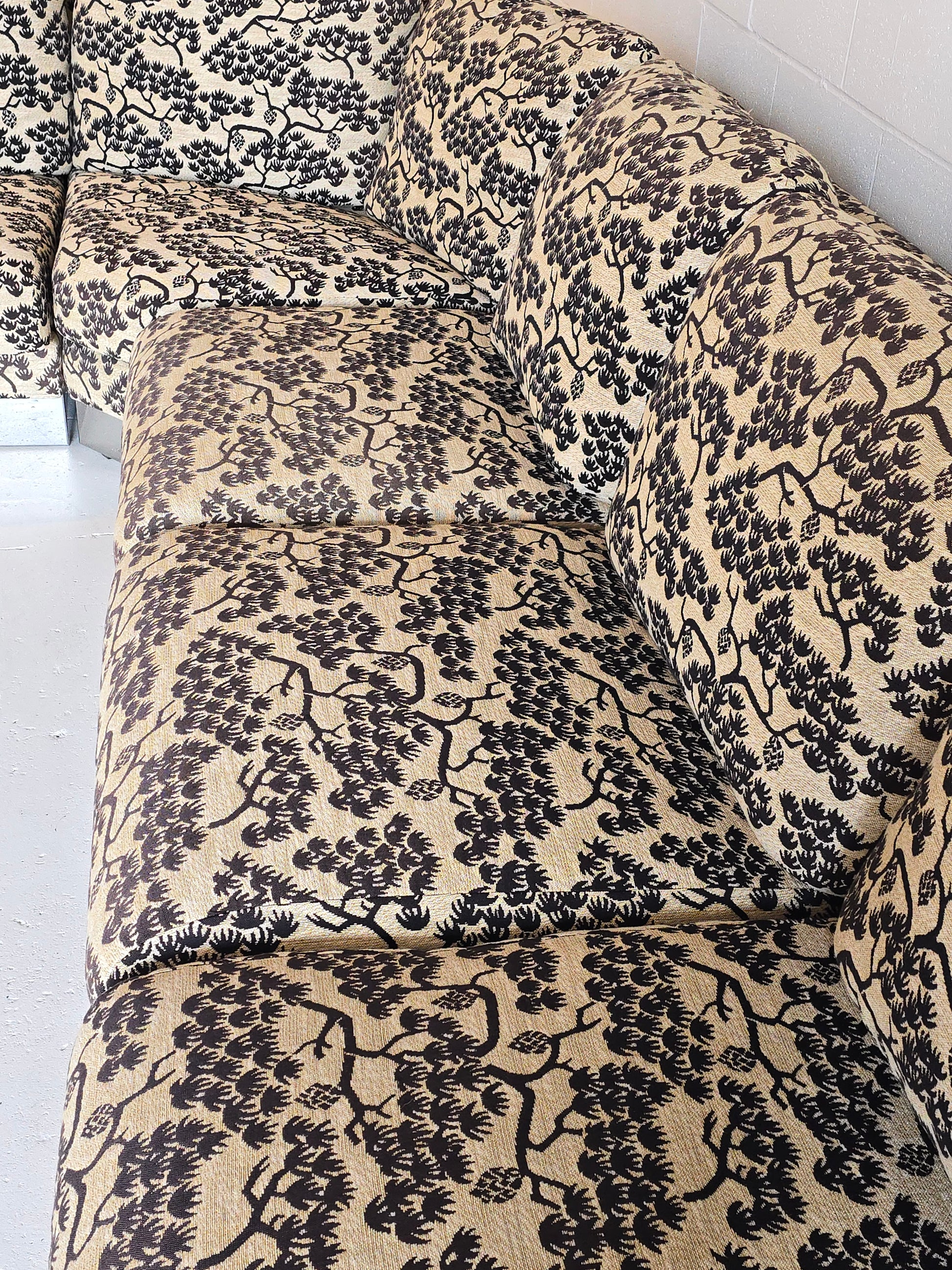 Spectacular sectional sofa by Roche Bobois (tagged). Made in France by custom order in the 1980s. The original fabric is incredible and unique. The aluminum base perfectly compliments the intricate fabric. The cushions are down filled. This beauty is three pieces and modular which can be adjusted and arranged to desired positions. The three pieces feature a three seater, two seater, and a corner. Its as comfortable as it is stunning. In great vintage condition with minimal signs of wear. No tears or rips on fabric.