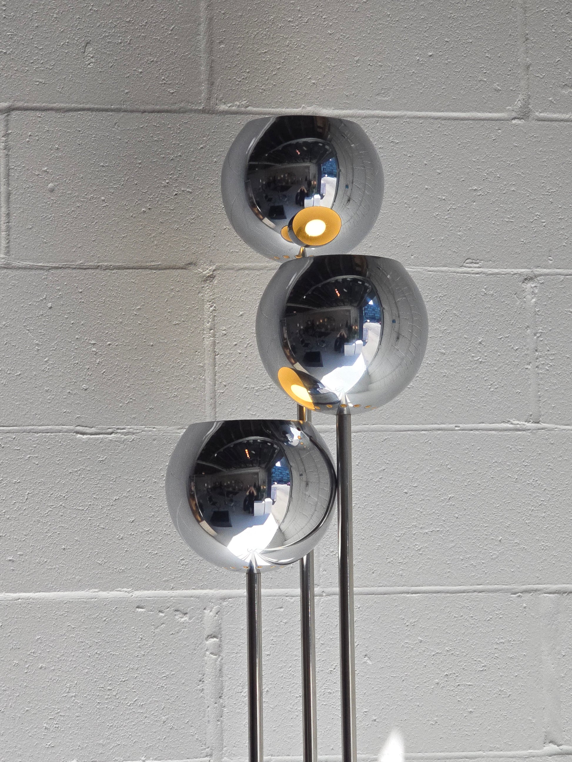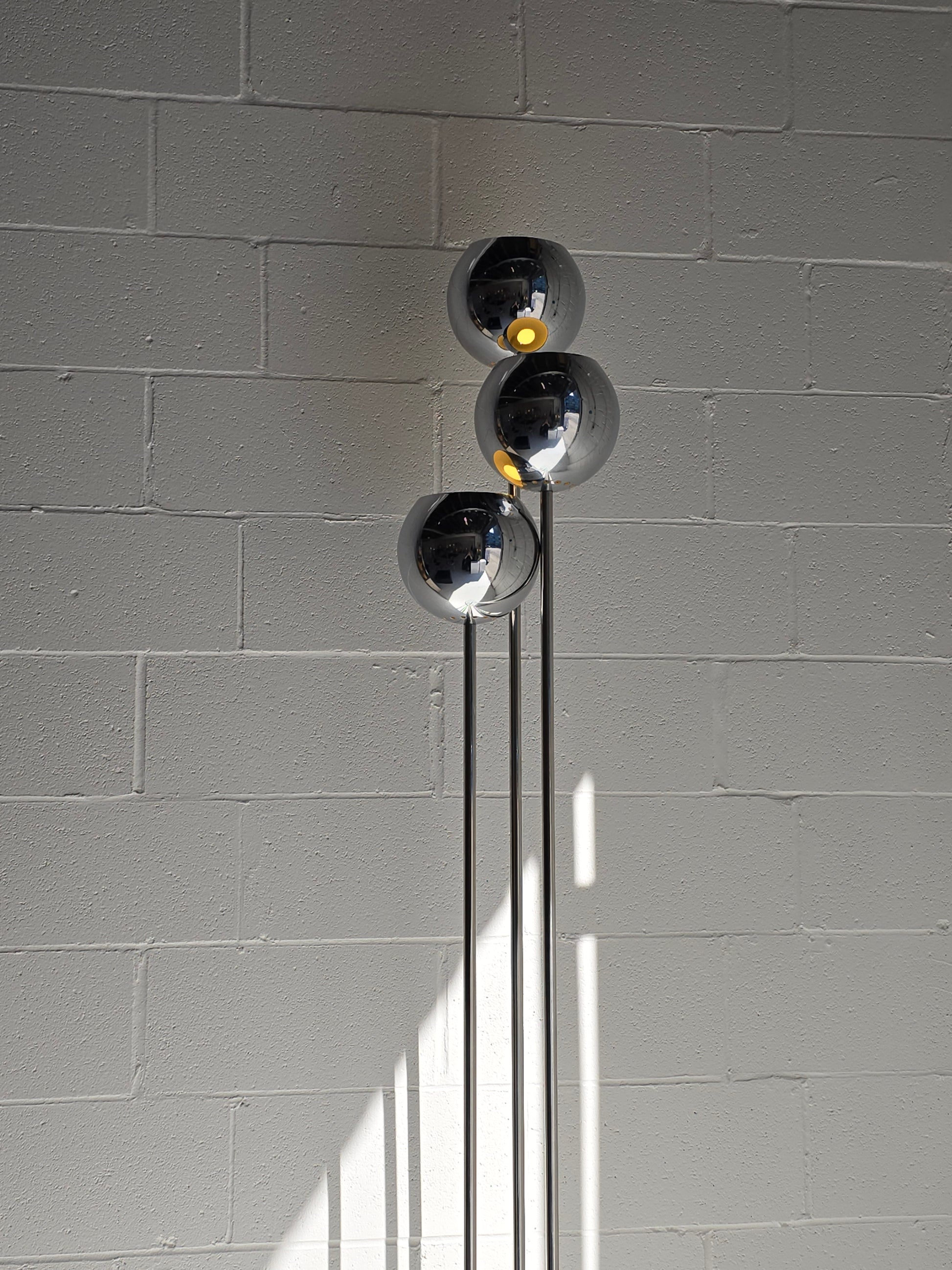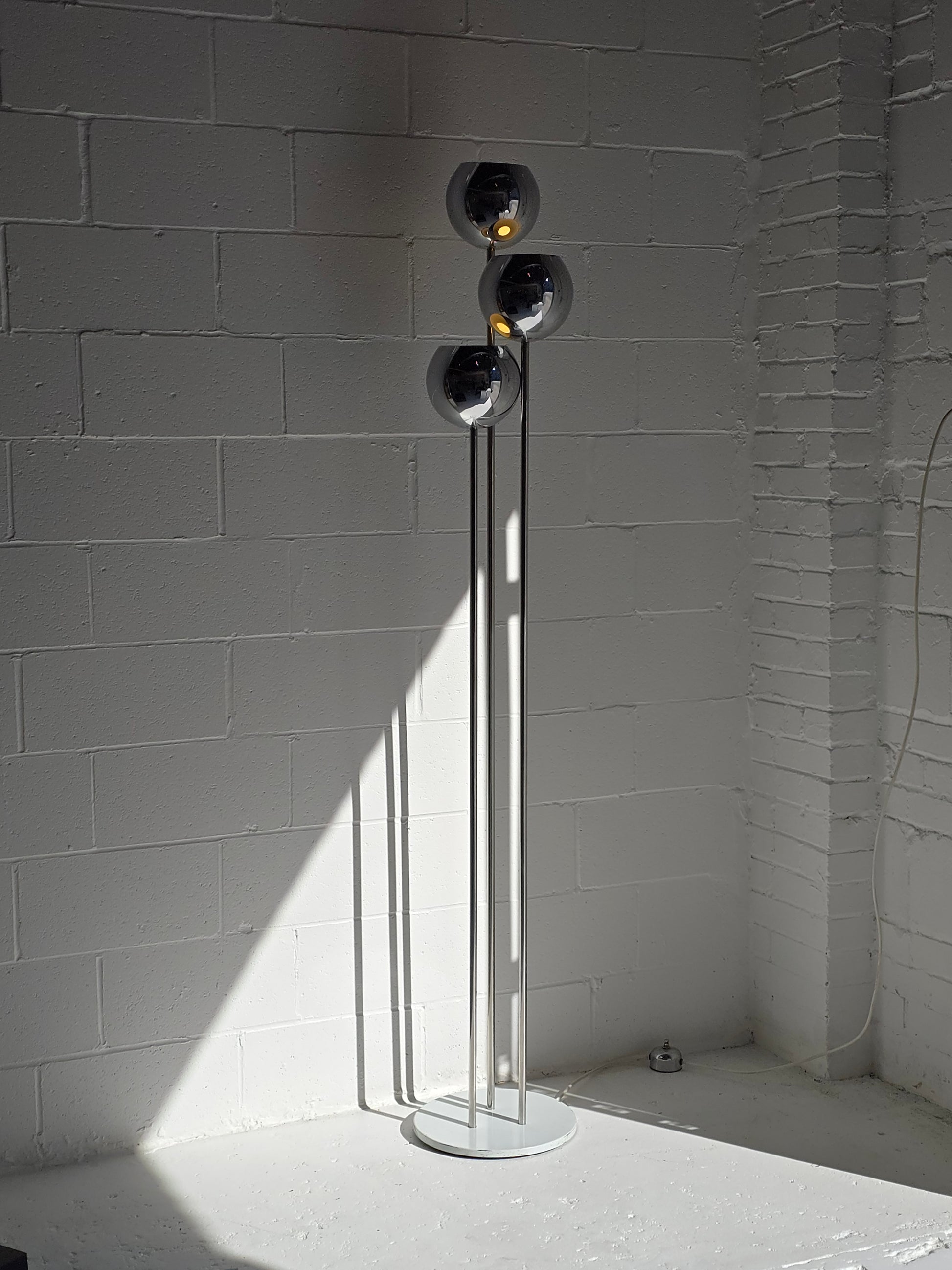 Chrome floor lamp by Reggiani, made in Italy circa 1970s. It's finished in Chrome with a white base. This floor lamp features three tiers in varying heights with spherical shade facing up. It has a foot switch and stamped '16 Reggiani, made in ltaly'. In great vintage condition.