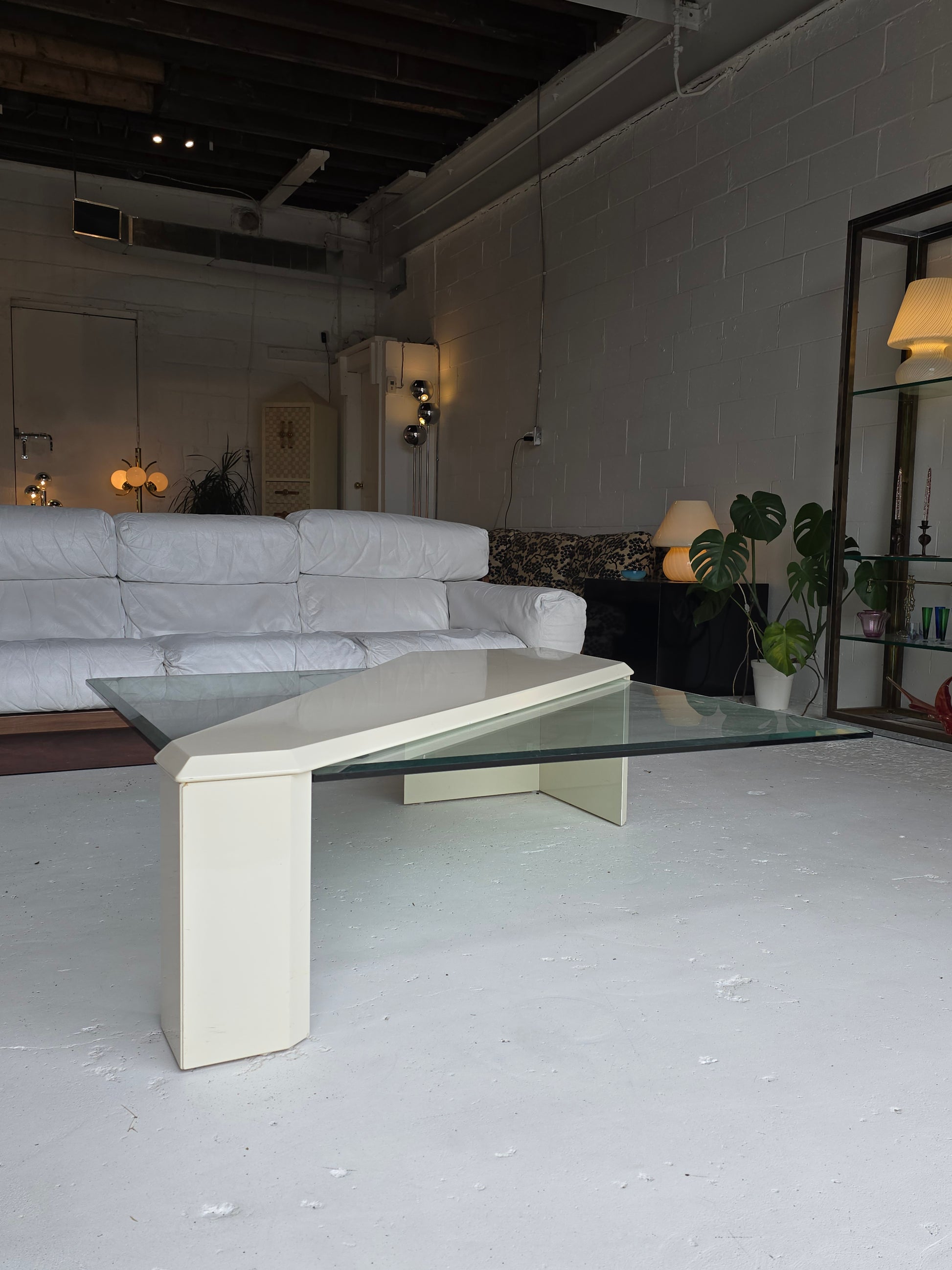 Extraordinary Coffee table by Roger Rougier in lacquered wood with beveled glass. The lacquered wood is asymmetrical with a beveled edge finish and the thick beveled glass slides in under the lacquered piece. The glossy cream finish on the lacquered wood compliments the thick clear beveled glass piece perfectly. It was made in the 1980s by Roger Rougier in Canada. The table has a Roger Rougier label. This specific piece is rare and very hard to find, it’s believed there were only a handful of this table produced.