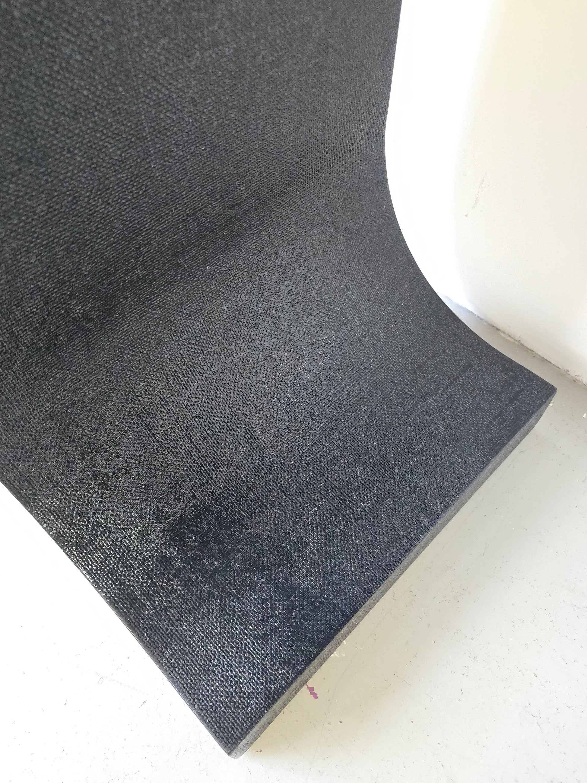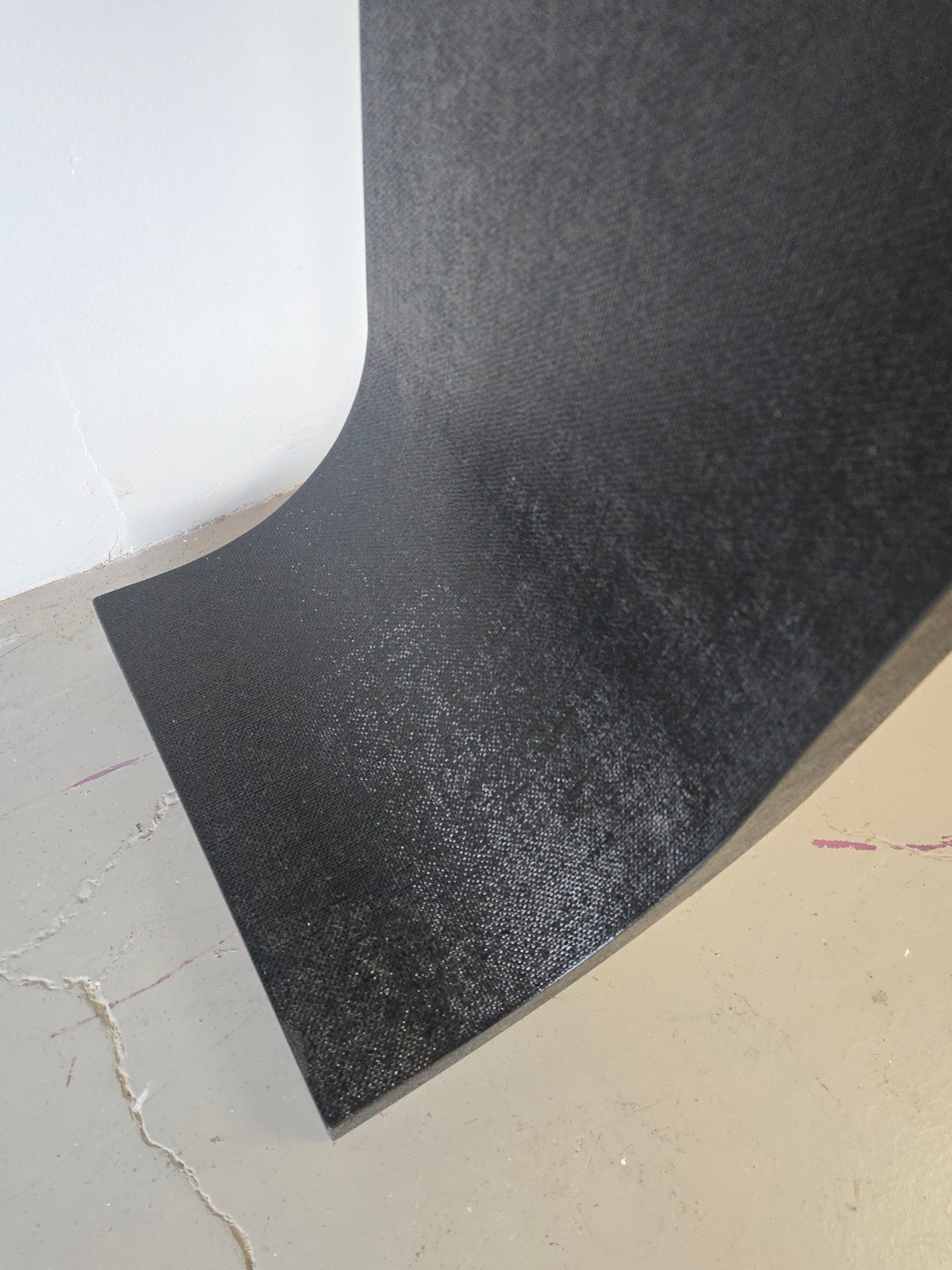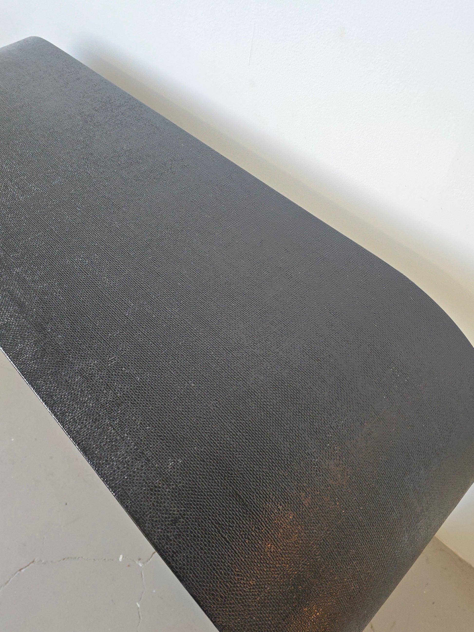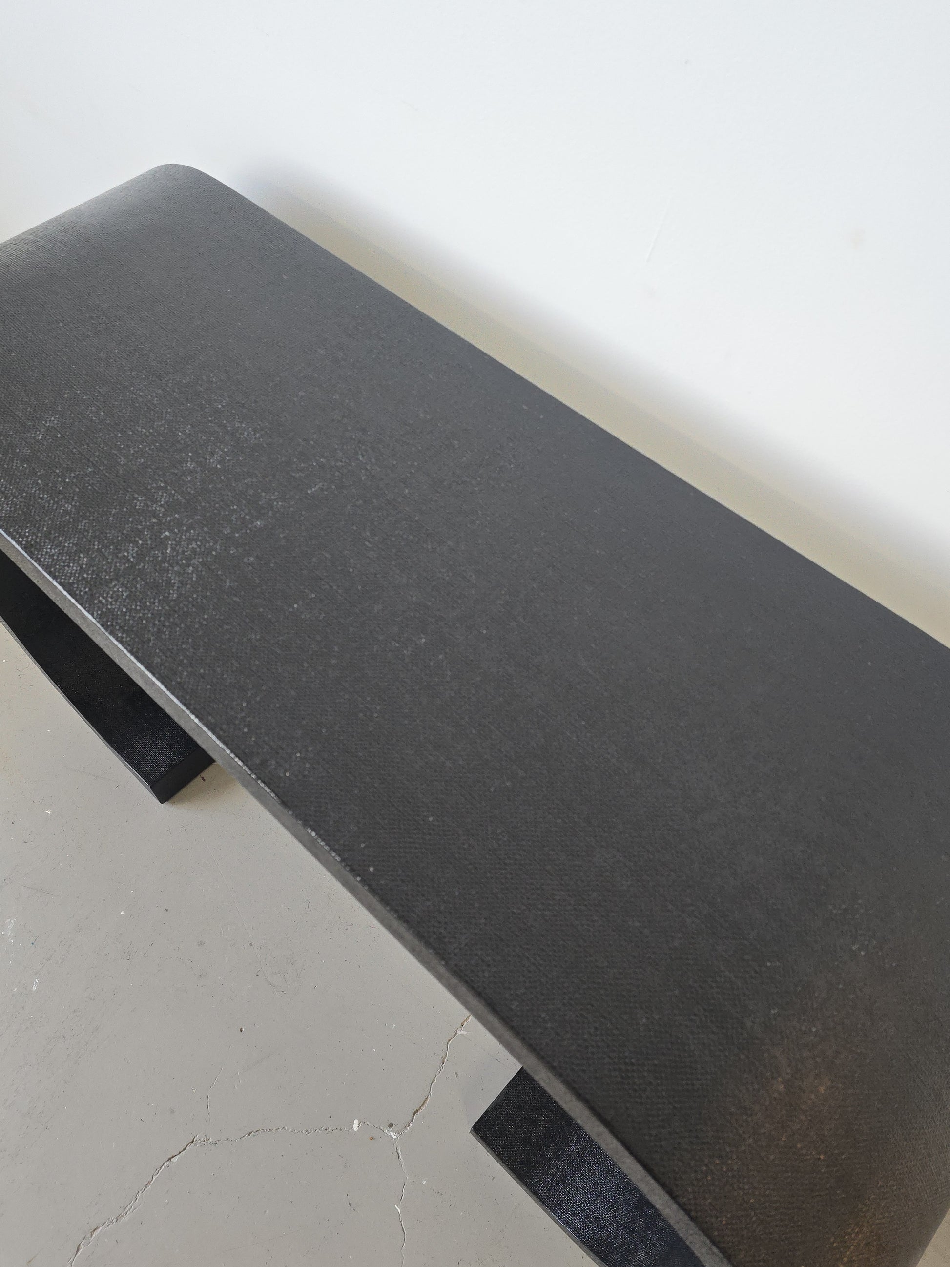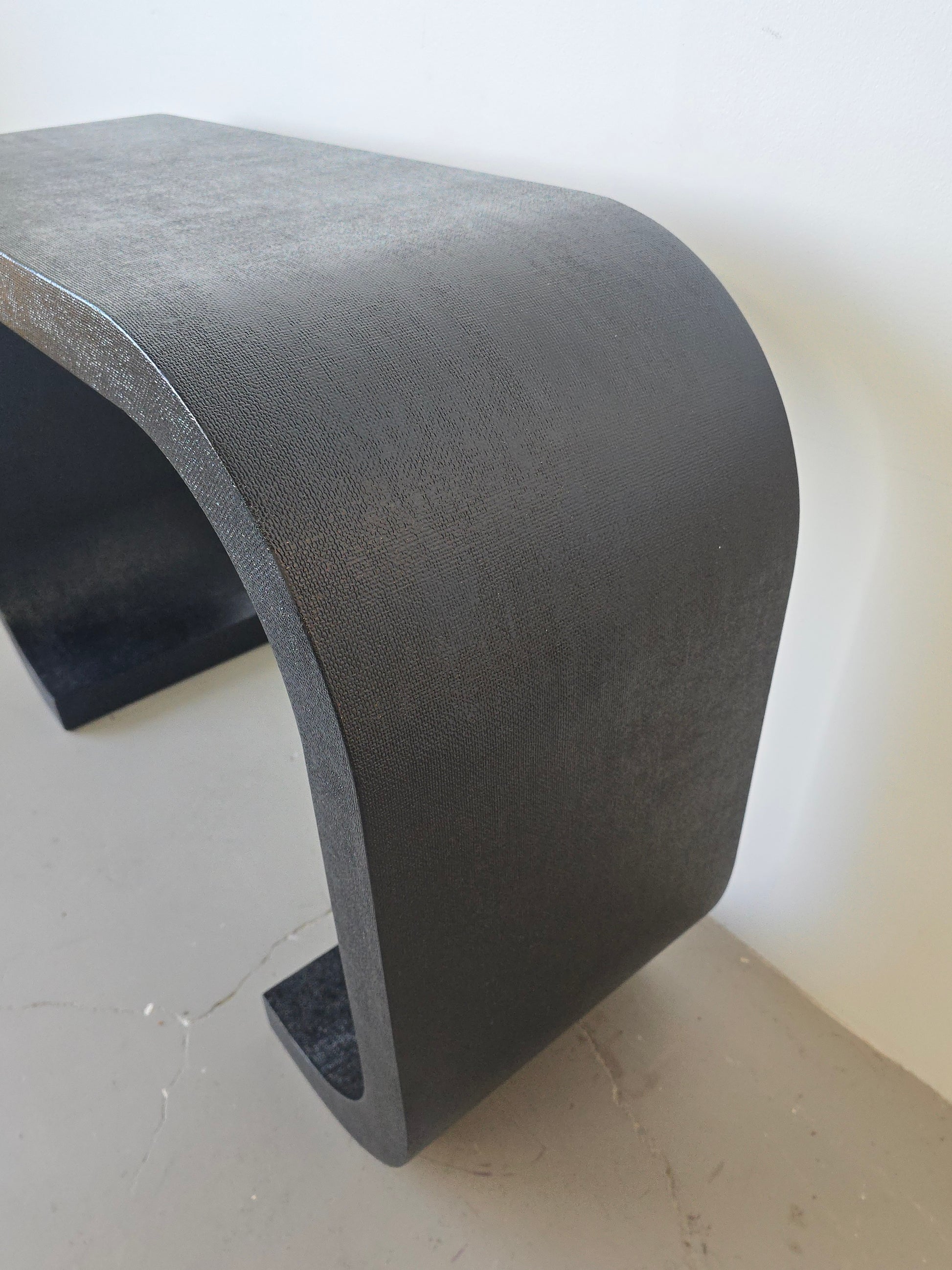 Scroll console table in grasscloth. In the style of Karl Springer. The stunning shape makes it a hard to find piece that is beautifully curved. The top of the table has a waterfall effect on the edges which are followed by legs that scroll inwards the table. It's made with a wooden base and black grasscloth material. In overall excellent condition, very minimal signs of wear. Structurally sturdy.