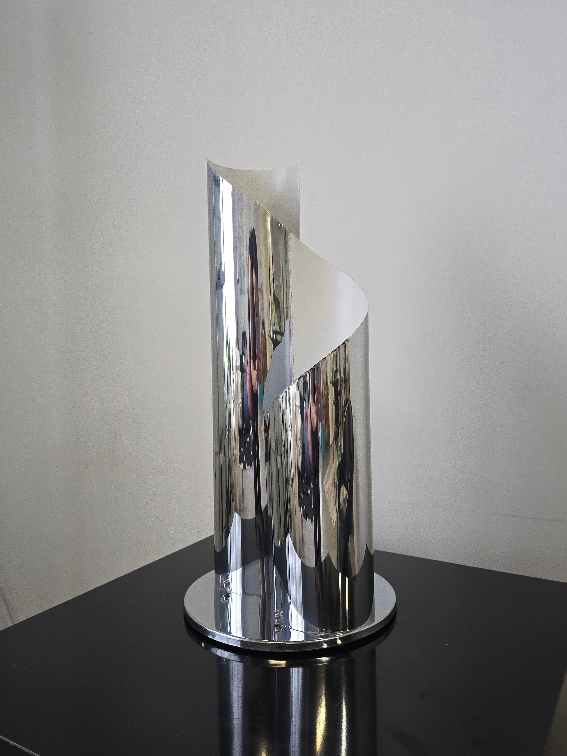 This exquisite sculptural table lamp is a functional piece of art. It was made in Italy. The material used to construct it is one sheet of metal, meticulously crafted. This one-piece metal sheet is delicately folded to create a sculptural and functional lamp. The sculptural shape of the lamp delicately hides the light. The lamp features two light bulbs on both sides of the folds which emits a soft light. This stunning piece is attributed to Mario Bellini. The cord has a 'AMC Milano' stamp. It's wired for North America.