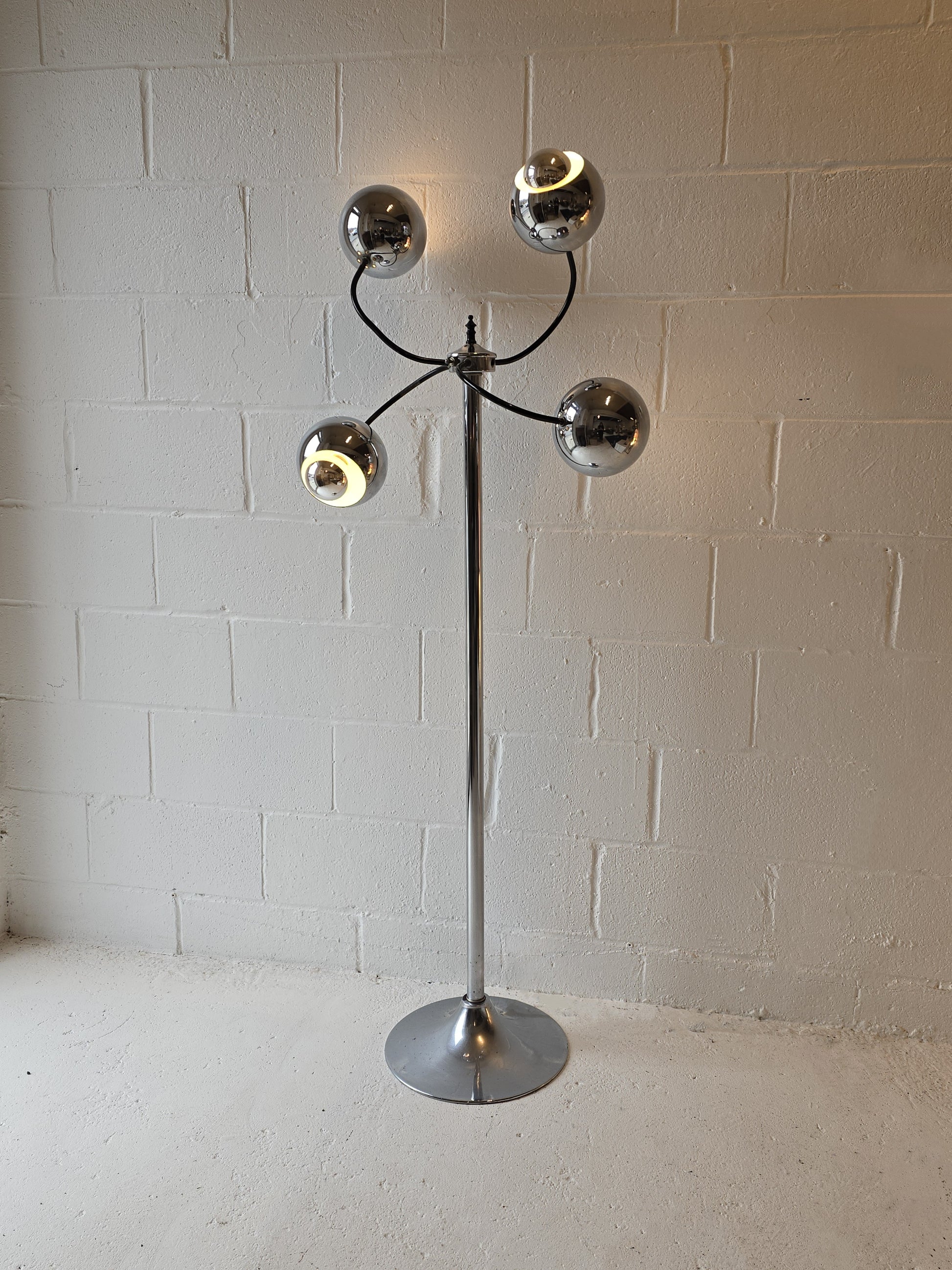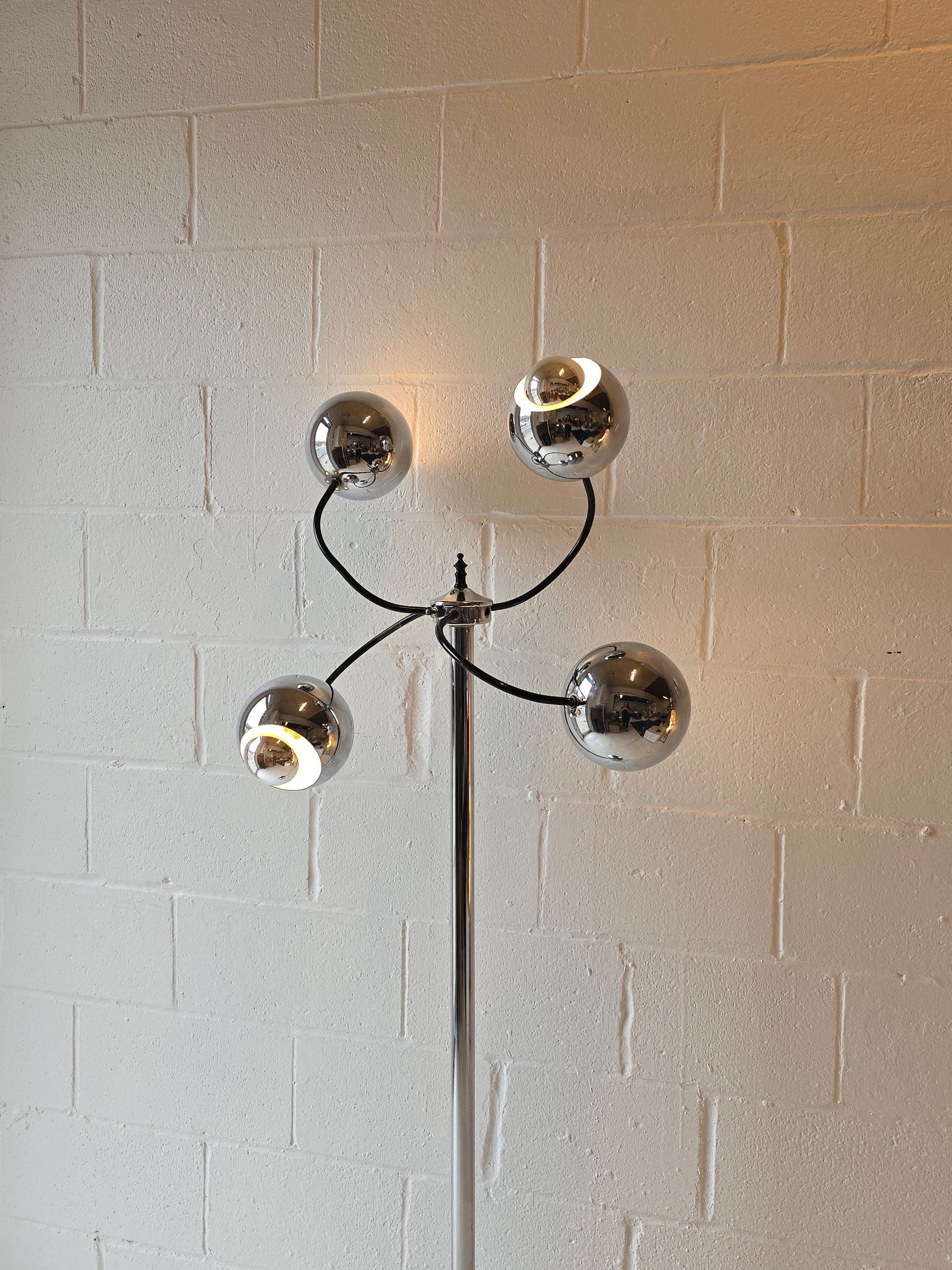 Cool space age style chrome floor lamp with four arms. It features three light settings. In good vintage condition with some signs of wear, as expected with age.