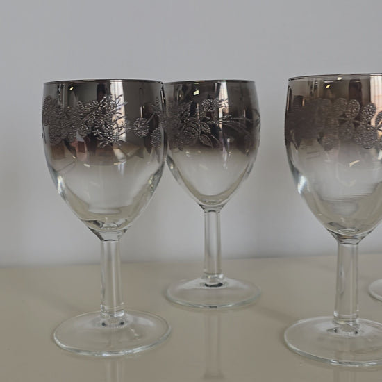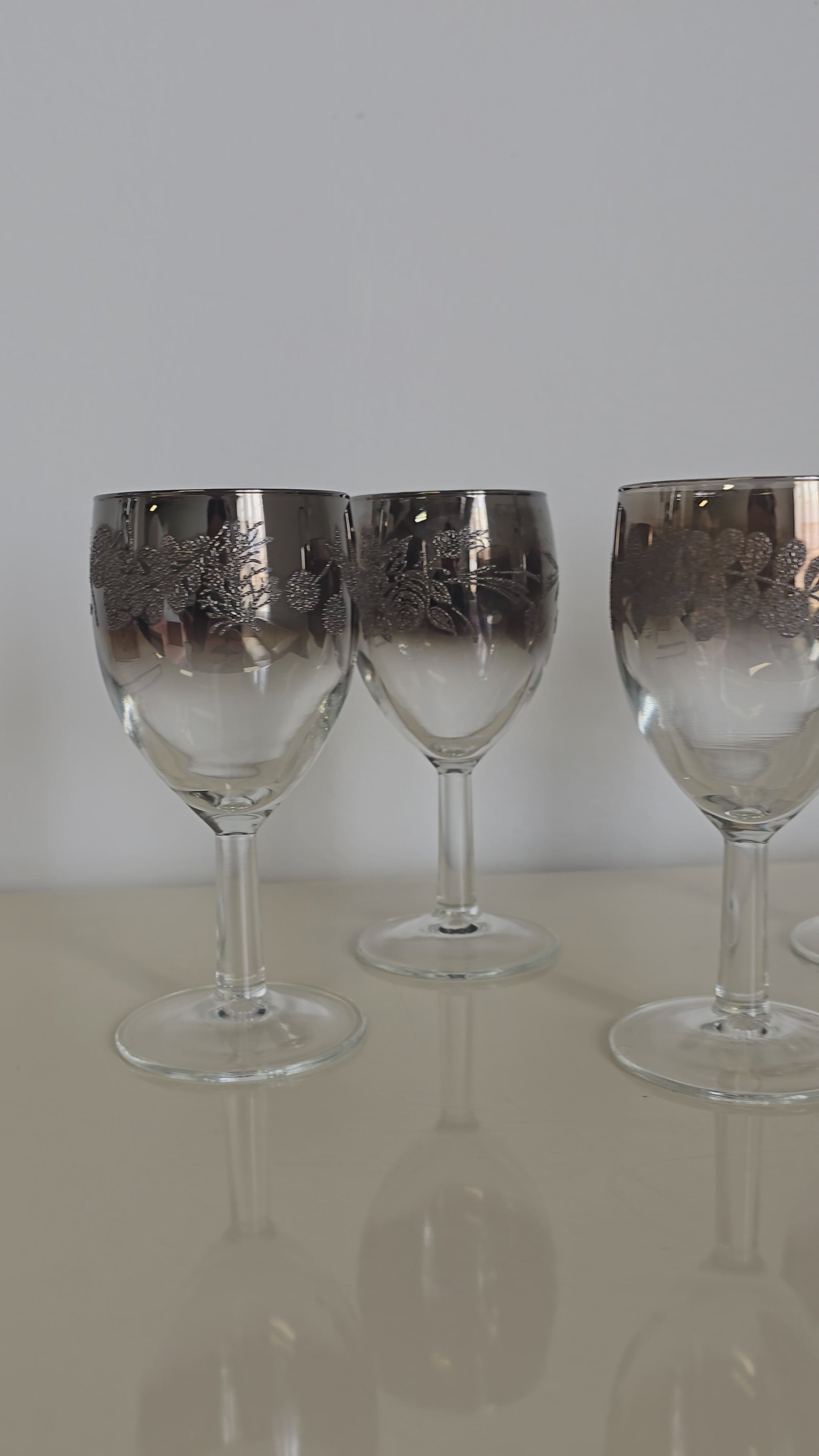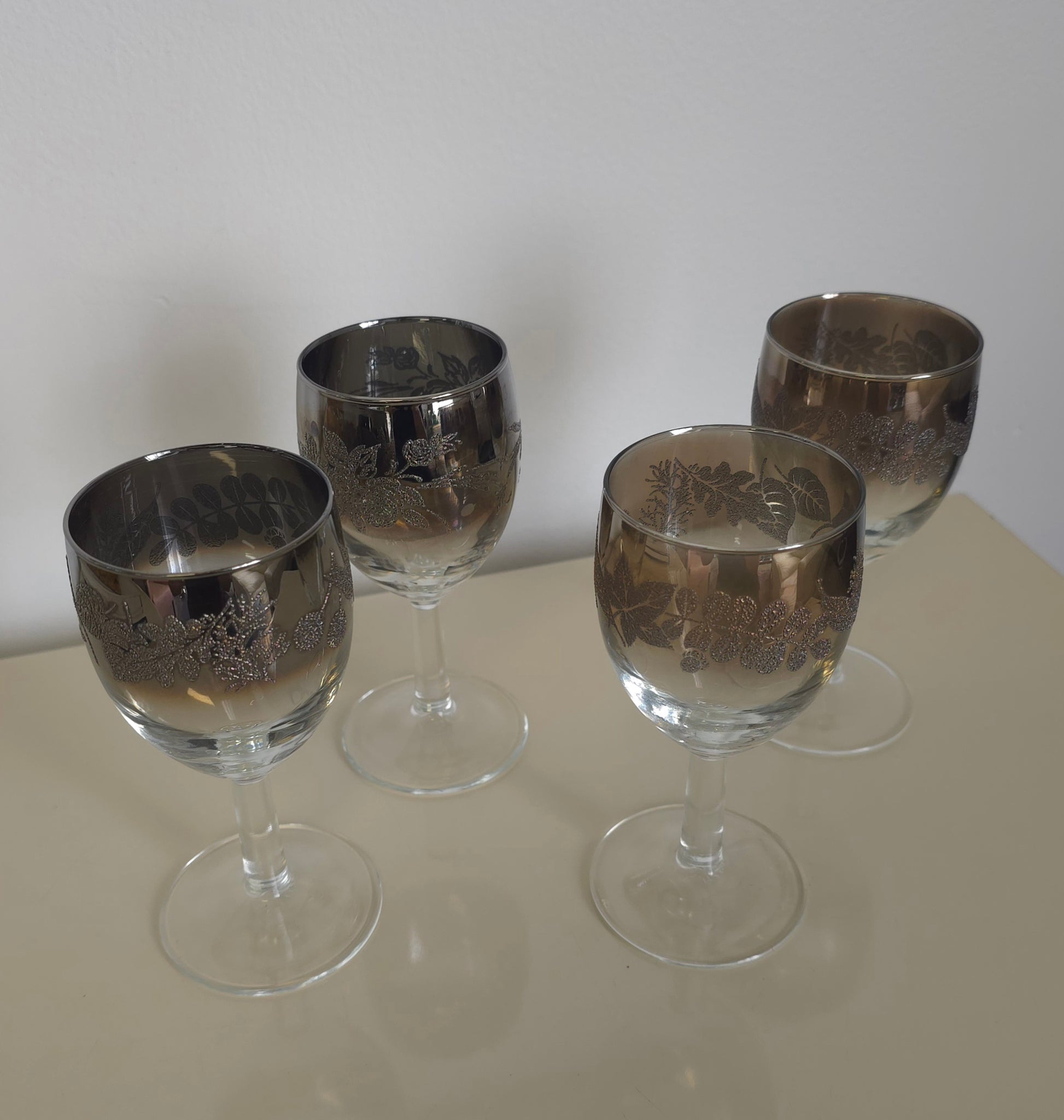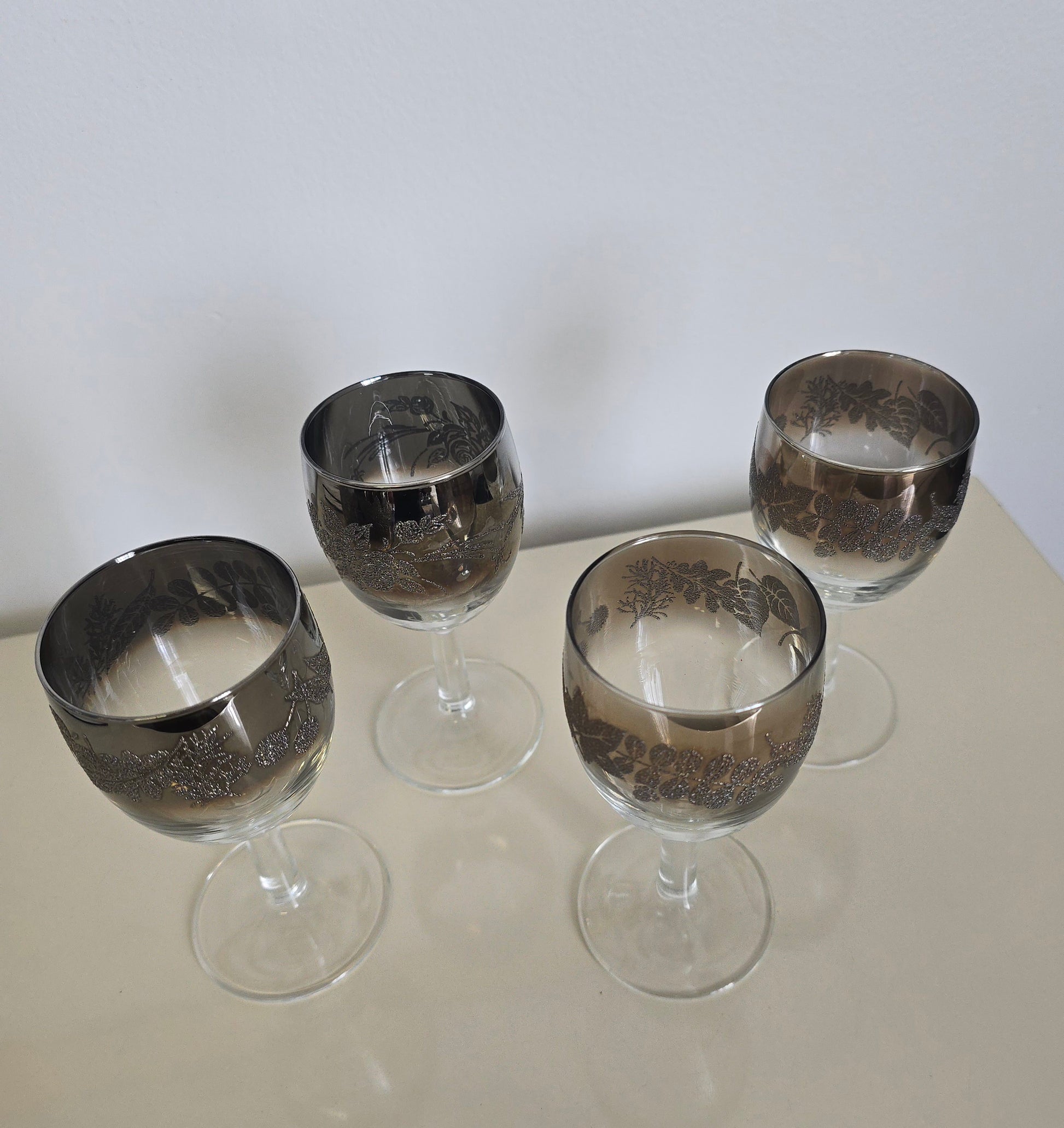 A set of Thorothy Thorpe 1960s midcentury modern Glassware. The set includes four glasses. There's a gorgeous silver detailing on the rims of the glasses. The silver detailing features floral motifs which are raised above from the silver of the rim. In good condition with minor patina on the silver rims, no chips or cracks on glass are present.