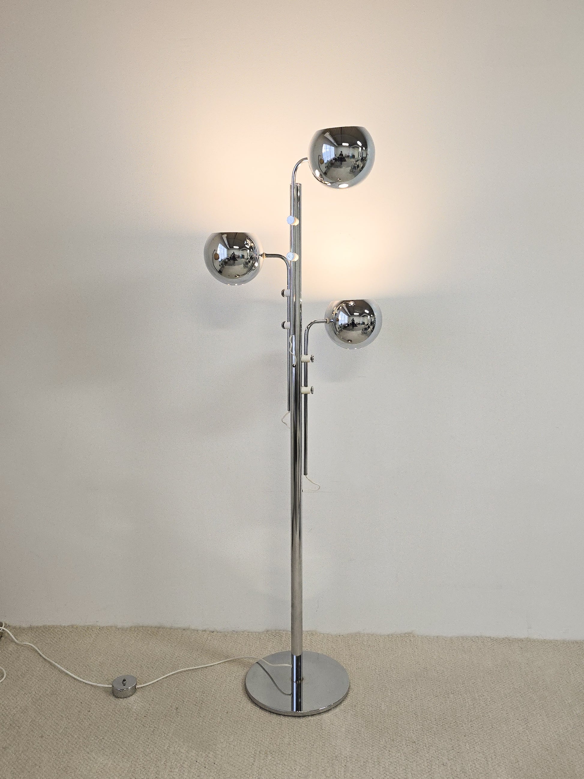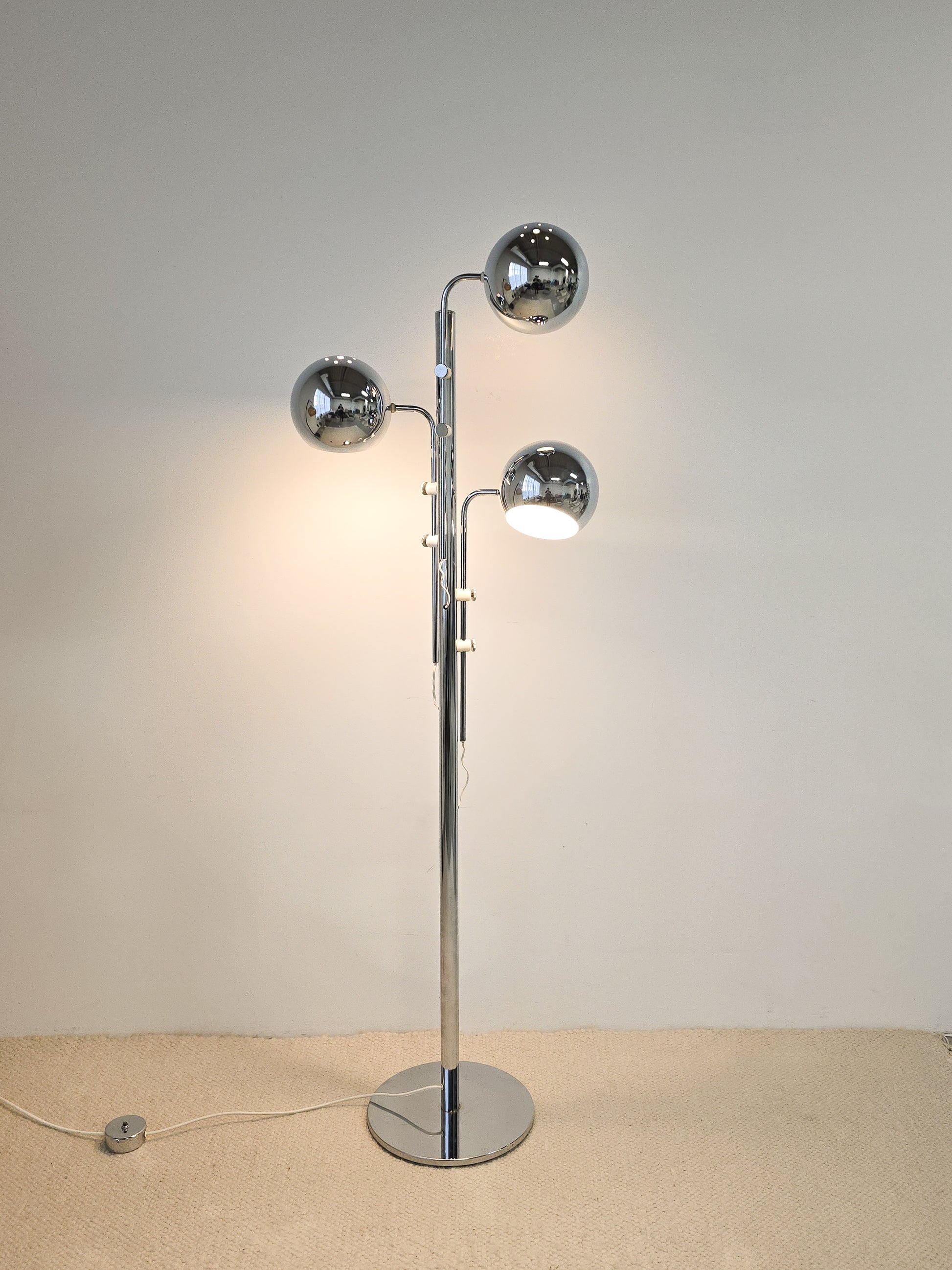 Stunning 1970s three tier chrome floor lamp with adjustable arms. This lamp has a chrome body and features three arms which are adjustable. Each arm has two placement which can be loosened to adjust. The arms can be lowered or heightened to the desired position. Very unique floor lamp that would compliment any style of interiors. In overall great condition. Some signs of wear present. It has a good weight to it and is very sturdy.