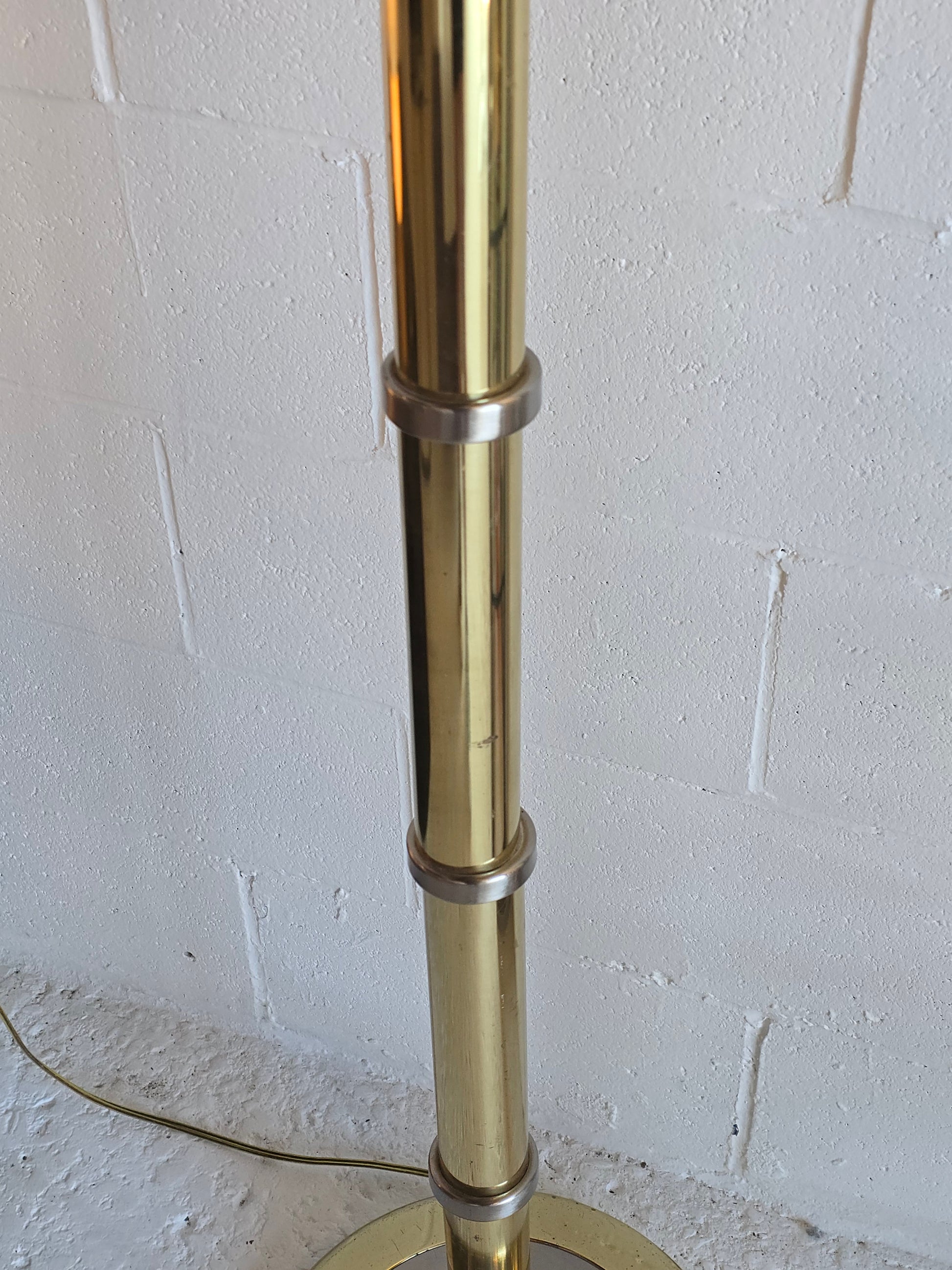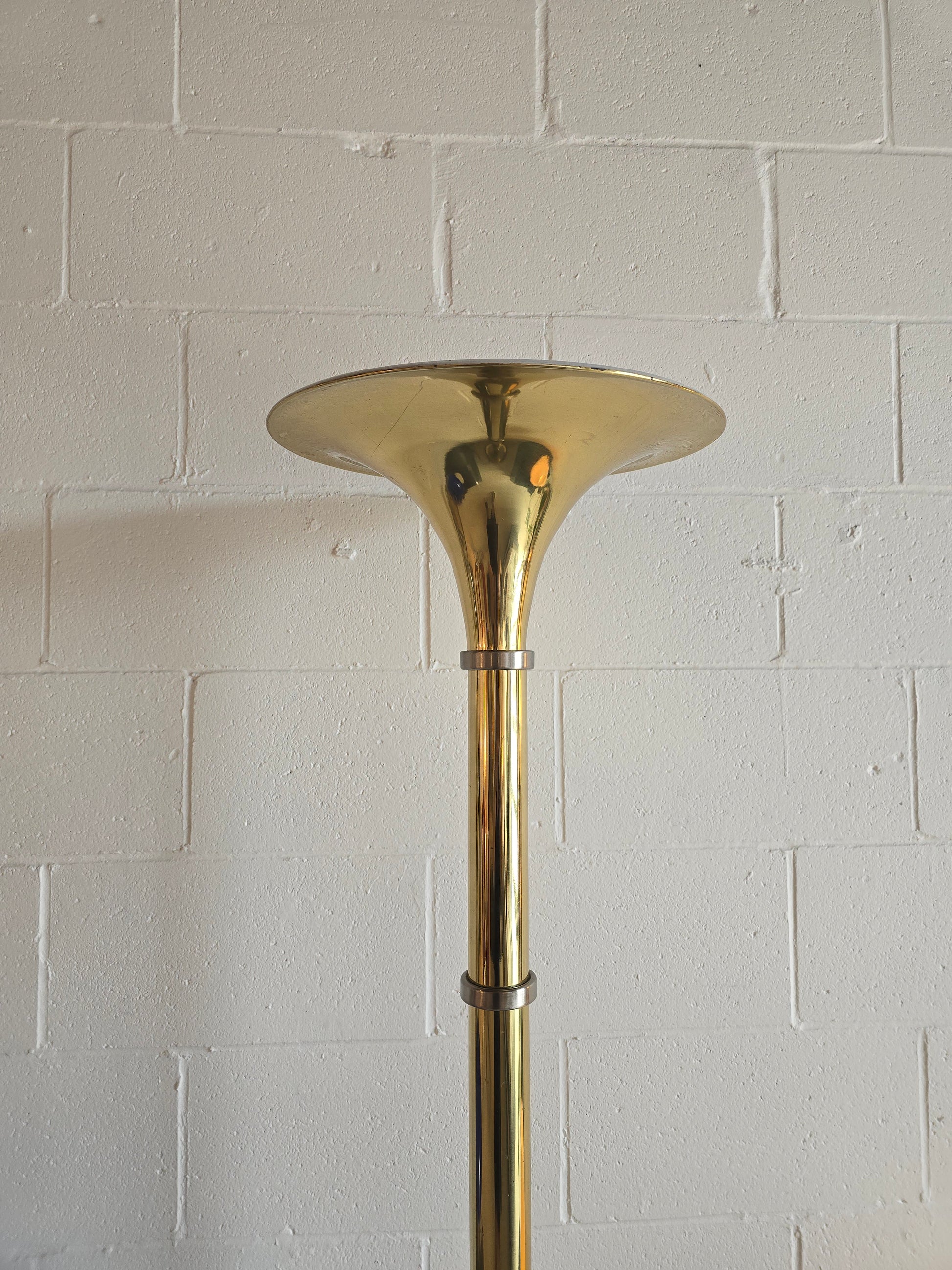 Lovely torchiere style brass floor lamp featuring chrome detailing throughout. In overall good condition with some signs of wear.