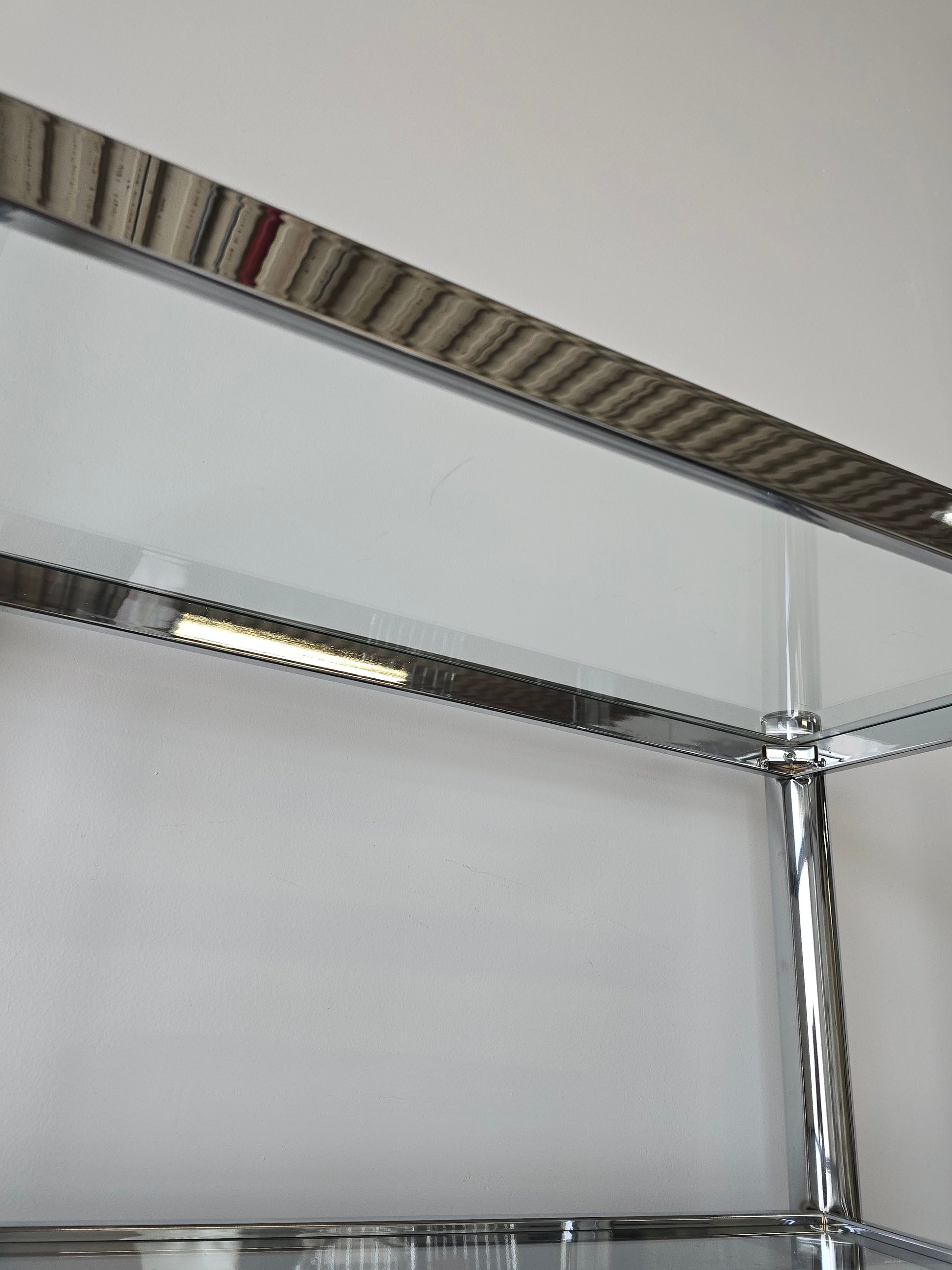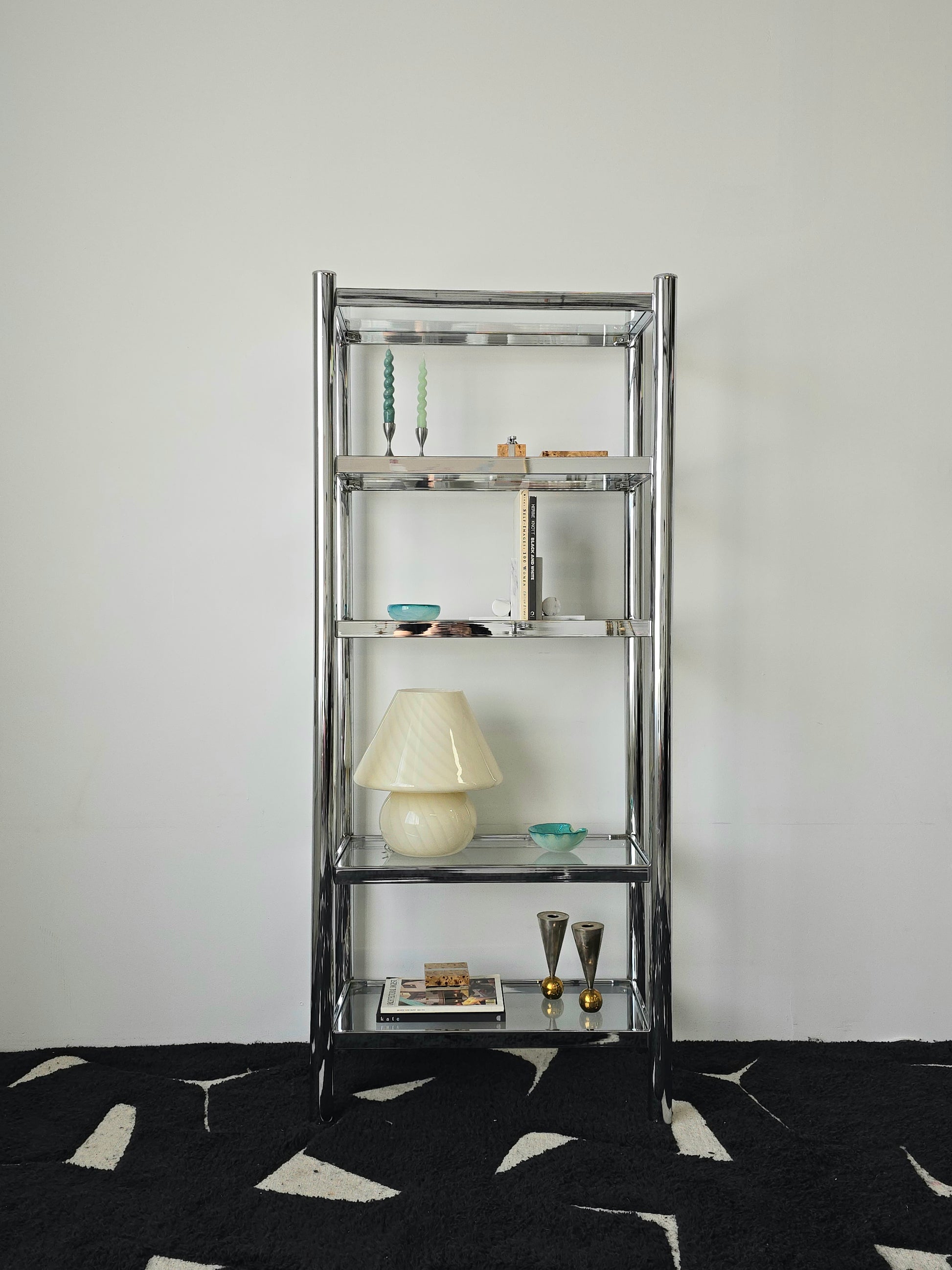 Super cool 1970s tubular polished chrome and clear glass shelving unit. It has a polished chrome frame with five clear glass shelves. The chrome frame has tubular legs. This simple yet functional design would be the perfect piece to display books,decor, and more.