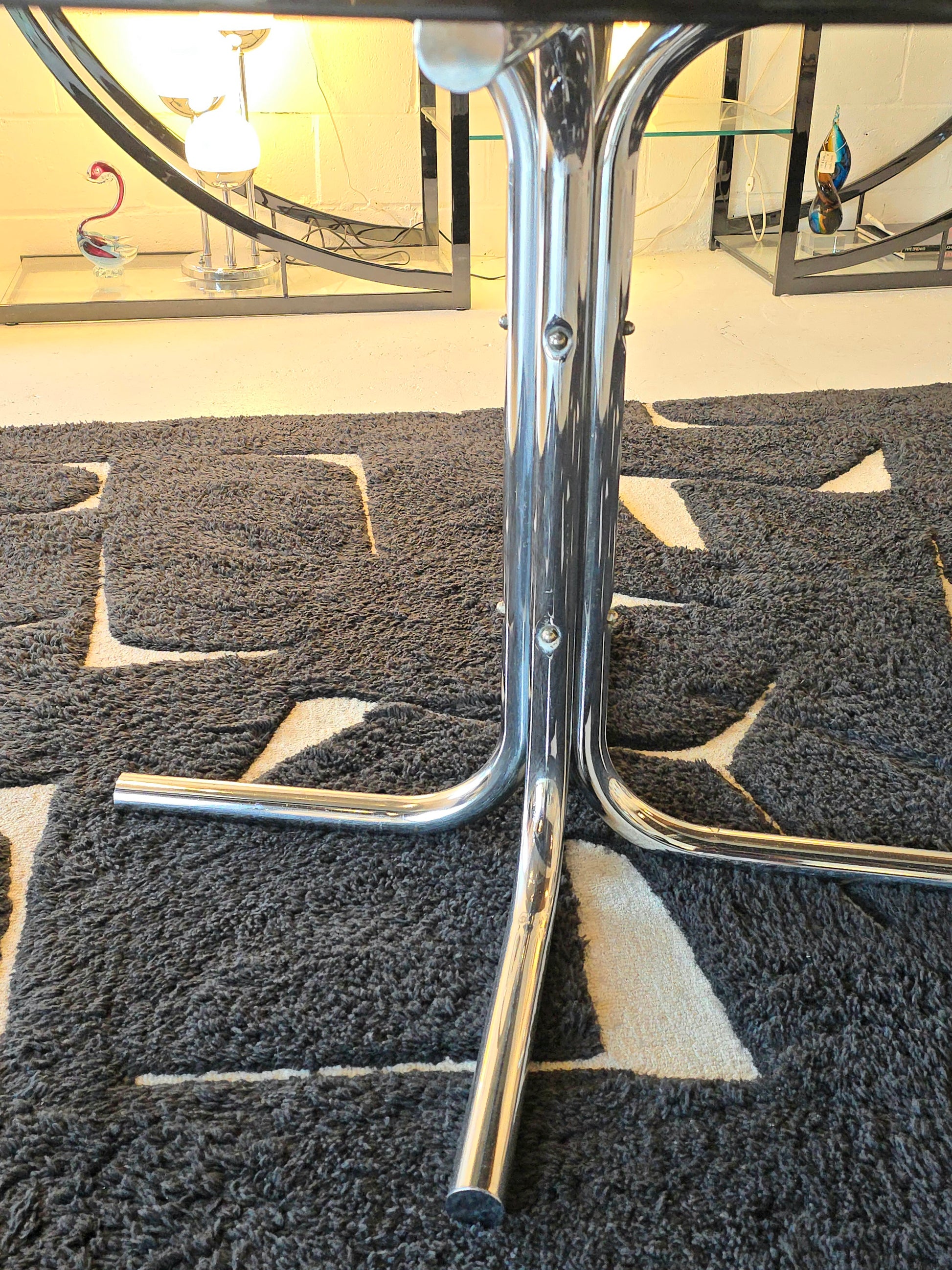 Chrome and tinted glass dining table. This dining table features a tubular chrome base with four legs and a dark tinted glass top. In great vintage condition with some signs of wear such as light scratches on the glass top and patina may be present on the chrome base.