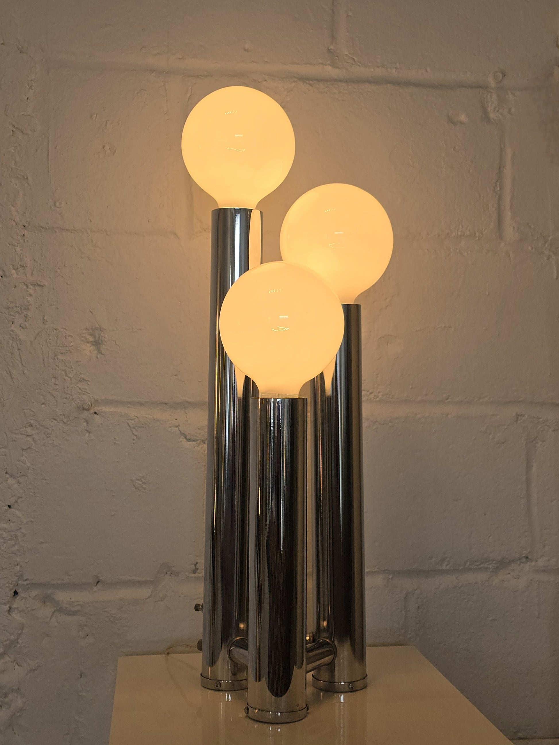 1970s Three tier tubular chrome table lamp. It has a chrome base with three large bulbs. This table lamp features three tiers in varying heights. It has a three mode switch. It emits a warm and soft light, which creates a cozy atmosphere.