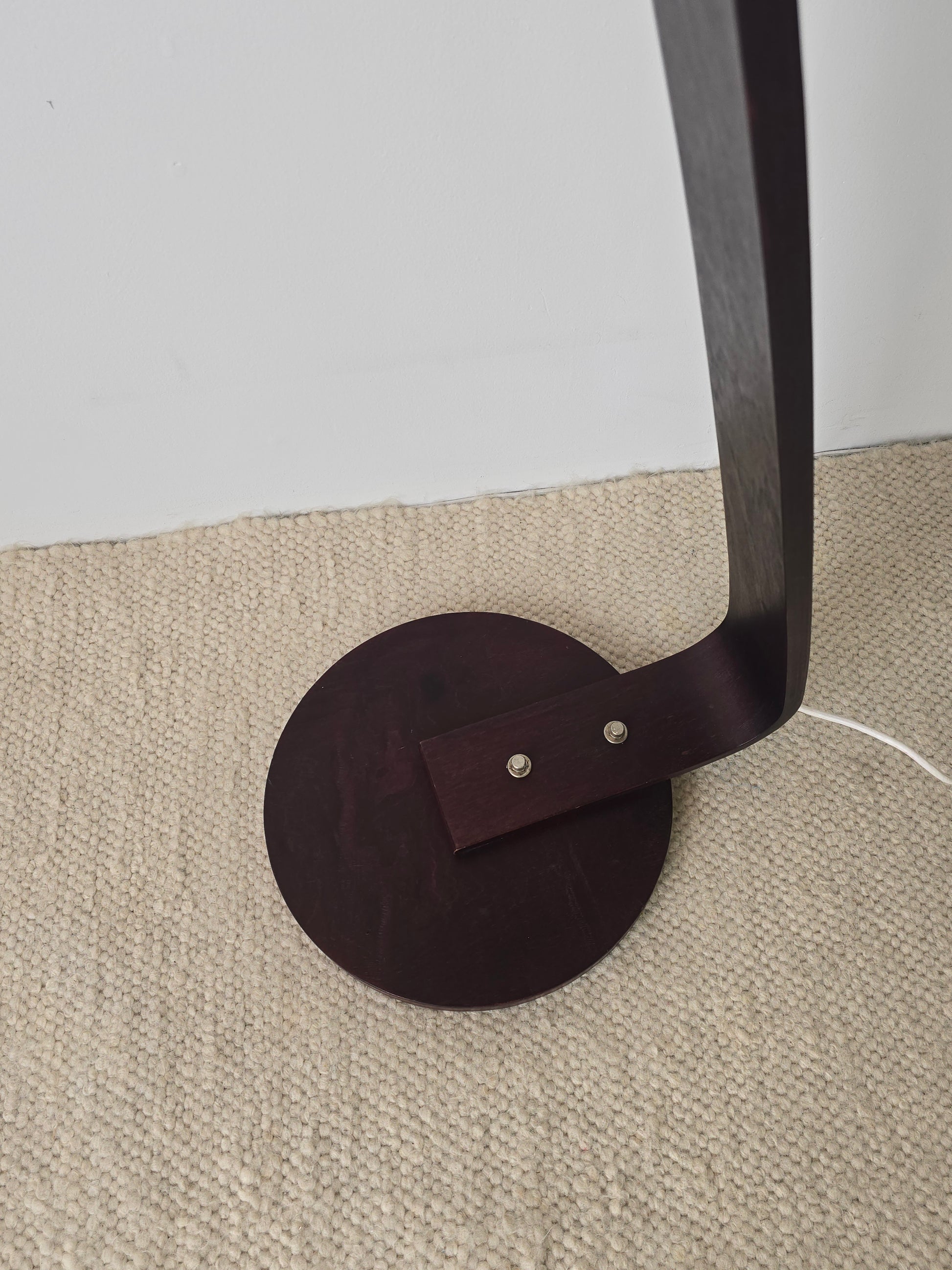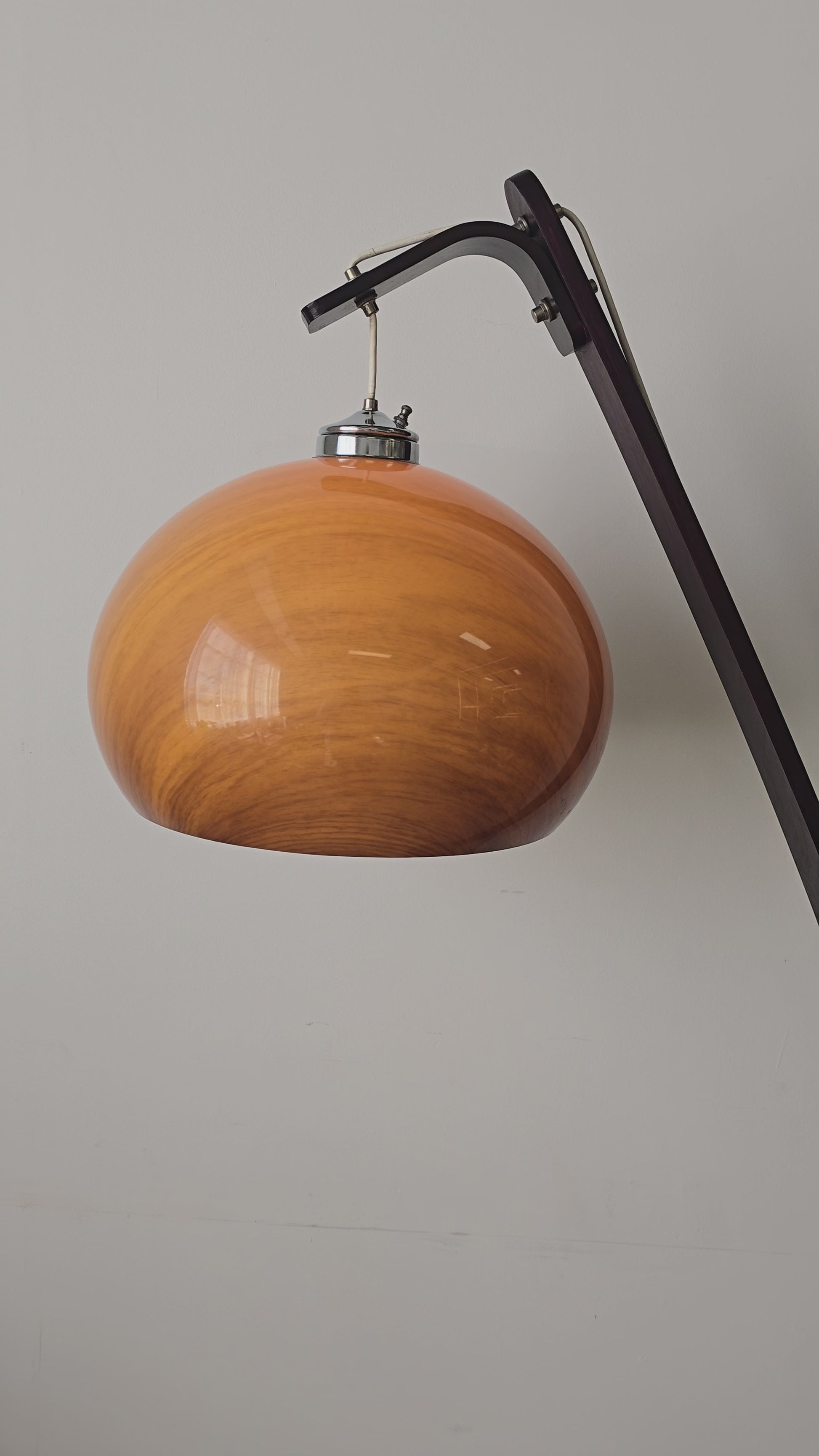 Gorgeous vintage arc floor lamp with a wooden base in dark brown/mahogany stain and an acrylic lamp shade. In excellent vintage condition with some minor signs of wear.