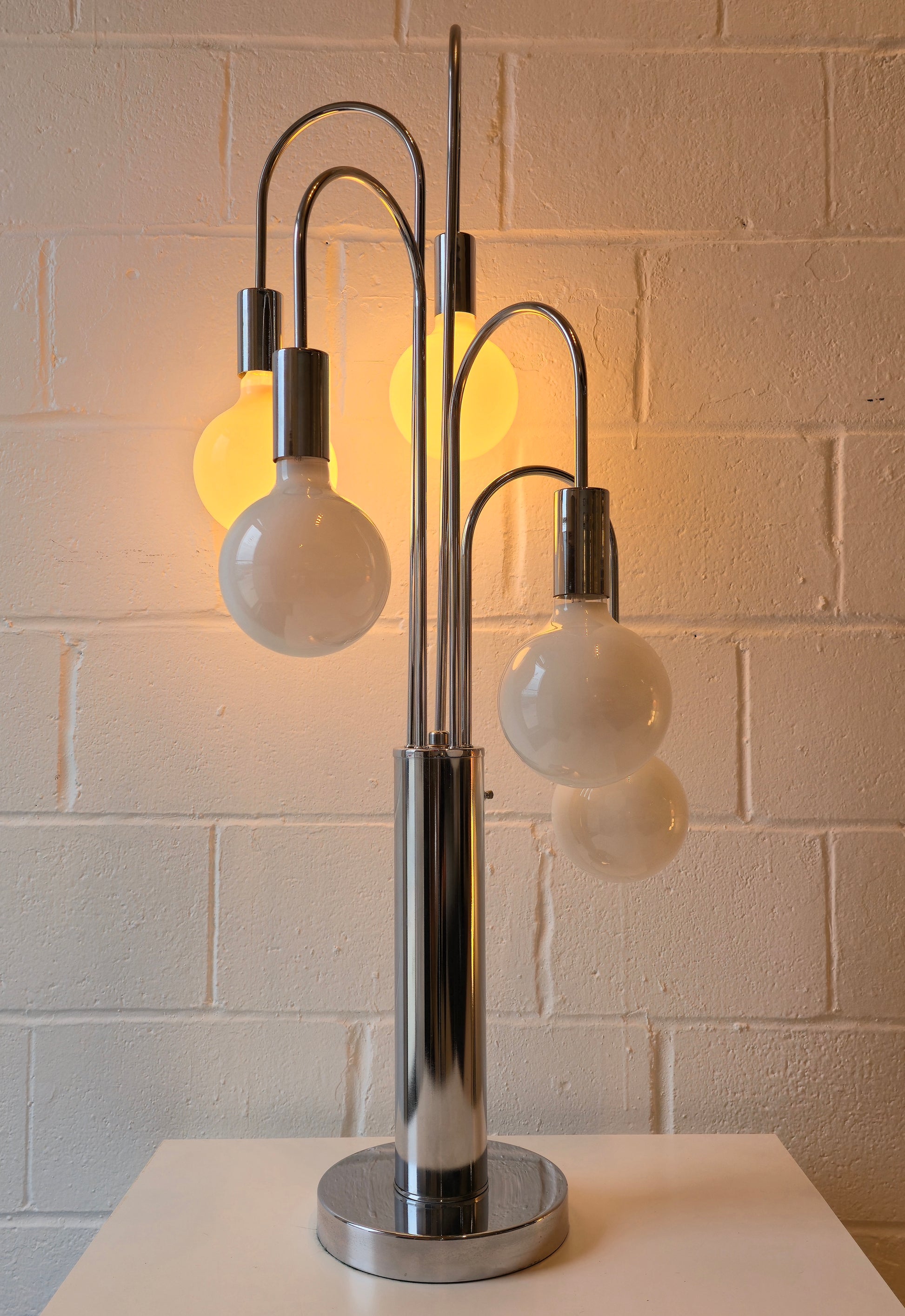 Amazing waterfall chrome lamp attributed to Robert Sonneman. This stunning lamp has five arms in the waterfall style form featuring G40 bulbs (bulbs are included). It's very tall, so it can be used as a large table lamp or a low floor lamp. In excellent vintage condition with minor signs of wear/patina. Newly polished. Styled on a travertine pedestal, which is also available to purchase separately.
